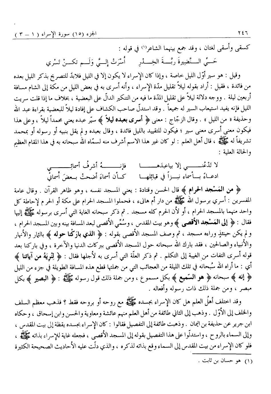 وَقِيلَ: هُوَ سَيْرُ أَوَّلِ اللَّيْلِ خَاصَّةً، وَإِذَا كَانَ الْإِسْرَاءُ لَا يَكُونُ إِلَّا فِي اللَّيْلِ فَلَا بُدَّ لِلتَّصْرِيحِ بِذِكْرِ اللَّيْلِ بَعْدَهُ مِنْ فَائِدَةٍ، فَقِيلَ: أَرَادَ بِقَوْلِهِ لَيْلًا تَقْلِيلَ مُدَّةِ الْإِسْرَاءِ، وَأَنَّهُ أَسْرَى بِهِ فِي بَعْضِ اللَّيْلِ مِنْ مَكَّةَ إِلَى الشَّامِ مَسَافَةَ أَرْبَعِينَ لَيْلَةً. وَوَجْهُ دَلَالَةِ لَيْلًا عَلَى تَقْلِيلِ الْمُدَّةِ مَا فِيهِ مِنَ التَّنْكِيرِ الدَّالِّ عَلَى الْبَعْضِيَّةِ، بِخِلَافِ مَا إِذَا قُلْتَ سَرَيْتُ اللَّيْلَ فَإِنَّهُ يُفِيدُ اسْتِيعَابَ السَّيْرِ لَهُ جَمِيعًا. وَقَدِ اسْتَدَلَّ صَاحِبُ الْكَشَّافِ عَلَى إِفَادَةِ لَيْلًا لِلْبَعْضِيَّةِ بِقِرَاءَةِ عَبْدِ اللَّهِ وَحُذَيْفَةَ «مِنَ اللَّيْلِ» . وَقَالَ الزَّجَّاجُ: مَعْنَى أَسْرى بِعَبْدِهِ لَيْلًا سَيَّرَ عَبْدَهُ يَعْنِي مُحَمَّدًا لَيْلًا، وَعَلَى هَذَا فَيَكُونُ مَعْنَى أَسْرَى مَعْنَى سَيَّرَ فَيَكُونُ لِلتَّقْيِيدِ بِاللَّيْلِ فَائِدَةٌ، وَقَالَ بِعَبْدِهِ وَلَمْ يَقُلْ بِنَبِيِّهِ أَوْ رَسُولِهِ أَوْ بِمُحَمَّدٍ تَشْرِيفًا لَهُ صَلَّى اللَّهُ عَلَيْهِ وَسَلَّمَ، قَالَ أَهْلُ الْعِلْمِ: لَوْ كَانَ غَيْرُ هَذَا الِاسْمِ أَشْرَفَ مِنْهُ لَسَمَّاهُ اللَّهُ سُبْحَانَهُ بِهِ فِي هَذَا الْمَقَامِ الْعَظِيمِ وَالْحَالَةِ الْعَلِيَّةِ:
