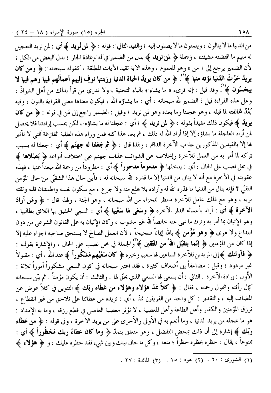الْأَوَّلُ: إِرَادَةُ الْآخِرَةِ. الثَّانِي: أَنْ يَسْعَى لَهَا السَّعْيَ الَّذِي يَحِقُّ لَهَا. وَالثَّالِثُ: أَنْ يَكُونَ مُؤْمِنًا. ثُمَّ بَيَّنَ سُبْحَانَهُ كَمَالَ رَأْفَتِهِ وَشُمُولَ رَحْمَتِهِ، فَقَالَ: كُلًّا نُمِدُّ هؤُلاءِ وَهَؤُلاءِ مِنْ عَطاءِ رَبِّكَ التَّنْوِينُ فِي كُلًّا عِوَضٌ عَنِ الْمُضَافِ إِلَيْهِ، وَالتَّقْدِيرُ: كُلُّ وَاحِدٍ مِنَ الْفَرِيقَيْنِ نُمِدُّ، أَيْ: نَزِيدُهُ مِنْ عَطَائِنَا عَلَى تَلَاحُقٍ مِنْ غَيْرِ انْقِطَاعٍ، نَرْزُقُ الْمُؤْمِنِينَ وَالْكُفَّارَ وَأَهْلَ الطَّاعَةِ وَأَهْلَ الْمَعْصِيَةِ، لَا تُؤَثِّرُ مَعْصِيَةُ الْعَاصِي فِي قَطْعِ رِزْقِهِ، وَمَا بِهِ الْإِمْدَادُ: