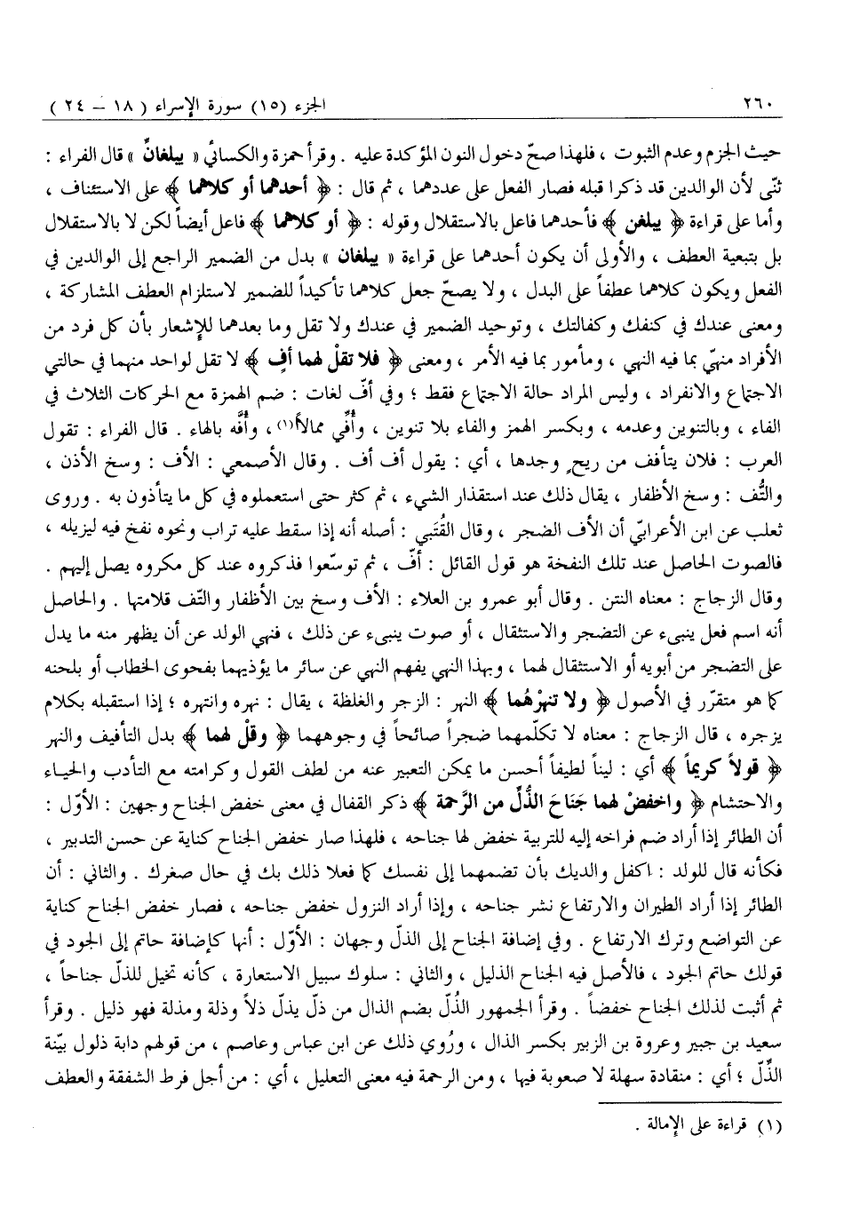وَقَالَ الزَّجَّاجُ: مَعْنَاهُ النَّتَنُ. وَقَالَ أَبُو عَمْرِو بْنُ العلاء: الأف وسخ بين الأظفار والتّف قُلَامَتُهَا. وَالْحَاصِلُ أَنَّهُ اسْمُ فِعْلٍ يُنْبِئُ عَنِ التَّضَجُّرِ وَالِاسْتِثْقَالِ، أَوْ صَوْتٌ يُنْبِئُ عَنْ ذَلِكَ، فَنُهِيَ الْوَلَدُ عَنْ أَنْ يَظْهَرَ مِنْهُ مَا يَدُلُّ عَلَى التَّضَجُّرِ مِنْ أَبَوَيْهِ أَوِ الِاسْتِثْقَالِ لَهُمَا، وَبِهَذَا النَّهْيِ يُفْهَمُ النَّهْيُ عَنْ سَائِرِ مَا يُؤْذِيهِمَا بِفَحْوَى الْخِطَابِ أَوْ بِلَحْنِهِ كَمَا هُوَ مُتَقَرِّرٌ فِي الْأُصُولِ وَلا تَنْهَرْهُما النَّهْرُ: الزَّجْرُ وَالْغِلْظَةُ، يُقَالُ: نَهَرَهُ وَانْتَهَرَهُ إِذَا اسْتَقْبَلَهُ بِكَلَامٍ يَزْجُرُهُ، قَالَ الزَّجَّاجُ: مَعْنَاهُ لَا تُكَلِّمْهُمَا ضَجِرًا صَائِحًا فِي وُجُوهِهِمَا وَقُلْ لَهُما بَدَلَ التَّأْفِيفِ وَالنَّهْرِ قَوْلًا كَرِيماً أَيْ: لَيِّنًا لَطِيفًا أَحْسَنَ مَا يُمْكِنُ التَّعْبِيرُ عَنْهُ مِنْ لُطْفِ الْقَوْلِ وَكَرَامَتِهِ مَعَ التَّأَدُّبِ وَالْحَيَاءِ وَالِاحْتِشَامِ وَاخْفِضْ لَهُما جَناحَ الذُّلِّ مِنَ الرَّحْمَةِ ذَكَرَ الْقَفَّالُ فِي مَعْنَى خَفْضِ الْجَنَاحِ وَجْهَيْنِ: الْأَوَّلُ: