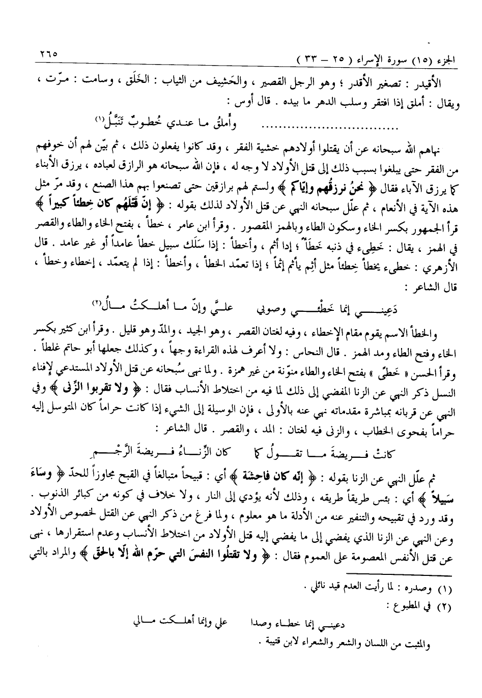 نَهَاهُمُ اللَّهُ سُبْحَانَهُ عَنْ أَنْ يَقْتُلُوا أَوْلَادَهُمْ خَشْيَةَ الْفَقْرِ، وَقَدْ كَانُوا يَفْعَلُونَ ذَلِكَ، ثُمَّ بَيَّنَ لَهُمْ أَنَّ خَوْفَهُمْ مِنَ الْفَقْرِ حَتَّى يَبْلُغُوا بِسَبَبِ ذَلِكَ إِلَى قَتْلِ الْأَوْلَادِ لَا وَجْهَ لَهُ، فَإِنَّ اللَّهَ سُبْحَانَهُ هُوَ الرَّازِقُ لِعِبَادِهِ، يَرْزُقُ الْأَبْنَاءَ كَمَا يَرْزُقُ الْآبَاءَ فَقَالَ نَحْنُ نَرْزُقُهُمْ وَإِيَّاكُمْ وَلَسْتُمْ لَهُمْ بِرَازِقِينَ حَتَّى تَصْنَعُوا بِهِمْ هَذَا الصُّنْعَ، وَقَدْ مَرَّ مِثْلُ هَذِهِ الْآيَةِ فِي الْأَنْعَامِ، ثُمَّ عَلَّلَ سُبْحَانَهُ النَّهْيَ عَنْ قَتْلِ الْأَوْلَادِ لِذَلِكَ بِقَوْلِهِ: إِنَّ قَتْلَهُمْ كانَ خِطْأً كَبِيراً قَرَأَ الْجُمْهُورُ بِكَسْرِ الْخَاءِ وَسُكُونِ الطَّاءِ وَبِالْهَمْزِ الْمَقْصُورِ. وَقَرَأَ ابْنُ عَامِرٍ، خَطَأً، بِفَتْحِ الخاء والطاء والقصر في الهمز، يقال: خطىء في ذنبه خطأ إدا أَثِمَ، وَأَخْطَأَ: إِذَا سَلَكَ سَبِيلَ خَطَأٍ عَامِدًا أو غير عامد. قال الأزهري: خطىء يخطأ خِطَئًا مِثْلُ أَثِمَ يَأْثَمُ إِثْمًا إِذَا تَعَمَّدَ الخطأ، وأخطأ: إذا لم يتعمّد، إخطاء وخطأ، قال الشاعر: