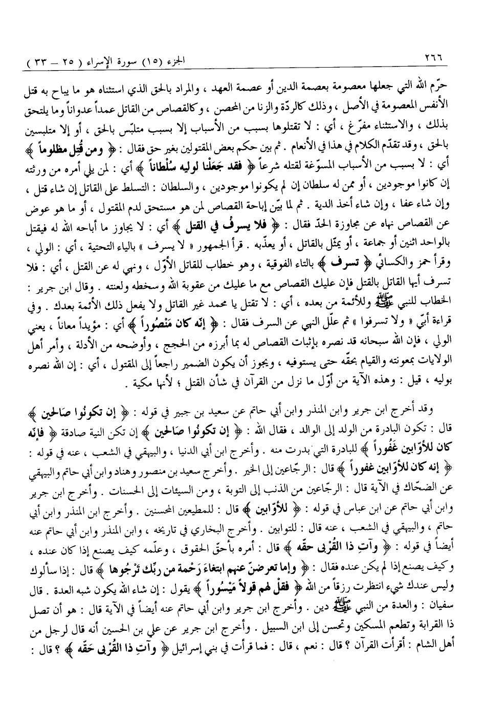 الْخِطَابُ لِلنَّبِيِّ صَلَّى اللَّهُ عَلَيْهِ وَسَلَّمَ وَلِلْأَئِمَّةِ مِنْ بَعْدِهِ، أَيْ: لَا تَقْتُلْ يَا مُحَمَّدُ غَيْرَ الْقَاتِلِ وَلَا يَفْعَلْ ذَلِكَ الْأَئِمَّةُ بَعْدَكَ. وَفِي قِرَاءَةِ أُبَيٍّ «وَلَا تُسْرِفُوا» ثُمَّ عَلَّلَ النَّهْيَ عَنِ السَّرَفِ فَقَالَ: إِنَّهُ كانَ مَنْصُوراً أَيْ: مُؤَيَّدًا مُعَانًا، يَعْنِي الْوَلِيَّ، فَإِنَّ اللَّهَ سُبْحَانَهُ قَدْ نَصَرَهُ بِإِثْبَاتِ الْقِصَاصِ لَهُ بِمَا أَبْرَزَهُ مِنَ الْحُجَجِ، وَأَوْضَحَهُ مِنَ الْأَدِلَّةِ، وَأَمَرَ أَهْلَ الْوِلَايَاتِ بِمَعُونَتِهِ وَالْقِيَامِ بِحَقِّهِ حَتَّى يَسْتَوْفِيَهُ، وَيَجُوزُ أَنْ يَكُونَ الضَّمِيرُ رَاجِعًا إِلَى الْمَقْتُولِ، أَيْ: إِنَّ اللَّهَ نَصَرَهُ بِوَلِيِّهِ، قِيلَ: وَهَذِهِ الْآيَةُ مِنْ أَوَّلِ مَا نَزَلَ مِنَ الْقُرْآنِ فِي شَأْنِ الْقَتْلِ لِأَنَّهَا مَكِّيَّةٌ.