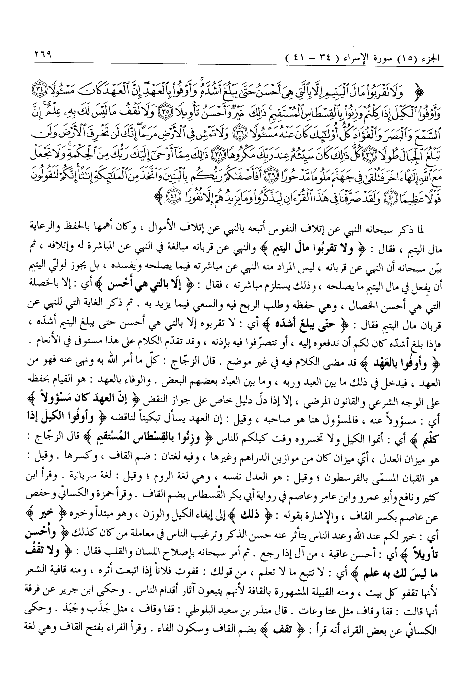 وَلا تَقْرَبُوا مالَ الْيَتِيمِ إِلاَّ بِالَّتِي هِيَ أَحْسَنُ حَتَّى يَبْلُغَ أَشُدَّهُ وَأَوْفُوا بِالْعَهْدِ إِنَّ الْعَهْدَ كانَ مَسْؤُلاً (34) وَأَوْفُوا الْكَيْلَ إِذا كِلْتُمْ وَزِنُوا بِالْقِسْطاسِ الْمُسْتَقِيمِ ذلِكَ خَيْرٌ وَأَحْسَنُ تَأْوِيلاً (35) وَلا تَقْفُ مَا لَيْسَ لَكَ بِهِ عِلْمٌ إِنَّ السَّمْعَ وَالْبَصَرَ وَالْفُؤادَ كُلُّ أُولئِكَ كانَ عَنْهُ مَسْؤُلاً (36) وَلا تَمْشِ فِي الْأَرْضِ مَرَحاً إِنَّكَ لَنْ تَخْرِقَ الْأَرْضَ وَلَنْ تَبْلُغَ الْجِبالَ طُولاً (37) كُلُّ ذلِكَ كانَ سَيِّئُهُ عِنْدَ رَبِّكَ مَكْرُوهاً (38)