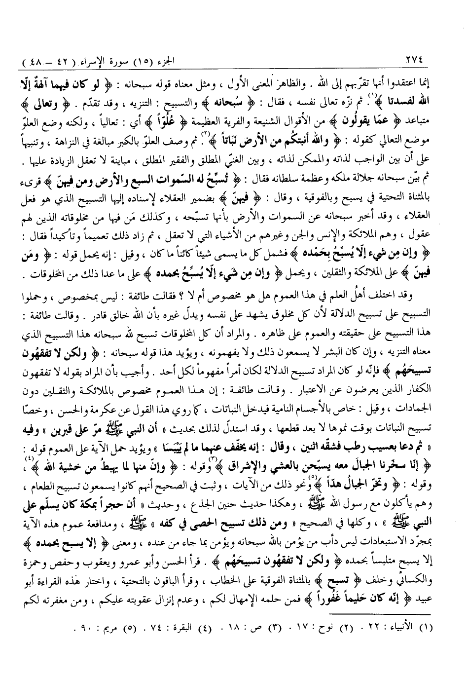 هَذَا التَّسْبِيحُ عَلَى حَقِيقَتِهِ وَالْعُمُومُ عَلَى ظَاهِرِهِ. وَالْمُرَادُ أَنَّ كُلَّ الْمَخْلُوقَاتِ تُسَبِّحُ لِلَّهِ سُبْحَانَهُ هَذَا التَّسْبِيحُ الَّذِي مَعْنَاهُ التَّنْزِيهُ، وَإِنْ كَانَ الْبَشَرُ لَا يَسْمَعُونَ ذَلِكَ وَلَا يَفْهَمُونَهُ، وَيُؤَيِّدُ هَذَا قَوْلُهُ سُبْحَانَهُ: وَلكِنْ لَا تَفْقَهُونَ تَسْبِيحَهُمْ فَإِنَّهُ لَوْ كَانَ الْمُرَادُ تَسْبِيحَ الدَّلَالَةِ لَكَانَ أَمْرًا مَفْهُومًا لِكُلِّ أَحَدٍ. وَأُجِيبُ بِأَنَّ الْمُرَادَ بِقَوْلِهِ لَا تَفْقَهُونَ الْكُفَّارُ الَّذِينَ يُعْرِضُونَ عَنِ الِاعْتِبَارِ. وَقَالَتْ طَائِفَةٌ: إِنَّ هَذَا الْعُمُومَ مَخْصُوصٌ بِالْمَلَائِكَةِ وَالثَّقَلَيْنِ دُونَ الْجَمَادَاتِ، وَقِيلَ: خَاصٌّ بِالْأَجْسَامِ النَّامِيَةِ فَيَدْخُلُ النَّبَاتَاتُ، كَمَا رُوِيَ هَذَا الْقَوْلُ عن عكرمة والحسن، وخصّا تَسْبِيحَ النَّبَاتَاتِ بِوَقْتِ نُمُوِّهَا لَا بَعْدَ قَطْعِهَا، وَقَدِ اسْتُدِلَّ لِذَلِكَ بِحَدِيثِ «أَنَّ النَّبِيَّ صَلَّى اللَّهُ عَلَيْهِ وَسَلَّمَ مَرَّ عَلَى قَبْرَيْنِ» وَفِيهِ «ثُمَّ دَعَا بِعَسِيبٍ رَطْبٍ فَشَقَّهُ اثْنَيْنِ، وَقَالَ: إِنَّهُ يُخَفَّفُ عَنْهُمَا مَا لَمْ يَيْبَسَا» وَيُؤَيِّدُ حَمْلَ الْآيَةِ عَلَى الْعُمُومِ قَوْلُهُ: