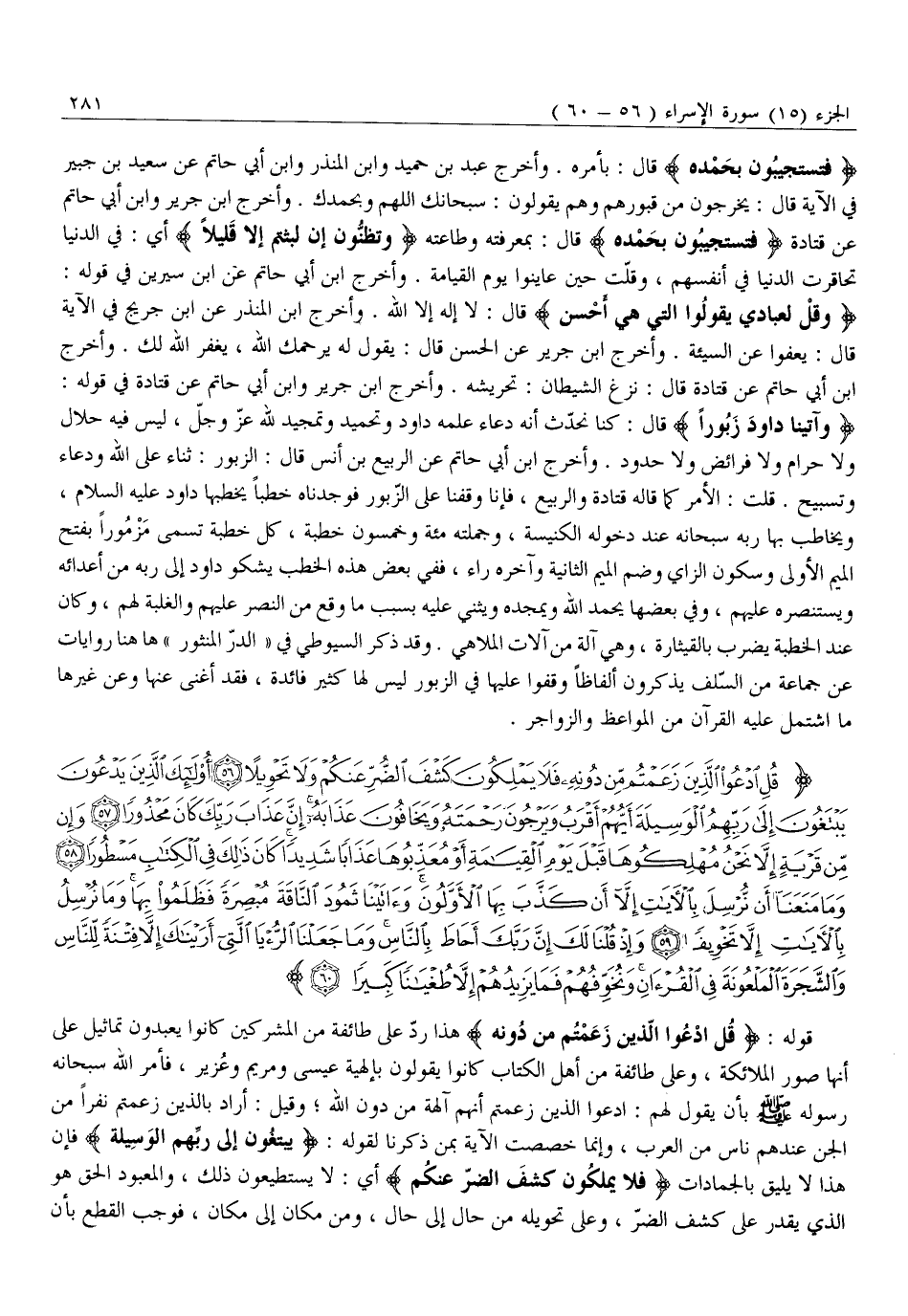 فَتَسْتَجِيبُونَ بِحَمْدِهِ قَالَ: بِأَمْرِهِ. وَأَخْرَجَ عَبْدُ بْنُ حُمَيْدٍ وَابْنُ الْمُنْذِرِ وَابْنُ أَبِي حَاتِمٍ عَنْ سَعِيدِ بْنِ جُبَيْرٍ فِي الْآيَةِ قَالَ: يَخْرُجُونَ مِنْ قُبُورِهِمْ وَهُمْ يَقُولُونَ: سُبْحَانَكَ اللَّهُمَّ وَبِحَمْدِكَ. وَأَخْرَجَ ابْنُ جَرِيرٍ وَابْنُ أَبِي حَاتِمٍ عَنِ قَتَادَةَ فَتَسْتَجِيبُونَ بِحَمْدِهِ قَالَ: بِمَعْرِفَتِهِ وَطَاعَتِهِ وَتَظُنُّونَ إِنْ لَبِثْتُمْ إِلَّا قَلِيلًا أَيْ: فِي الدُّنْيَا تَحَاقَرَتِ الدُّنْيَا فِي أَنْفُسِهِمْ، وَقَلَّتْ حِينَ عَايَنُوا يَوْمَ الْقِيَامَةِ. وَأَخْرَجَ ابْنُ أَبِي حَاتِمٍ عَنِ ابْنِ سِيرِينَ فِي قَوْلِهِ: