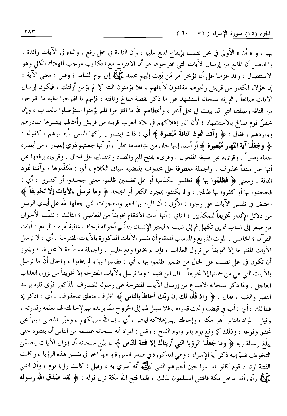 فَجَحَدُوا بِهَا أَوْ كَفَرُوا بِهَا ظَالِمِينَ، وَلَمْ يَكْتَفُوا بِمُجَرَّدِ الْكُفْرِ أَوِ الْجَحْدِ وَما نُرْسِلُ بِالْآياتِ إِلَّا تَخْوِيفاً اخْتُلِفَ فِي تَفْسِيرِ الْآيَاتِ عَلَى وُجُوهٍ: الْأَوَّلُ: أَنَّ الْمُرَادَ بِهَا الْعِبَرُ وَالْمُعْجِزَاتُ الَّتِي جَعَلَهَا اللَّهُ عَلَى أَيْدِي الرُّسُلِ مِنْ دَلَائِلِ الْإِنْذَارِ تَخْوِيفًا لِلْمُكَذِّبِينَ الثَّانِي: أَنَّهَا آيَاتُ الِانْتِقَامِ تَخْوِيفًا مِنَ الْمَعَاصِي الثَّالِثُ: تَقَلُّبُ الْأَحْوَالِ مِنْ صِغَرٍ إِلَى شَبَابٍ ثُمَّ إِلَى تَكَهُّلٍ ثُمَّ إِلَى شَيْبٍ لِيَعْتَبِرَ الْإِنْسَانُ بِتَقَلُّبِ أَحْوَالِهِ فَيَخَافُ عَاقِبَةَ أَمْرِهِ الرَّابِعُ: آيَاتُ الْقُرْآنِ الْخَامِسُ: الْمَوْتُ الذَّرِيعُ وَالْمُنَاسِبُ لِلْمَقَامِ أَنْ تُفَسَّرَ الْآيَاتُ الْمَذْكُورَةُ بِالْآيَاتِ الْمُقْتَرَحَةِ، أَيْ: لَا نُرْسِلُ الْآيَاتِ الْمُقْتَرَحَةَ إِلَّا تَخْوِيفًا مِنْ نُزُولِ الْعَذَابِ، فَإِنْ لَمْ يَخَافُوا وَقَعَ عَلَيْهِمْ. وَالْجُمْلَةُ مُسْتَأْنَفَةٌ لَا مَحَلَّ لَهَا وَيَجُوزُ أَنْ تَكُونَ فِي مَحَلِّ نَصْبٍ عَلَى الْحَالِ مِنْ ضَمِيرِ ظَلَمُوا بِهَا، أَيْ: فَظَلَمُوا بِهَا وَلَمْ يَخَافُوا، وَالْحَالُ أَنَّ مَا نُرْسِلُ بِالْآيَاتِ الَّتِي هِيَ مِنْ جُمْلَتِهَا إِلَّا تَخْوِيفًا. قَالَ ابْنُ قُتَيْبَةَ: وَمَا نُرْسِلُ بِالْآيَاتِ الْمُقْتَرَحَةِ إِلَّا تَخْوِيفًا مِنْ نُزُولِ الْعَذَابِ الْعَاجِلِ. وَلَمَّا ذَكَرَ سُبْحَانَهُ الِامْتِنَاعَ مِنْ إِرْسَالِ الْآيَاتِ الْمُقْتَرَحَةِ عَلَى رَسُولِهِ لِلصَّارِفِ الْمَذْكُورِ قَوَّى قَلْبَهُ بِوَعْدِ النَّصْرِ وَالْغَلَبَةِ، فَقَالَ: وَإِذْ قُلْنا لَكَ إِنَّ رَبَّكَ أَحاطَ بِالنَّاسِ الظَّرْفُ مُتَعَلِّقٌ بِمَحْذُوفٍ، أَيِ: اذْكُرْ إِذْ قُلْنَا لَكَ، أَيْ: أَنَّهُمْ فِي قَبْضَتِهِ وَتَحْتَ قُدْرَتِهِ، فَلَا سَبِيلَ لَهُمْ إِلَى الْخُرُوجِ مِمَّا يُرِيدُهُ بِهِمْ لِإِحَاطَتِهِ لَهُمْ بِعِلْمِهِ وَقُدْرَتِهِ وَقِيلَ: الْمُرَادُ بِالنَّاسِ أَهْلُ مَكَّةَ، وَإِحَاطَتُهُ بِهِمْ إِهْلَاكُهُ إِيَّاهُمْ، أَيْ: إِنَّ اللَّهَ سَيُهْلِكُهُمْ، وَعَبَّرَ بِالْمَاضِي تَنْبِيهًا عَلَى تَحَقُّقِ وُقُوعِهِ، وَذَلِكَ كَمَا وَقَعَ يَوْمَ بَدْرٍ وَيَوْمَ الْفَتْحِ وَقِيلَ: الْمُرَادُ أَنَّهُ سُبْحَانَهُ عَصَمَهُ مِنَ النَّاسِ أَنْ يَقْتُلُوهُ حَتَّى يُبَلِّغَ رِسَالَةَ رَبِّهِ وَما جَعَلْنَا الرُّؤْيَا الَّتِي أَرَيْناكَ إِلَّا فِتْنَةً لِلنَّاسِ لَمَّا بَيَّنَ سُبْحَانَهُ أَنَّ إِنْزَالَ الْآيَاتِ يَتَضَمَّنُ التَّخْوِيفَ ضَمَّ إِلَيْهِ ذِكْرَ آيَةِ الْإِسْرَاءِ، وَهِيَ الْمَذْكُورَةُ فِي صَدْرِ السُّورَةِ وَجْهًا آخَرَ فِي تَفْسِيرِ هَذِهِ الرُّؤْيَا، وَكَانَتِ الْفِتْنَةُ ارْتِدَادَ قَوْمٍ كَانُوا أَسْلَمُوا حِينَ أَخْبَرَهُمُ النَّبِيُّ صَلَّى اللَّهُ عَلَيْهِ وَسَلَّمَ أَنَّهُ أُسْرِيَ بِهِ، وَقِيلَ: كَانَتْ رُؤْيَا نَوْمٍ، وَأَنَّ النَّبِيَّ صَلَّى اللَّهُ عَلَيْهِ وَسَلَّمَ رَأَى أَنَّهُ يَدْخُلُ مَكَّةَ فَافْتَتَنَ الْمُسْلِمُونَ لِذَلِكَ، فَلَمَّا فتح الله مكة نزل قوله: لَقَدْ صَدَقَ اللَّهُ رَسُولَهُ