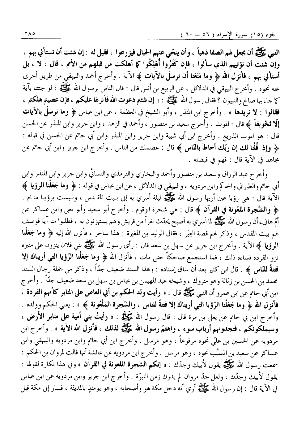 وَالشَّجَرَةَ الْمَلْعُونَةَ فِي الْقُرْآنِ قَالَ: هِيَ شَجَرَةُ الزَّقُّومِ. وَأَخْرَجَ أَبُو سَعِيدٍ وَأَبُو يَعْلَى وَابْنُ عَسَاكِرَ عَنْ أُمِّ هَانِئٍ أَنَّ رَسُولَ اللَّهِ صَلَّى اللَّهُ عَلَيْهِ وَسَلَّمَ لَمَّا أُسْرِيَ بِهِ أَصْبَحَ يُحَدِّثُ نَفَرًا مِنْ قُرَيْشٍ وَهُمْ يَسْتَهْزِئُونَ بِهِ، فَطَلَبُوا مِنْهُ آيَةً فَوَصَفَ لَهُمْ بَيْتَ الْمَقْدِسِ، وَذَكَرَ لَهُمْ قِصَّةَ الْعِيرِ، فَقَالَ الْوَلِيدُ بْنُ الْمُغِيرَةِ: هَذَا سَاحِرٌ، فَأَنْزَلَ اللَّهُ إِلَيْهِ وَما جَعَلْنَا الرُّؤْيَا الْآيَةَ. وَأَخْرَجَ ابْنُ جَرِيرٍ عَنْ سَهْلِ بْنِ سَعْدٍ قَالَ: رَأَى رَسُولُ اللَّهِ صَلَّى اللَّهُ عَلَيْهِ وَسَلَّمَ بَنِي فُلَانٍ يَنْزُونَ عَلَى مِنْبَرِهِ نَزْوَ الْقِرَدَةِ فَسَاءَهُ ذَلِكَ، فَمَا اسْتَجْمَعَ ضَاحِكًا حَتَّى مَاتَ، فَأَنْزَلَ اللَّهُ وَما جَعَلْنَا الرُّؤْيَا الَّتِي أَرَيْناكَ إِلَّا فِتْنَةً لِلنَّاسِ. قَالَ ابْنُ كَثِيرٍ بَعْدَ أَنْ سَاقَ إِسْنَادَهُ: وَهَذَا السَّنَدُ ضَعِيفٌ جِدًّا، وَذَكَرَ مِنْ جُمْلَةِ رِجَالِ السَّنَدِ مُحَمَّدَ بن الحسن بن زبالة وَهُوَ مَتْرُوكٌ، وَشَيْخُهُ عَبْدُ الْمُهَيْمِنِ بْنُ عَبَّاسِ بْنِ سَهْلِ بْنِ سَعْدٍ ضَعِيفٌ جِدًّا. وَأَخْرَجَ ابْنُ أَبِي حَاتِمٍ عَنِ ابْنِ عَمْرٍو أَنَّ النَّبِيَّ صَلَّى اللَّهُ عَلَيْهِ وَسَلَّمَ قَالَ: «رَأَيْتُ وَلَدَ الْحَكَمِ بْنِ أَبِي الْعَاصِ عَلَى الْمَنَابِرِ كَأَنَّهُمُ الْقِرَدَةُ، فَأَنْزَلَ اللَّهُ وَما جَعَلْنَا الرُّؤْيَا الَّتِي أَرَيْناكَ إِلَّا فِتْنَةً لِلنَّاسِ، وَالشَّجَرَةَ الْمَلْعُونَةَ» : يَعْنِي الْحَكَمَ وَوَلَدَهُ.