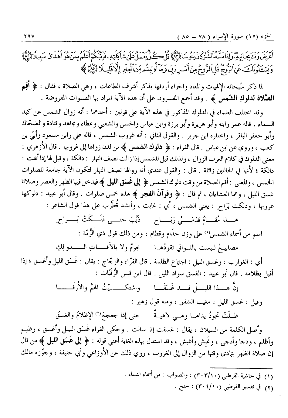 دَالِكَةٌ لِأَنَّهَا فِي الْحَالَتَيْنِ زَائِلَةٌ. قَالَ: وَالْقَوْلُ عِنْدِي أَنَّهُ زَوَالُهَا نِصْفَ النَّهَارِ لِتَكُونَ الْآيَةُ جَامِعَةً لِلصَّلَوَاتِ الْخَمْسِ، وَالْمَعْنَى: أَقِمِ الصَّلَاةَ مِنْ وَقْتِ دُلُوكِ الشَّمْسِ إِلى غَسَقِ اللَّيْلِ فَيَدْخُلُ فِيهَا الظُّهْرُ وَالْعَصْرُ وَصَلَاتَا غَسَقِ اللَّيْلِ، وَهُمَا الْعِشَاءَانِ، ثُمَّ قَالَ: وَقُرْآنَ الْفَجْرِ هَذِهِ خَمْسُ صَلَوَاتٍ. وَقَالَ أَبُو عُبِيدٍ: دُلُوكُهَا غُرُوبُهَا، وَدَلَكَتْ بِرَاحٍ: يَعْنِي الشَّمْسَ، أَيْ: غَابَتْ، وَأَنْشَدَ قُطْرُبٌ عَلَى هَذَا قَوْلَ الشَّاعِرِ: