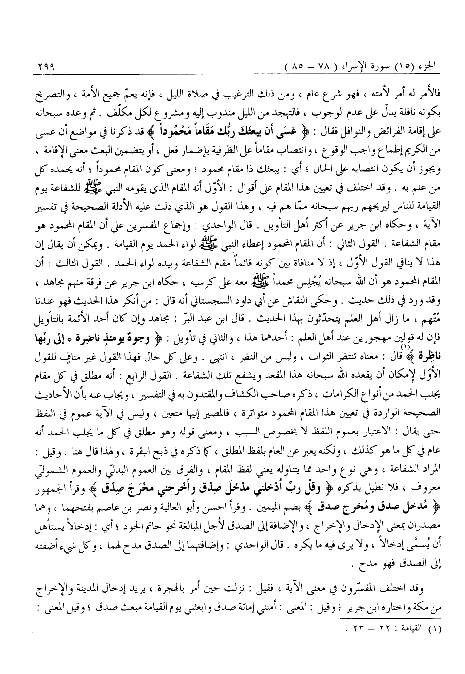 فَالْأَمْرُ لَهُ أَمْرٌ لِأُمَّتِهِ، فَهُوَ شَرْعٌ عَامٌّ، وَمِنْ ذَلِكَ التَّرْغِيبُ فِي صَلَاةِ اللَّيْلِ، فَإِنَّهُ يَعُمُّ جَمِيعَ الْأُمَّةِ، وَالتَّصْرِيحُ بِكَوْنِهِ نَافِلَةً يَدُلُّ عَلَى عَدَمِ الْوُجُوبِ، فَالتَّهَجُّدُ مِنَ اللَّيْلِ مَنْدُوبٌ إِلَيْهِ وَمَشْرُوعٌ لِكُلَّ مُكَلَّفٍ. ثُمَّ وَعَدَهُ سُبْحَانَهُ عَلَى إِقَامَةِ الْفَرَائِضِ وَالنَّوَافِلِ فَقَالَ: عَسى أَنْ يَبْعَثَكَ رَبُّكَ مَقاماً مَحْمُوداً قَدْ ذَكَرْنَا فِي مَوَاضِعَ أَنَّ عَسَى مِنَ الْكَرِيمِ إِطْمَاعٌ وَاجِبُ الْوُقُوعِ، وَانْتِصَابُ مَقَامًا عَلَى الظَّرْفِيَّةِ بِإِضْمَارِ فِعْلٍ، أَوْ بِتَضْمِينِ الْبَعْثِ مَعْنَى الْإِقَامَةِ، وَيَجُوزُ أَنْ يَكُونَ انْتِصَابُهُ عَلَى الْحَالِ أَيْ: يَبْعَثَكَ ذَا مَقَامٍ مَحْمُودٍ وَمَعْنَى كَوْنِ الْمَقَامِ مَحْمُودًا أَنَّهُ يَحْمَدُهُ كُلُّ مَنْ عَلِمَ بِهِ. وَقَدِ اخْتُلِفَ فِي تَعْيِينِ هَذَا الْمَقَامِ عَلَى أَقْوَالٍ: الْأَوَّلُ أَنَّهُ الْمَقَامُ الَّذِي يَقُومُهُ النَّبِيُّ صَلَّى اللَّهُ عليه وَسَلَّمَ لِلشَّفَاعَةِ يَوْمَ الْقِيَامَةِ لِلنَّاسِ لِيُرِيحَهُمْ رَبُّهُمْ سُبْحَانَهُ مِمَّا هُمْ فِيهِ، وَهَذَا الْقَوْلُ هُوَ الَّذِي دَلَّتْ عَلَيْهِ الْأَدِلَّةُ الصَّحِيحَةُ فِي تَفْسِيرِ الْآيَةِ، وَحَكَاهُ ابْنُ جَرِيرٍ عَنْ أَكْثَرِ أَهْلِ التَّأْوِيلِ. قَالَ الْوَاحِدِيُّ: وَإِجْمَاعُ الْمُفَسِّرِينَ عَلَى أَنَّ الْمَقَامَ الْمَحْمُودَ هُوَ مَقَامُ الشَّفَاعَةِ. الْقَوْلُ الثَّانِي: أَنَّ الْمَقَامَ الْمَحْمُودَ إِعْطَاءُ النَّبِيِّ صَلَّى اللَّهُ عليه وَسَلَّمَ لِوَاءَ الْحَمْدِ يَوْمَ الْقِيَامَةِ. وَيُمْكِنُ أَنْ يُقَالَ إِنَّ هَذَا لَا يُنَافِي الْقَوْلَ الْأَوَّلَ، إِذْ لَا مُنَافَاةَ بَيْنَ كَوْنِهِ قَائِمًا مَقَامَ الشَّفَاعَةِ وَبِيَدِهِ لِوَاءُ الْحَمْدِ. الْقَوْلُ الثَّالِثُ: أَنَّ الْمَقَامَ الْمَحْمُودَ هُوَ أَنَّ اللَّهَ سُبْحَانَهُ يُجْلِسُ محمدا صلّى الله عليه وَسَلَّمَ مَعَهُ عَلَى كُرْسِيِّهِ، حَكَاهُ ابْنُ جَرِيرٍ عَنْ فِرْقَةٍ مِنْهُمْ مُجَاهِدٌ، وَقَدْ وَرَدَ فِي ذَلِكَ حَدِيثٌ. وَحَكَى النَّقَّاشُ عَنْ أَبِي دَاوُدَ السِّجِسْتَانِيِّ أَنَّهُ قَالَ: مَنْ أَنْكَرَ هَذَا الْحَدِيثَ فَهُوَ عِنْدَنَا مُتَّهَمٌ، مَا زَالَ أَهْلُ الْعِلْمِ يَتَحَدِّثُونَ بِهَذَا الْحَدِيثِ. قَالَ ابْنُ عَبْدِ الْبَرِّ: مُجَاهِدٌ وَإِنْ كَانَ أَحَدَ الْأَئِمَّةِ بِالتَّأْوِيلِ فَإِنَّ لَهُ قَوْلَيْنِ مَهْجُورَيْنِ عِنْدَ أَهْلِ الْعِلْمِ: أَحَدُهُمَا هَذَا، وَالثَّانِي فِي تَأْوِيلِ: وُجُوهٌ يَوْمَئِذٍ ناضِرَةٌ- إِلى رَبِّها ناظِرَةٌ «1» قَالَ: مَعْنَاهُ تَنْتَظِرُ الثَّوَابَ، وَلَيْسَ مِنَ النَّظَرِ، انْتَهَى. وَعَلَى كُلِّ حَالٍ فَهَذَا الْقَوْلُ غَيْرُ مُنَافٍ لِلْقَوْلِ الْأَوَّلِ لِإِمْكَانِ أَنْ يُقْعِدَهُ اللَّهُ سُبْحَانَهُ هَذَا الْمَقْعَدَ وَيَشْفَعَ تِلْكَ الشَّفَاعَةَ. الْقَوْلُ الرَّابِعُ: أَنَّهُ مُطْلَقٌ فِي كُلِّ مَقَامٍ يَجْلِبُ الْحَمْدَ مِنْ أَنْوَاعِ الْكَرَامَاتِ، ذَكَرَهُ صَاحِبُ الْكَشَّافِ وَالْمُقْتَدُونَ بِهِ فِي التَّفْسِيرِ، وَيُجَابُ عَنْهُ بِأَنَّ الْأَحَادِيثَ الصَّحِيحَةَ الْوَارِدَةَ فِي تَعْيِينِ هَذَا الْمَقَامِ الْمَحْمُودِ مُتَوَاتِرَةٌ، فَالْمَصِيرُ إِلَيْهَا مُتَعَيِّنٌ، وَلَيْسَ فِي الْآيَةِ عُمُومٌ فِي اللَّفْظِ حَتَّى يُقَالَ: الِاعْتِبَارُ بِعُمُومِ اللَّفْظِ لَا بِخُصُوصِ السَّبَبِ، وَمَعْنَى قَوْلِهِ وَهُوَ مُطْلَقٌ فِي كُلِّ مَا يَجْلِبُ الْحَمْدَ أَنَّهُ عَامٌّ فِي كُلِّ مَا هُوَ كَذَلِكَ، وَلَكِنَّهُ يُعَبَّرُ عَنِ الْعَامِّ بِلَفْظِ الْمُطْلَقِ، كَمَا ذَكَر