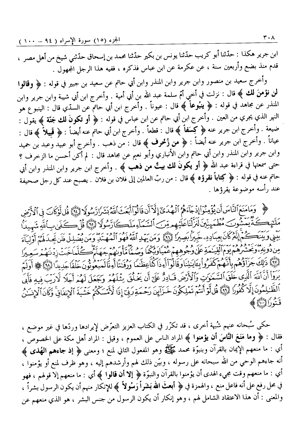 وَأَخْرَجَ سَعِيدُ بْنُ مَنْصُورٍ وَابْنُ جَرِيرٍ وَابْنُ الْمُنْذِرِ وَابْنُ أَبِي حَاتِمٍ عَنْ سَعِيدِ بْنِ جُبَيْرٍ فِي قَوْلِهِ: وَقالُوا لَنْ نُؤْمِنَ لَكَ قَالَ: نَزَلَتْ فِي أَخِي أُمِّ سَلَمَةَ عَبْدِ اللَّهِ بْنِ أَبِي أُمَيَّةَ. وَأَخْرَجَ ابْنُ أَبِي شَيْبَةَ وَابْنُ جَرِيرٍ وَابْنُ الْمُنْذِرِ عَنْ مُجَاهِدٍ فِي قَوْلِهِ: يَنْبُوعاً قَالَ: عُيُونًا. وَأَخْرَجَ ابْنُ أَبِي حَاتِمٍ عَنِ السُّدِّيِّ قَالَ: الْيَنْبُوعُ هُوَ النَّهْرُ الَّذِي يَجْرِي مِنَ الْعَيْنِ. وَأَخْرَجَ ابْنُ أَبِي حَاتِمٍ عَنِ ابْنِ عَبَّاسٍ فِي قَوْلِهِ: أَوْ تَكُونَ لَكَ جَنَّةٌ يَقُولُ: