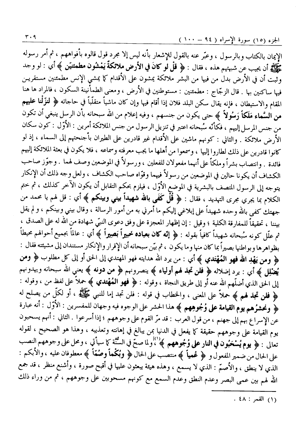 الْإِيمَانِ بِالْكِتَابِ وَبِالرَّسُولِ، وَعَبَّرَ عَنْهُ بِالْقَوْلِ لِلْإِشْعَارِ بِأَنَّهُ لَيْسَ إِلَّا مُجَرَّدُ قَوْلٍ قَالُوهُ بِأَفْوَاهِهِمْ، ثم أمر رَسُولَهُ صَلَّى اللَّهُ عَلَيْهِ وَسَلَّمَ أَنْ يُجِيبَ عَنْ شُبْهَتِهِمْ هَذِهِ، فَقَالَ: قُلْ لَوْ كانَ فِي الْأَرْضِ مَلائِكَةٌ يَمْشُونَ مُطْمَئِنِّينَ أَيْ: لَوْ وُجِدَ وَثَبَتَ أَنَّ فِي الْأَرْضِ بَدَلُ مَنْ فِيهَا مِنَ الْبَشَرِ مَلَائِكَةٌ يَمْشُونَ عَلَى الْأَقْدَامِ كَمَا يَمْشِي الْإِنْسُ مُطَمْئِنِّينَ مُسْتَقِرِّينَ فِيهَا سَاكِنِينَ بِهَا. قَالَ الزَّجَّاجُ: مُطْمَئِنِّينَ: مُسْتَوْطِنِينَ فِي الْأَرْضِ، وَمَعْنَى الطُّمَأْنِينَةِ السُّكُونُ، فَالْمُرَادُ هَاهُنَا الْمَقَامُ وَالِاسْتِيطَانُ، فَإِنَّهُ يُقَالُ سَكَنَ الْبَلَدَ فُلَانٌ إِذَا أَقَامَ فِيهَا وَإِنْ كَانَ مَاشِيًا مُتَقَّلِبًا فِي حَاجَاتِهِ لَنَزَّلْنا عَلَيْهِمْ مِنَ السَّماءِ مَلَكاً رَسُولًا حَتَّى يَكُونَ مِنْ جِنْسِهِمْ، وَفِيهِ إِعْلَامٌ مِنَ اللَّهِ سُبْحَانَهُ بِأَنَّ الرُّسُلَ يَنْبَغِي أَنْ تَكُونَ مِنْ جِنْسِ الْمُرْسَلِ إِلَيْهِمْ، فَكَأَنَّهُ سُبْحَانَهُ اعْتَبَرَ فِي تَنْزِيلِ الرَّسُولِ مِنْ جِنْسِ الْمَلَائِكَةِ أَمْرَيْنِ: الْأَوَّلُ: كَوْنُ سُكَّانِ الْأَرْضِ مَلَائِكَةً. وَالثَّانِي: كَوْنُهُمْ مَاشِينَ عَلَى الْأَقْدَامِ غَيْرَ قَادِرِينَ عَلَى الطَّيَرَانِ بِأَجْنِحَتِهِمْ إِلَى السَّمَاءِ، إِذْ لَوْ كَانُوا قَادِرِينَ عَلَى ذَلِكَ لَطَارُوا إِلَيْهَا، وَسَمِعُوا مِنْ أَهْلِهَا مَا يَجِبُ مَعْرِفَتُهُ وَسَمَاعُهُ، فَلَا يَكُونُ فِي بَعْثَةِ الْمَلَائِكَةِ إِلَيْهِمْ فَائِدَةٌ. وَانْتِصَابُ بشرا وملكا على أنهما مفعولان للفعلين، ورسولا فِي الْمَوْضِعَيْنِ وَصْفٌ لَهُمَا. وَجَوَّزَ صَاحِبُ الْكَشَّافِ أَنْ يَكُونَا حَالَيْنِ فِي الْمَوْضِعَيْنِ مِنْ رَسُولًا فِيهِمَا وَقَوَّاهُ صَاحِبُ الْكَشَّافِ، وَلَعَلَّ وَجْهَ ذَلِكَ أَنَّ الْإِنْكَارَ يَتَوَجَّهُ إِلَى الرَّسُولِ الْمُتَّصِفِ بِالْبَشَرِيَّةِ فِي الْمَوْضِعِ الْأَوَّلِ، فَيَلْزَمُ بِحُكْمِ التَّقَابُلِ أَنْ يَكُونَ الْآخَرُ كَذَلِكَ، ثُمَّ خَتَمَ الْكَلَامَ بِمَا يَجْرِي مَجْرَى التَّهْدِيدِ، فَقَالَ: قُلْ كَفى بِاللَّهِ شَهِيداً بَيْنِي وَبَيْنَكُمْ أَيْ: قُلْ لَهُمْ يَا مُحَمَّدُ مِنْ جِهَتِكَ كَفَى بِاللَّهِ وَحْدَهُ شَهِيدًا عَلَى إِبْلَاغِي إِلَيْكُمْ مَا أَمَرَنِي بِهِ مِنْ أُمُورِ الرِّسَالَةِ، وَقَالَ بَيْنِي وَبَيْنَكُمْ، وَلَمْ يَقُلْ بَيْنَنَا، تَحْقِيقًا لِلْمُفَارَقَةِ الْكُلِّيَّةِ وَقِيلَ: إِنَّ إِظْهَارَ الْمُعْجِزَةِ عَلَى وَفْقِ دَعْوَى النَّبِيِّ شَهَادَةٌ مِنَ اللَّهِ لَهُ عَلَى الصِّدْقِ، ثُمَّ عَلَّلَ كَوْنَهُ سُبْحَانَهُ شَهِيدًا كَافِيًا بِقَوْلِهِ: إِنَّهُ كانَ بِعِبادِهِ خَبِيراً بَصِيراً أَيْ: عَالِمًا بِجَمِيعِ أَحْوَالِهِمْ مُحِيطًا بِظَوَاهِرِهَا وَبَوَاطِنِهَا بَصِيرًا بِمَا كَانَ مِنْهَا وَمَا يَكُونُ، ثُمَّ بَيَّنَ سُبْحَانَهُ أَنَّ الْإِقْرَارَ وَالْإِنْكَارَ مُسْتَنِدَانِ إِلَى مَشِيئَتِهِ فَقَالَ: