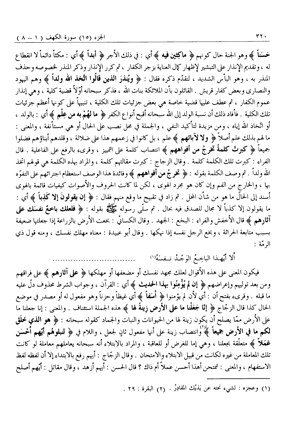 فَيَكُونُ الْمَعْنَى عَلَى هَذِهِ الْأَقْوَالِ لَعَلَّكَ مُجْهِدٌ نَفْسَكَ أَوْ مُضْعِفُهَا أَوْ مُهْلِكُهَا عَلى آثارِهِمْ عَلَى فِرَاقِهِمْ وَمِنْ بَعْدِ تَوَلِّيهِمْ وَإِعْرَاضِهِمْ إِنْ لَمْ يُؤْمِنُوا بِهذَا الْحَدِيثِ أَيْ: الْقُرْآنِ، وَجَوَابُ الشَّرْطِ مَحْذُوفٌ دَلَّ عَلَيْهِ مَا قَبْلَهُ. وَقُرِئَ بِفَتْحِ أَنْ: أَيْ لِأَنْ لَمْ يُؤْمِنُوا أَسَفاً أَيْ غَيْظًا وَحُزْنًا وَهُوَ مَفْعُولٌ لَهُ أَوْ مَصْدَرٌ فِي مَوْضِعِ الْحَالِ كَذَا قَالَ الزَّجَّاجُ إِنَّا جَعَلْنا مَا عَلَى الْأَرْضِ زِينَةً لَها هَذِهِ الْجُمْلَةُ اسْتِئْنَافٌ. وَالْمَعْنَى: إِنَّا جَعَلْنَا مَا عَلَى الْأَرْضِ مِمَّا يَصْلُحُ أَنْ يَكُونَ زِينَةً لَهَا مِنَ الْحَيَوَانَاتِ وَالنَّبَاتِ وَالْجَمَادِ كَقَوْلِهِ سُبْحَانَهُ: هُوَ الَّذِي خَلَقَ لَكُمْ مَا فِي الْأَرْضِ جَمِيعاً «2» وَانْتِصَابُ زِينَةً عَلَى أَنَّهَا مَفْعُولٌ ثَانٍ لِجَعَلَ، وَاللَّامُ فِي لِنَبْلُوَهُمْ أَيُّهُمْ أَحْسَنُ عَمَلًا مُتَعَلِّقَةٌ بِجَعَلْنَا، وَهِيَ إِمَّا لِلْغَرَضِ أَوْ لِلْعَاقِبَةِ، وَالْمُرَادُ بِالِابْتِلَاءِ أَنَّهُ سُبْحَانَهُ يُعَامِلُهُمْ مُعَامَلَةً لَوْ كَانَتْ تِلْكَ الْمُعَامَلَةُ مِنْ غَيْرِهِ لَكَانَتْ مِنْ قَبِيلِ الِابْتِلَاءِ وَالِامْتِحَانِ. وَقَالَ الزَّجَّاجُ: أَيُّهُمْ رُفِعَ بِالِابْتِدَاءِ إِلَّا أَنَّ لَفْظَهُ لَفْظُ الِاسْتِفْهَامِ، وَالْمَعْنَى: لِنَمْتَحِنَ أَهَذَا أَحْسَنُ عَمَلًا أَمْ ذَاكَ؟ قَالَ الْحَسَنُ: أَيُّهُمْ أَزْهَدُ، وَقَالَ مقاتل: أيّهم أصلح