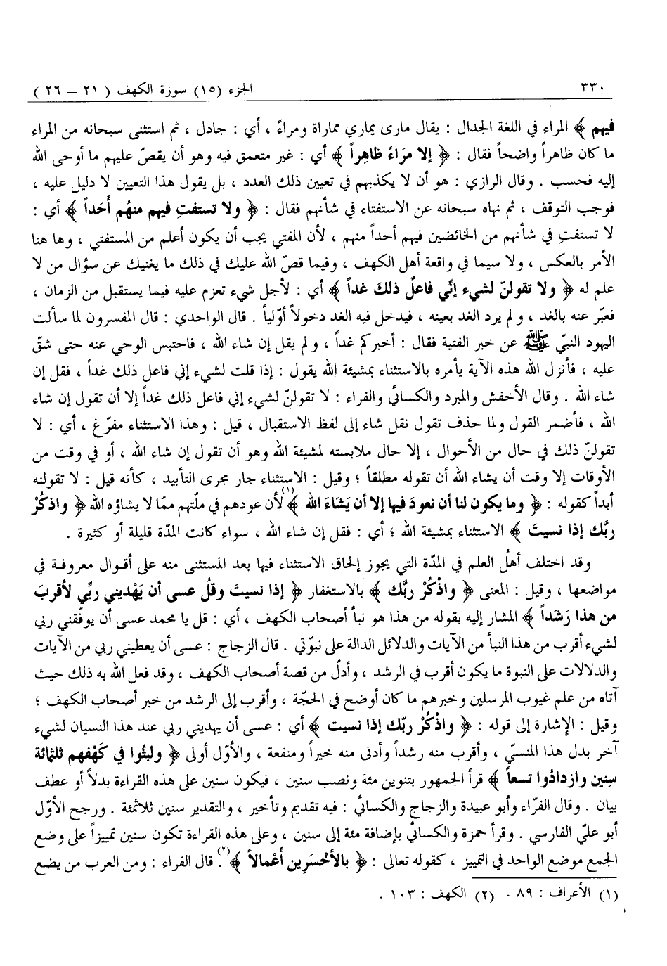 لَا تَسْتَفْتِ فِي شَأْنِهِمْ مِنَ الْخَائِضِينَ فِيهِمْ أَحْدًا مِنْهُمْ، لِأَنَّ الْمُفْتِيَ يَجِبُ أَنْ يَكُونَ أَعْلَمَ مِنَ الْمُسْتَفْتِي، وَهَاهُنَا الْأَمْرُ بِالْعَكْسِ، وَلَا سِيَّمَا فِي وَاقِعَةِ أَهْلِ الْكَهْفِ، وَفِيمَا قَصَّ اللَّهُ عَلَيْكَ فِي ذَلِكَ مَا يُغْنِيكَ عَنْ سُؤَالِ مَنْ لَا عِلْمَ لَهُ وَلا تَقُولَنَّ لِشَيْءٍ إِنِّي فاعِلٌ ذلِكَ غَداً أَيْ: لِأَجْلِ شَيْءٍ تَعْزِمُ عَلَيْهِ فِيمَا يُسْتَقْبَلُ مِنَ الزَّمَانِ، فَعَبَّرَ عَنْهُ بِالْغَدِ، وَلَمْ يُرِدِ الْغَدَ بِعَيْنِهِ، فَيَدْخُلُ فِيهِ الْغَدُ دُخُولًا أَوَّلِيًّا. قَالَ الْوَاحِدِيُّ: قَالَ الْمُفَسِّرُونَ لَمَّا سَأَلَتِ الْيَهُودُ النَّبِيَّ صلّى الله عليه وَسَلَّمَ عَنْ خَبَرِ الْفِتْيَةِ فَقَالَ: أُخْبِرُكُمْ غَدًا، وَلَمْ يَقِلْ إِنْ شَاءَ اللَّهُ، فَاحْتَبَسَ الْوَحْيُ عَنْهُ حَتَّى شَقَّ عَلَيْهِ، فَأَنْزَلَ اللَّهُ هَذِهِ الْآيَةَ يَأْمُرُهُ بِالِاسْتِثْنَاءِ بِمَشِيئَةِ اللَّهِ يَقُولُ: إِذَا قُلْتَ لِشَيْءٍ إِنِّي فَاعِلٌ ذَلِكَ غَدًا، فَقُلْ إِنْ شَاءَ اللَّهُ. وَقَالَ الْأَخْفَشُ وَالْمُبَرِّدُ وَالْكِسَائِيُّ وَالْفَرَّاءُ: لَا تَقُولَنَّ لِشَيْءٍ إِنِّي فَاعِلٌ ذَلِكَ غَدًا إِلَّا أَنْ تَقُولَ إِنْ شَاءَ اللَّهُ، فَأَضْمَرَ الْقَوْلَ وَلَمَّا حَذَفَ تَقُولُ نَقْلَ شَاءَ إِلَى لَفْظِ الِاسْتِقْبَالِ، قِيلَ: وَهَذَا الِاسْتِثْنَاءُ مُفَرَّغٌ، أَيْ: لَا تَقُولَنَّ ذَلِكَ فِي حَالٍ مِنَ الْأَحْوَالِ، إِلَّا حَالَ مُلَابَسَتِهِ لِمَشِيئَةِ اللَّهِ وَهُوَ أَنْ تَقُولَ إِنْ شَاءَ اللَّهُ، أَوْ فِي وَقْتٍ مِنَ الْأَوْقَاتِ إِلَّا وَقْتَ أَنْ يَشَاءَ اللَّهُ أَنْ تَقُولَهُ مُطْلَقًا وَقِيلَ: الِاسْتِثْنَاءُ جَارٍ مَجْرَى التَّأْبِيدِ، كَأَنَّهُ قِيلَ: لَا تَقُولَنَّهُ أَبَدًا كَقَوْلِهِ: وَما يَكُونُ لَنا أَنْ نَعُودَ فِيها إِلَّا أَنْ يَشاءَ اللَّهُ «1» لِأَنَّ عَوْدَهُمْ فِي مِلَّتِهِمْ مِمَّا لَا يَشَاؤُهُ اللَّهُ وَاذْكُرْ رَبَّكَ إِذا نَسِيتَ الِاسْتِثْنَاءَ بِمَشِيئَةِ اللَّهِ أَيْ: فَقُلْ إِنْ شَاءَ اللَّهُ، سَوَاءٌ كَانَتِ الْمُدَّةُ قَلِيلَةً أَوْ كَثِيرَةً.