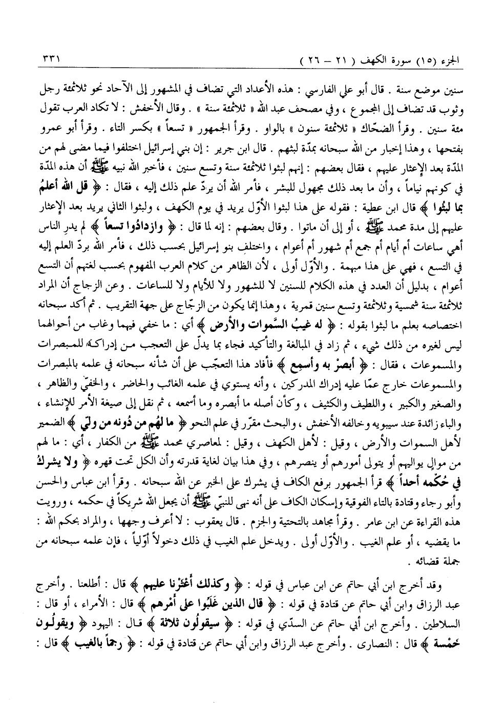 سِنِينَ مَوْضِعَ سَنَةٍ. قَالَ أَبُو عَلِيٍّ الْفَارِسِيُّ: هَذِهِ الْأَعْدَادُ الَّتِي تُضَافُ فِي الْمَشْهُورِ إِلَى الآحاد نحو ثلاثمائة رَجُلٍ وَثَوْبٍ قَدْ تُضَافُ إِلَى الْمَجْمُوعِ، وَفِي مصحف عبد الله «ثلاثمائة سَنَةٍ» . وَقَالَ الْأَخْفَشُ: لَا تَكَادُ الْعَرَبُ تَقُولُ مائة سنين. وقرأ الضحّاك «ثلاثمائة سُنُونَ» بِالْوَاوِ. وَقَرَأَ الْجُمْهُورُ «تِسْعًا» بِكَسْرِ التَّاءِ. وَقَرَأَ أَبُو عَمْرٍو بِفَتْحِهَا، وَهَذَا إِخْبَارٌ مِنَ اللَّهِ سُبْحَانَهُ بِمُدَّةِ لُبْثِهِمْ. قَالَ ابْنُ جَرِيرٍ: إِنْ بَنِي إِسْرَائِيلَ اخْتَلَفُوا فِيمَا مَضَى لَهُمْ مِنَ الْمُدَّةِ بَعْدَ الْإِعْثَارِ عَلَيْهِمْ، فَقَالَ بَعْضُهُمْ: إِنَّهُمْ لَبِثُوا ثَلَاثَمِائَةِ سَنَةٍ وَتِسْعَ سِنِينَ، فَأَخْبَرَ اللَّهُ نَبِيَّهُ صَلَّى اللَّهُ عَلَيْهِ وَسَلَّمَ أَنْ هَذِهِ الْمُدَّةَ فِي كَوْنِهِمْ نِيَامًا، وأن ما بعد ذلك مجهول للبشر، فأمر اللَّهُ أَنْ يَرُدَّ عِلْمَ ذَلِكَ إِلَيْهِ، فَقَالَ: قُلِ اللَّهُ أَعْلَمُ بِما لَبِثُوا قَالَ ابْنُ عَطِيَّةَ: فَقَوْلُهُ عَلَى هَذَا لَبِثُوا الْأَوَّلُ يُرِيدُ فِي يَوْمِ الْكَهْفِ، وَلَبِثُوا الثَّانِي يُرِيدُ بَعْدَ الْإِعْثَارِ عَلَيْهِمْ إِلَى مُدَّةِ مُحَمَّدٍ صَلَّى اللَّهُ عليه وَسَلَّمَ، أَوْ إِلَى أَنْ مَاتُوا. وَقَالَ بَعْضُهُمْ: إِنَّهُ لَمَّا قَالَ: وَازْدَادُوا تِسْعاً لَمْ يَدْرِ النَّاسُ أَهْيَ سَاعَاتٌ أَمْ أَيَّامٌ أَمْ جُمَعٌ أَمْ شُهُورٌ أَمْ أَعْوَامٌ، وَاخْتَلَفَ بَنُو إِسْرَائِيلَ بِحَسَبِ ذَلِكَ، فَأَمَرَ اللَّهُ بِرَدِّ الْعِلْمِ إِلَيْهِ فِي التِّسْعِ، فَهِيَ عَلَى هَذَا مُبْهَمَةٌ. وَالْأَوَّلُ أَوْلَى، لِأَنَّ الظَّاهِرَ مِنْ كَلَامِ الْعَرَبِ الْمَفْهُومِ بِحَسَبِ لُغَتِهِمْ أَنَّ التِّسْعَ أَعْوَامٌ، بِدَلِيلِ أَنَّ العدد في هذه الْكَلَامِ لِلسِّنِينَ لَا لِلشُّهُورِ وَلَا لِلْأَيَّامِ وَلَا لِلسَّاعَاتِ. وَعَنِ الزَّجَّاجِ أَنَّ الْمُرَادَ ثَلَاثَمِائَةِ سَنَةٍ شَمْسِيَّةٍ وَثَلَاثَمِائَةٍ وَتِسْعُ سِنِينَ قَمَرِيَّةٍ، وَهَذَا إِنَّمَا يَكُونُ مِنَ الزَّجَّاجِ عَلَى جِهَةِ التَّقْرِيبِ. ثُمَّ أَكَّدَ سُبْحَانَهُ اخْتِصَاصَهُ بِعِلْمِ مَا لَبِثُوا بِقَوْلِهِ: لَهُ غَيْبُ السَّماواتِ وَالْأَرْضِ أَيْ: مَا خَفِيَ فِيهِمَا وَغَابَ مِنْ أَحْوَالِهِمَا لَيْسَ لِغَيْرِهِ مِنْ ذَلِكَ شَيْءٌ، ثُمَّ زَادَ فِي الْمُبَالَغَةِ وَالتَّأْكِيدِ فَجَاءَ بِمَا يَدُلُّ عَلَى التَّعَجُّبِ مِنْ إِدْرَاكِهِ لِلْمُبْصَرَاتِ وَالْمَسْمُوعَاتِ، فَقَالَ: أَبْصِرْ بِهِ وَأَسْمِعْ فَأَفَادَ هَذَا التَّعَجُّبُ عَلَى أَنَّ شَأْنَهُ سُبْحَانَهُ فِي عِلْمِهِ بِالْمُبْصَرَاتِ وَالْمَسْمُوعَاتِ خَارِجٌ عَمَّا عَلَيْهِ إِدْرَاكُ الْمُدْرِكِينَ، وَأَنَّهُ يَسْتَوِي فِي عِلْمِهِ الْغَائِبُ وَالْحَاضِرُ، وَالْخَفِيُّ وَالظَّاهِرُ، وَالصَّغِيرُ وَالْكَبِيرُ، وَاللَّطِيفُ وَالْكَثِيفُ، وَكَأَنَّ أَصْلَهُ مَا أَبْصَرَهُ وَمَا أَسْمَعَهُ، ثُمَّ نُقِلَ إِلَى صِيغَةِ الْأَمْرِ لِلْإِنْشَاءِ، وَالْبَاءُ زَائِدَةٌ عِنْدَ سِيبَوَيْهِ وَخَالَفَهُ الْأَخْفَشُ، وَالْبَحْثُ مُقَرَّرٌ فِي عِلْمِ النَّحْوِ مَا لَهُمْ مِنْ دُونِهِ مِنْ وَلِيٍّ الضمير لأهل السموات وَالْأَرْضِ، وَقِيلَ: لِأَهْلِ الْكَهْفِ، وَقِيلَ: لِمُعَاصِرِي مُحَمَّدٍ صلّى الله عليه وَسَلَّمَ مِنَ الْكُفَّارِ، أَيْ: مَا لَهُمْ مِنْ مُوَالٍ يُوَالِيهِمْ أَوْ يَتَوَلَّى أُمُورَهُمْ أَوْ يَنْصُرُهُمْ، وَفِي هَذَا بَيَانٌ لِغَايَةِ قُدْرَتِهِ وَأَنَّ الْكُلَّ تَحْتَ قَهْرِهِ وَلا يُشْرِكُ فِي حُكْمِهِ أَحَداً قرأ الجمهور برفع الكاف في يشرك عَلَى الْخَبَرِ عَنِ اللَّهِ سُبْحَانَهُ