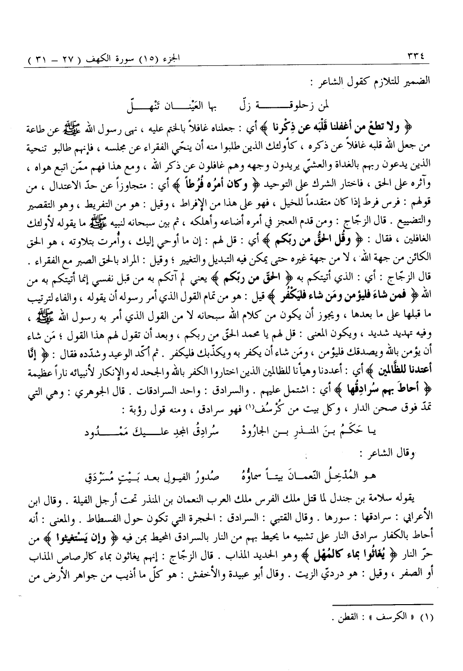 يقوله سلامة بْنُ جَنْدَلٍ لَمَّا قَتَلَ مَلِكُ الْفُرْسِ مَلِكَ الْعَرَبِ النُّعْمَانَ بْنَ الْمُنْذِرِ تَحْتَ أَرْجُلِ الْفِيَلَةِ. وقال ابن الأعرابي: سرادقها: سورها. وقال القتبي: السُّرَادِقُ: الْحُجْرَةُ الَّتِي تَكُونُ حَوْلَ الْفُسْطَاطِ. وَالْمَعْنَى: أَنَّهُ أَحَاطَ بِالْكُفَّارِ سُرَادِقُ النَّارِ عَلَى تَشْبِيهِ مَا يُحِيطُ بِهِمْ مِنَ النَّارِ بِالسُّرَادِقِ الْمُحِيطِ بِمَنْ فِيهِ وَإِنْ يَسْتَغِيثُوا مِنْ حَرِّ النَّارِ يُغاثُوا بِماءٍ كَالْمُهْلِ وَهُوَ الْحَدِيدُ الْمُذَابُ. قَالَ الزَّجَّاجُ: إِنَّهُمْ يُغَاثُونَ بِمَاءٍ كَالرَّصَاصِ الْمُذَابِ أَوِ الصُّفْرِ، وَقِيلَ: هُوَ دُرْدِيُّ الزَّيْتِ. وَقَالَ أَبُو عُبَيْدَةَ وَالْأَخْفَشُ: هُوَ كُلُّ مَا أُذِيبَ مِنْ جواهر الأرض من