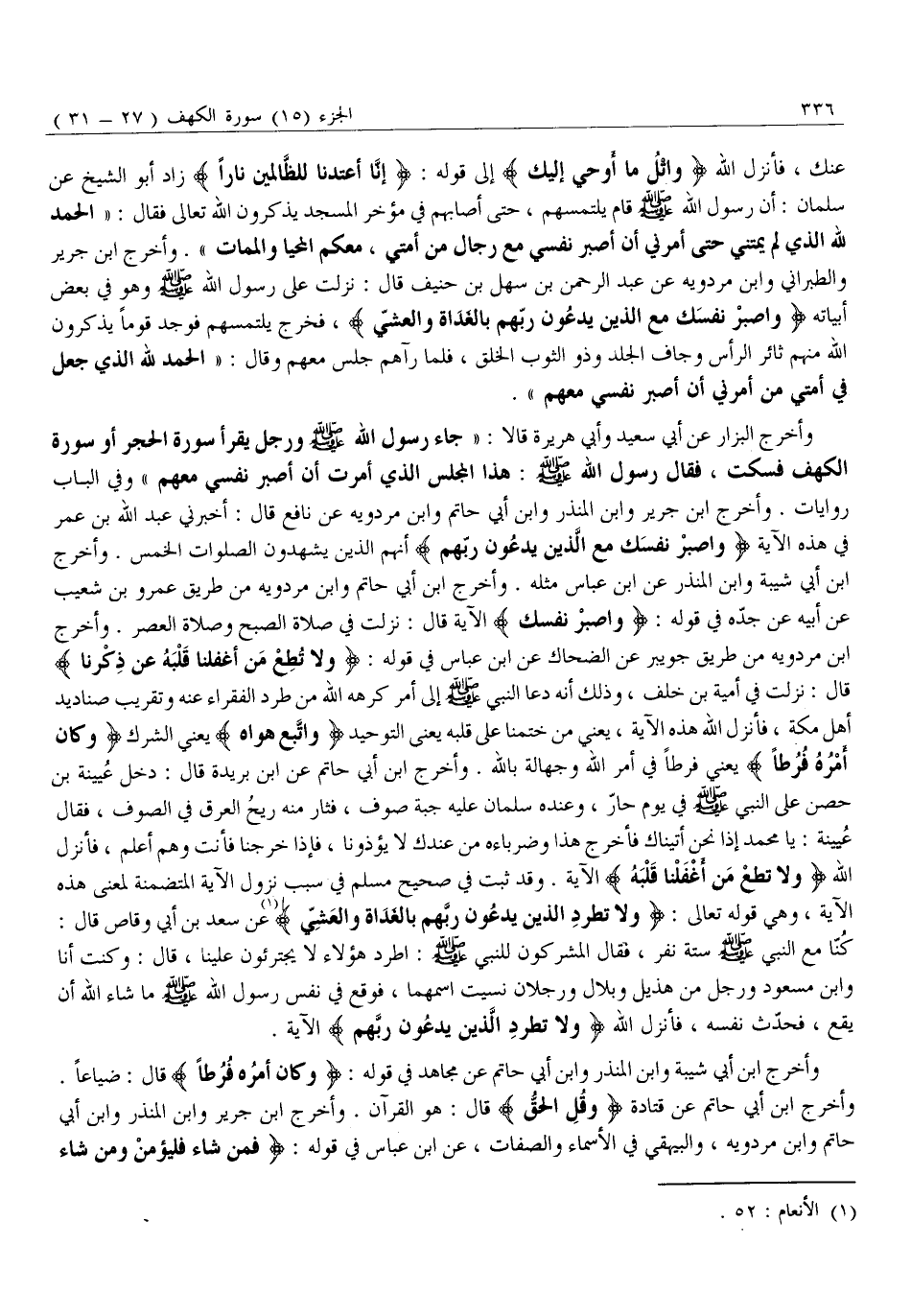 وَأَخْرَجَ الْبَزَّارُ عَنْ أَبِي سَعِيدٍ وَأَبِي هُرَيْرَةَ قَالَا: «جَاءَ رَسُولُ اللَّهِ صَلَّى اللَّهُ عَلَيْهِ وَسَلَّمَ وَرَجُلٌ يَقْرَأُ سُورَةَ الْحِجْرِ أَوْ سُورَةَ الْكَهْفِ فَسَكَتَ، فَقَالَ رَسُولُ اللَّهِ صَلَّى اللَّهُ عَلَيْهِ وَسَلَّمَ: هَذَا الْمَجْلِسُ الَّذِي أُمِرْتُ أَنْ أَصْبِرَ نَفْسِي مَعَهُمْ» وَفِي الْبَابِ رِوَايَاتٌ. وَأَخْرَجَ ابْنُ جَرِيرٍ وَابْنُ الْمُنْذِرِ وَابْنُ أَبِي حَاتِمٍ وَابْنُ مَرْدَوَيْهِ عَنْ نَافِعٍ قَالَ: أَخْبَرَنِي عَبْدُ اللَّهِ بْنُ عُمَرَ فِي هَذِهِ الْآيَةِ وَاصْبِرْ نَفْسَكَ مَعَ الَّذِينَ يَدْعُونَ رَبَّهُمْ أَنَّهُمُ الَّذِينَ يَشْهَدُونَ الصَّلَوَاتِ الْخَمْسَ. وَأَخْرَجَ ابْنُ أَبِي شَيْبَةَ وَابْنُ الْمُنْذِرِ عَنِ ابْنِ عَبَّاسٍ مِثْلَهُ. وَأَخْرَجَ ابْنُ أَبِي حَاتِمٍ وَابْنُ مَرْدَوَيْهِ مِنْ طَرِيقِ عَمْرِو بْنِ شُعَيْبٍ عَنْ أَبِيهِ عَنْ جَدِّهِ فِي قَوْلِهِ: وَاصْبِرْ نَفْسَكَ الْآيَةَ قَالَ: نَزَلَتْ فِي صَلَاةِ الصُّبْحِ وَصَلَاةِ الْعَصْرِ. وَأَخْرَجَ ابْنُ مَرْدَوَيْهِ مِنْ طَرِيقِ جُوَيْبِرٍ عَنِ الضَّحَّاكِ عَنِ ابْنِ عَبَّاسٍ فِي قَوْلِهِ: وَلا تُطِعْ مَنْ أَغْفَلْنا قَلْبَهُ عَنْ ذِكْرِنا قَالَ: نَزَلَتْ فِي أُمَيَّةَ بْنِ خَلَفٍ، وَذَلِكَ أَنَّهُ دَعَا النَّبِيَّ صَلَّى الله عليه وَسَلَّمَ إِلَى أَمْرٍ كَرِهَهُ اللَّهُ مِنْ طَرْدِ الْفُقَرَاءِ عَنْهُ وَتَقْرِيبِ صَنَادِيدِ أَهْلِ مَكَّةَ، فَأَنْزَلَ اللَّهُ هَذِهِ الْآيَةَ، يَعْنِي مَنْ خَتَمْنَا عَلَى قَلْبِهِ يَعْنِي التَّوْحِيدَ وَاتَّبَعَ هَواهُ يَعْنِي الشِّرْكَ وَكانَ أَمْرُهُ فُرُطاً يَعْنِي فُرُطًا فِي أَمْرِ اللَّهِ وَجَهَالَةً بِاللَّهِ. وَأَخْرَجَ ابْنُ أَبِي حَاتِمٍ عَنِ ابْنِ بُرَيْدَةَ قَالَ: دَخَلَ عُيَيْنَةُ بْنُ حصن عَلَى النَّبِيِّ صَلَّى اللَّهُ عَلَيْهِ وَسَلَّمَ فِي يَوْمٍ حَارٍّ، وَعِنْدَهُ سَلْمَانُ عَلَيْهِ جبة صوف، فثار مِنْهُ رِيحُ الْعَرَقِ فِي الصُّوفِ، فَقَالَ عُيَيْنَةُ: يَا مُحَمَّدُ إِذَا نَحْنُ أَتَيْنَاكَ فَأَخْرِجْ هَذَا وضرباءه من عندك لا يؤذونا، فَإِذَا خَرَجْنَا فَأَنْتَ وَهُمْ أَعْلَمُ، فَأَنْزَلَ اللَّهُ وَلا تُطِعْ مَنْ أَغْفَلْنا قَلْبَهُ الْآيَةَ. وَقَدْ ثَبَتَ فِي صَحِيحِ مُسْلِمٍ فِي سَبَبِ نُزُولِ الْآيَةِ الْمُتَضَمِّنَةِ لِمَعْنَى هَذِهِ الْآيَةِ، وَهِيَ قَوْلُهُ تَعَالَى: وَلا تَطْرُدِ الَّذِينَ يَدْعُونَ رَبَّهُمْ بِالْغَداةِ وَالْعَشِيِّ «1» عَنْ سَعْدِ بْنِ أَبِي وَقَّاصٍ قَالَ: