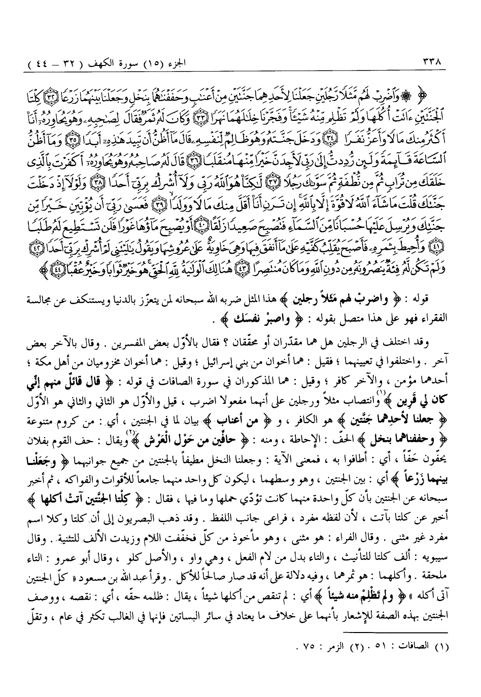 وَاضْرِبْ لَهُمْ مَثَلاً رَجُلَيْنِ جَعَلْنا لِأَحَدِهِما جَنَّتَيْنِ مِنْ أَعْنابٍ وَحَفَفْناهُما بِنَخْلٍ وَجَعَلْنا بَيْنَهُما زَرْعاً (32) كِلْتَا الْجَنَّتَيْنِ آتَتْ أُكُلَها وَلَمْ تَظْلِمْ مِنْهُ شَيْئاً وَفَجَّرْنا خِلالَهُما نَهَراً (33) وَكانَ لَهُ ثَمَرٌ فَقالَ لِصاحِبِهِ وَهُوَ يُحاوِرُهُ أَنَا أَكْثَرُ مِنْكَ مَالًا وَأَعَزُّ نَفَراً (34) وَدَخَلَ جَنَّتَهُ وَهُوَ ظالِمٌ لِنَفْسِهِ قالَ مَا أَظُنُّ أَنْ تَبِيدَ هذِهِ أَبَداً (35) وَما أَظُنُّ السَّاعَةَ قائِمَةً وَلَئِنْ رُدِدْتُ إِلى رَبِّي لَأَجِدَنَّ خَيْراً مِنْها مُنْقَلَباً (36)