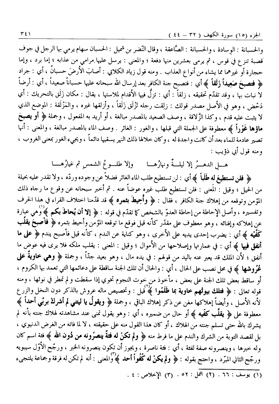 وَالْحُسْبَانَةُ: الْوِسَادَةُ، وَالْحُسْبَانَةُ: الصَّاعِقَةُ، وَقَالَ النَّضْرُ بْنُ شُمَيْلٍ: الْحُسْبَانُ سِهَامٌ يَرْمِي بِهَا الرَّجُلُ فِي جَوْفِ قَصَبَةٍ تُنْزَعُ فِي قَوْسٍ، ثُمَّ يَرْمِي بِعِشْرِينَ مِنْهَا دُفْعَةً وَالْمَعْنَى: يُرْسِلُ عَلَيْهَا مَرَامِيَ مِنْ عَذَابِهِ إِمَّا بَرْدٌ، وَإِمَّا حِجَارَةٌ أَوْ غَيْرُهُمَا مِمَّا يَشَاءُ مِنْ أَنْوَاعِ الْعَذَابِ. وَمِنْهُ قول زِيَادٍ الْكِلَابِيِّ: أَصَابَ الْأَرْضَ حُسْبَانٌ، أَيْ: جَرَادٌ فَتُصْبِحَ صَعِيداً زَلَقاً أَيْ: فَتُصْبِحَ جَنَّةُ الْكَافِرِ بَعْدَ إِرْسَالِ اللَّهِ سُبْحَانَهُ عَلَيْهَا حُسْبَانًا صَعِيدًا، أَيْ: أَرْضًا لَا نَبَاتَ بِهَا، وَقَدْ تَقَدَّمَ تحقيقه، زلقا: أي: تزلّ فِيهَا الْأَقْدَامُ لِمَلَاسَتِهَا، يُقَالُ: مَكَانٌ زَلَقٌ بِالتَّحْرِيكِ: أَيْ دَحْضٌ، وَهُوَ فِي الْأَصْلِ مَصْدَرُ قَوْلِكَ: زَلَقَتْ رِجْلُهُ تَزْلَقُ زَلَقًا، وَأَزْلَقَهَا غَيْرُهُ، وَالْمَزْلَقَةُ: الْمَوْضِعُ الَّذِي لَا يَثْبُتُ عَلَيْهِ قَدَمٌ، وَكَذَا الزَّلَّاقَةُ، وَصَفَ الصَّعِيدَ بِالْمَصْدَرِ مُبَالَغَةً، أَوْ أُرِيدَ بِهِ الْمَفْعُولُ، وَجُمْلَةُ أَوْ يُصْبِحَ ماؤُها غَوْراً مَعْطُوفَةٌ عَلَى الْجُمْلَةِ الَّتِي قَبْلَهَا، وَالْغَوْرُ: الْغَائِرُ. وَصَفَ الْمَاءَ بِالْمَصْدَرِ مُبَالَغَةً، وَالْمَعْنَى: أَنَّهَا تَصِيرُ عَادِمَةً لِلْمَاءِ بَعْدَ أَنْ كَانَتْ وَاجِدَةً لَهُ، وَكَانَ خِلَالَهَا ذَلِكَ النَّهْرُ يَسْقِيهَا دَائِمًا، وَيَجِيءُ الْغَوْرُ بِمَعْنَى الْغُرُوبِ، وَمِنْهُ قَوْلُ أَبِي ذُؤَيْبٍ: