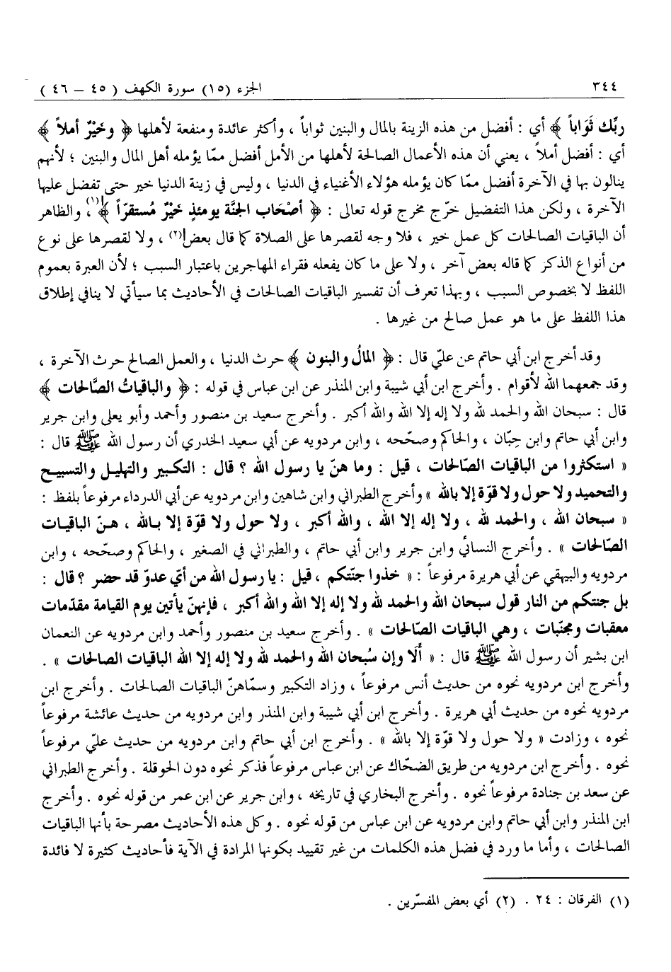 وَقَدْ أَخْرَجَ ابْنُ أَبِي حَاتِمٍ عَنْ عَلِيِّ قَالَ: الْمالُ وَالْبَنُونَ حَرْثُ الدُّنْيَا، وَالْعَمَلُ الصَّالِحُ حَرْثُ الْآخِرَةِ، وَقَدْ جَمَعَهُمَا اللَّهُ لِأَقْوَامٍ. وَأَخْرَجَ ابْنُ أَبِي شَيْبَةَ وَابْنُ الْمُنْذِرِ عَنِ ابْنِ عَبَّاسٍ فِي قَوْلِهِ: وَالْباقِياتُ الصَّالِحاتُ قَالَ: سُبْحَانَ اللَّهِ وَالْحَمْدُ لِلَّهِ وَلَا إِلَهَ إِلَّا اللَّهُ وَاللَّهُ أَكْبَرُ. وَأَخْرَجَ سَعِيدُ بْنُ مَنْصُورٍ وَأَحْمَدُ وَأَبُو يَعْلَى وَابْنُ جَرِيرٍ وَابْنُ أَبِي حَاتِمٍ وَابْنُ حِبَّانَ، وَالْحَاكِمُ وَصَحَّحَهُ، وَابْنُ مَرْدَوَيْهِ عَنْ أَبِي سَعِيدٍ الْخُدْرِيِّ أَنَّ رَسُولَ اللَّهِ صَلَّى اللَّهُ عَلَيْهِ وَسَلَّمَ قَالَ: