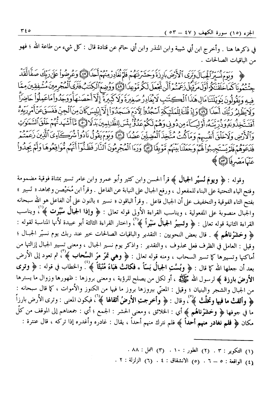 وَحَشَرْناهُمْ. قَالَ بَعْضُ النَّحْوِيِّينَ: التَّقْدِيرُ وَالْبَاقِيَاتُ الصَّالِحَاتُ خَيْرٌ عِنْدَ رَبِّكَ يَوْمَ نُسَيِّرُ الْجِبَالَ وَقِيلَ: الْعَامِلُ فِي الظَّرْفِ فِعْلٌ مَحْذُوفٌ، وَالتَّقْدِيرُ: وَاذْكُرْ يَوْمَ نُسَيِّرُ الْجِبَالَ، وَمَعْنَى تَسْيِيرِ الْجِبَالِ إِزَالَتُهَا مِنْ أَمَاكِنِهَا وَتَسْيِيرُهَا كَمَا تَسِيرُ السَّحَابُ، وَمِنْهُ قَوْلُهُ تَعَالَى: وَهِيَ تَمُرُّ مَرَّ السَّحابِ «3» ، ثُمَّ تَعُودُ إِلَى الْأَرْضِ بَعْدَ أَنْ جَعَلَهَا اللَّهُ كَمَا قَالَ: وَبُسَّتِ الْجِبالُ بَسًّا- فَكانَتْ هَباءً مُنْبَثًّا «4» . والخطاب في قوله: وَتَرَى الْأَرْضَ بارِزَةً لِرَسُولِ اللَّهِ صَلَّى اللَّهُ عَلَيْهِ وَسَلَّمَ، أَوْ لِكُلِّ مَنْ يَصْلُحُ لِلرُّؤْيَةِ، وَمَعْنَى بُرُوزِهَا: ظُهُورُهَا وَزَوَالُ مَا يَسْتُرُهَا مِنَ الْجِبَالِ وَالشَّجَرِ وَالْبُنْيَانِ وَقِيلَ: الْمَعْنَى بِبُرُوزِهَا بُرُوزُ مَا فِيهَا مِنَ الْكُنُوزِ وَالْأَمْوَاتِ، كَمَا قَالَ سُبْحَانَهُ: