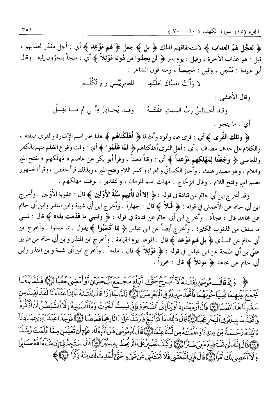 وَإِذْ قالَ مُوسى لِفَتاهُ لَا أَبْرَحُ حَتَّى أَبْلُغَ مَجْمَعَ الْبَحْرَيْنِ أَوْ أَمْضِيَ حُقُباً (60) فَلَمَّا بَلَغا مَجْمَعَ بَيْنِهِما نَسِيا حُوتَهُما فَاتَّخَذَ سَبِيلَهُ فِي الْبَحْرِ سَرَباً (61) فَلَمَّا جاوَزا قالَ لِفَتاهُ آتِنا غَداءَنا لَقَدْ لَقِينا مِنْ سَفَرِنا هَذَا نَصَباً (62) قالَ أَرَأَيْتَ إِذْ أَوَيْنا إِلَى الصَّخْرَةِ فَإِنِّي نَسِيتُ الْحُوتَ وَما أَنْسانِيهُ إِلاَّ الشَّيْطانُ أَنْ أَذْكُرَهُ وَاتَّخَذَ سَبِيلَهُ فِي الْبَحْرِ عَجَباً (63) قالَ ذلِكَ مَا كُنَّا نَبْغِ فَارْتَدَّا عَلى آثارِهِما قَصَصاً (64)