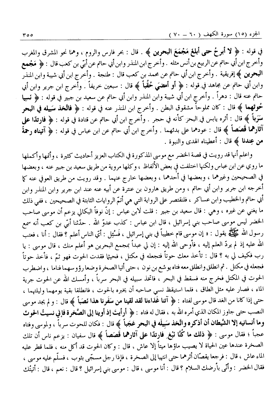 وَاعْلَمْ أَنَّهَا قَدْ رُوِيَتْ فِي قِصَّةِ الْخَضِرِ مَعَ مُوسَى الْمَذْكُورَةِ فِي الْكِتَابِ الْعَزِيزِ أَحَادِيثُ كَثِيرَةٌ، وَأَتَمُّهَا وَأَكْمَلُهَا مَا رُوِيَ عَنِ ابْنِ عَبَّاسٍ وَلَكِنَّهَا اخْتَلَفَتْ فِي بَعْضِ الْأَلْفَاظِ، وَكُلُّهَا مَرْوِيَّةٌ مِنْ طَرِيقِ سَعِيدِ بْنِ جُبَيْرٍ عَنْهُ، وَبَعْضُهَا فِي الصَّحِيحَيْنِ وَغَيْرِهِمَا، وَبَعْضُهَا فِي أَحَدِهِمَا، وَبَعْضُهَا خَارِجٌ عَنْهُمَا. وَقَدْ رُوِيَتْ مِنْ طَرِيقِ الْعَوْفِيِّ عَنْهُ كَمَا أَخْرَجَهُ ابْنُ جَرِيرٍ وَابْنُ أَبِي حَاتِمٍ، وَمِنْ طَرِيقِ هَارُونَ بْنِ عَنْتَرَةَ عَنْ أَبِيهِ عَنْهُ عِنْدَ ابْنُ جَرِيرٍ وَابْنُ الْمُنْذِرِ وَابْنُ أَبِي حَاتِمٍ وَالْخَطِيبِ وَابْنِ عَسَاكِرَ، فَلْنَقْتَصِرْ عَلَى الرِّوَايَةِ الَّتِي هِيَ أَتَمُّ الرِّوَايَاتِ الثَّابِتَةِ فِي الصَّحِيحَيْنِ، فَفِي ذَلِكَ مَا يُغْنِي عَنْ غَيْرِهِ، وَهِيَ: قَالَ سَعِيدُ بْنُ جُبَيْرٍ: قُلْتُ لِابْنِ عَبَّاسٍ: إِنَّ نَوْفًا الَبِكَالِيَّ يَزْعُمُ أَنَّ مُوسَى صَاحِبَ الْخَضِرِ لَيْسَ مُوسَى صَاحِبَ بَنِي إِسْرَائِيلَ، قَالَ ابْنُ عَبَّاسٍ: كَذِبَ عَدُوُّ اللَّهِ. حَدَّثَنَا أُبِيُّ بْنُ كَعْبٍ أَنَّهُ سَمِعَ رَسُولَ اللَّهِ صَلَّى اللَّهُ عَلَيْهِ وَسَلَّمَ يَقُولُ: «إِنَّ مُوسَى قَامَ خَطِيبًا فِي بَنِي إِسْرَائِيلَ، فَسُئِلَ: أَيُّ النَّاسِ أَعْلَمُ؟ فَقَالَ: أَنَا، فَعَتَبَ اللَّهُ عَلَيْهِ إِذْ لَمْ يَرُدَّ الْعِلْمَ إِلَيْهِ، فَأَوْحَى اللَّهُ إِلَيْهِ: إِنَّ لِي عَبْدًا بِمَجْمَعِ الْبَحْرَيْنِ هُوَ أَعْلَمُ مِنْكَ، قَالَ مُوسَى: يَا رَبِّ فَكَيْفَ لِي بِهِ؟ قَالَ: تَأْخُذُ مَعَكَ حُوتًا فَتَجْعَلُهُ فِي مِكْتَلٍ، فَحَيْثُمَا فَقَدْتَ الْحُوتَ فَهُوَ ثَمَّ، فَأَخَذَ حُوتًا فَجَعَلَهُ فِي مِكْتَلٍ. ثُمَّ انْطَلَقَ وَانْطَلَقَ مَعَهُ فَتَاهُ يوشع بن نون، حتى أتيا الصخرة وضعا رؤوسهما فَنَامَا، وَاضْطَرَبَ الْحُوتُ فِي الْمِكْتَلِ فَخَرَجَ مِنْهُ فَسَقَطَ فِي الْبَحْرِ، فَاتَّخَذَ سَبِيلَهُ فِي الْبَحْرِ سَرَبًا، وَأَمْسَكَ اللَّهُ عَنِ الْحُوتِ جَرْيَةَ الْمَاءِ، فَصَارَ عَلَيْهِ مِثْلُ الطَّاقِ، فَلَمَّا اسْتَيْقَظَ نَسِيَ صَاحِبُهُ أَنْ يُخْبِرَهُ بِالْحُوتِ، فَانْطَلَقَا بَقِيَّةَ يَوْمِهِمَا وَلَيْلَتِهِمَا، حَتَّى إِذَا كَانَا مِنَ الْغَدِ قَالَ مُوسَى لِفَتَاهُ: آتِنا غَداءَنا لَقَدْ لَقِينا مِنْ سَفَرِنا هَذَا نَصَباً قَالَ: وَلَمْ يَجِدْ مُوسَى النَّصَبَ حَتَّى جَاوَزَ الْمَكَانَ الَّذِي أَمَرَهُ اللَّهُ بِهِ، فَقَالَ لَهُ فَتَاهُ: أَرَأَيْتَ إِذْ أَوَيْنا إِلَى الصَّخْرَةِ فَإِنِّي نَسِيتُ الْحُوتَ وَما أَنْسانِيهُ إِلَّا الشَّيْطانُ أَنْ أَذْكُرَهُ وَاتَّخَذَ سَبِيلَهُ فِي الْبَحْرِ عَجَباً قَالَ: فَكَانَ لِلْحُوتِ سَرَبًا، وَلِمُوسَى وَفَتَاهُ عَجَبًا فَقَالَ مُوسَى: ذلِكَ مَا كُنَّا نَبْغِ فَارْتَدَّا عَلى آثارِهِما قَصَصاً قَالَ سُفْيَانُ: يَزْعُمُ نَاسٌ أَنَّ تِلْكَ الصَّخْرَةَ عِنْدَهَا عَيْنُ الْحَيَاةِ لَا يُصِيبُ مَاؤُهَا مَيْتًا إِلَّا عَاشَ، قَالَ: وَكَانَ الْحُوتُ قَدْ أُكِلَ مِنْهُ، فَلَمَّا قُطِّرَ عَلَيْهِ الْمَاءُ عَاشَ، قَالَ: فَرَجَعَا يَقُصَّانِ أَثَرَهُمَا حَتَّى انْتَهَيَا إِلَى الصَّخْرَةِ، فَإِذَا رَجُلٌ مُسْجًى بِثَوْبٍ، فَسَلَّمَ عَلَيْهِ مُوسَى، فَقَالَ الْخَضِرُ: وَأَنَّى بِأَرْضِكَ السَّلَامُ؟ قَالَ: أَنَا مُوسَى، قَالَ: مُوسَى بَنِي إِسْرَائِيلَ؟ قَالَ: نَعَمْ، قَالَ: أَتَيْتُكَ