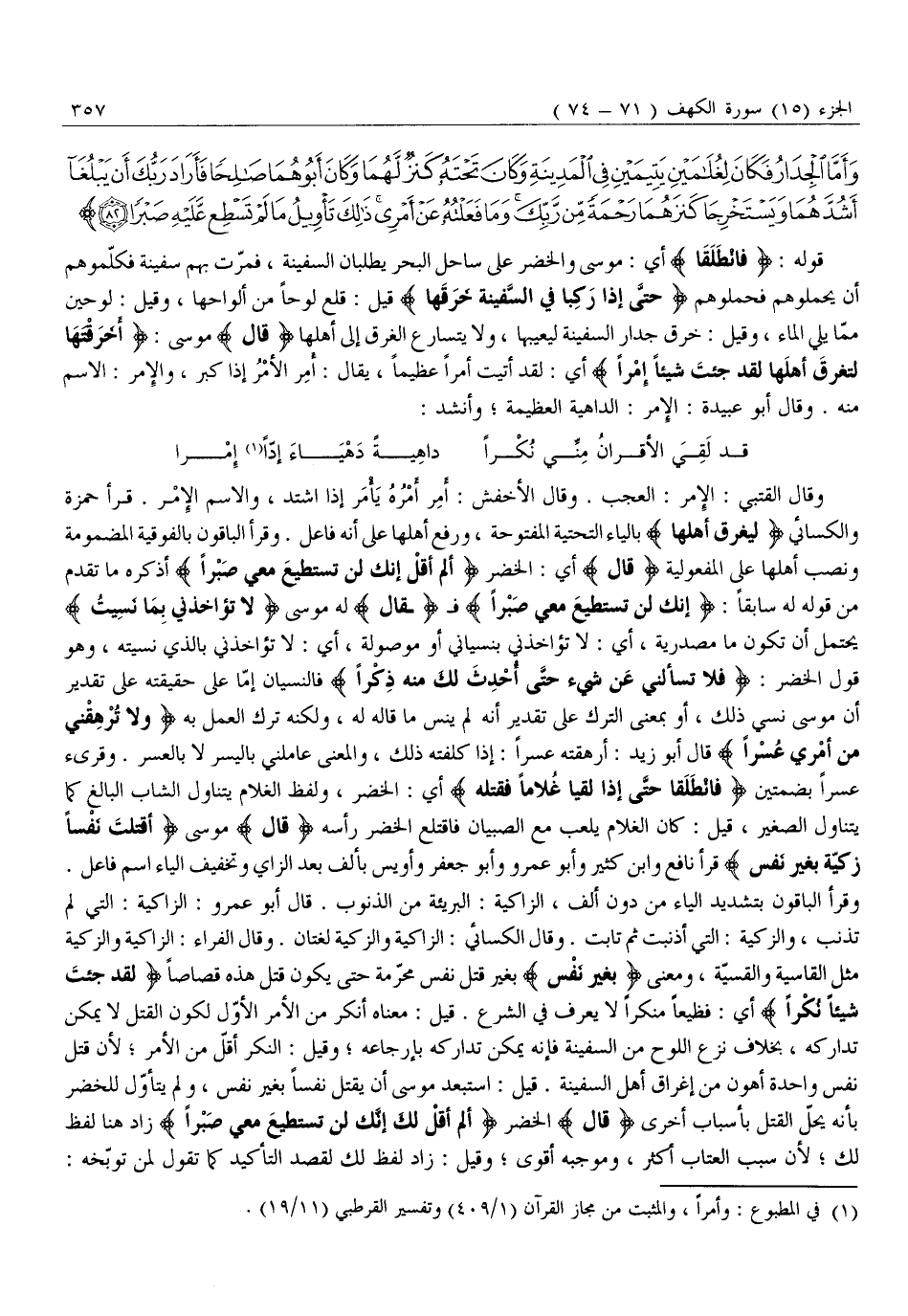وقال القتبي: الْأَمْرُ: الْعَجَبُ. وَقَالَ الْأَخْفَشُ: أَمِرَ أَمْرُهُ يَأْمُرُ إِذَا اشْتَدَّ، وَالِاسْمُ الْأَمْرُ. قَرَأَ حَمْزَةُ وَالْكِسَائِيُّ لِيَغْرَقَ أَهْلُهَا بِالْيَاءِ التَّحْتِيَّةِ الْمَفْتُوحَةِ، وَرَفْعِ أَهْلِهَا عَلَى أَنَّهُ فَاعِلٌ. وَقَرَأَ الْبَاقُونَ بِالْفَوْقِيَّةِ الْمَضْمُومَةِ وَنَصْبِ أَهْلِهَا عَلَى الْمَفْعُولِيَّةِ قالَ أَيْ: الْخَضِرُ أَلَمْ أَقُلْ إِنَّكَ لَنْ تَسْتَطِيعَ مَعِيَ صَبْراً أَذْكَرَهُ مَا تَقَدَّمَ مِنْ قَوْلِهِ لَهُ سَابِقًا: إِنَّكَ لَنْ تَسْتَطِيعَ مَعِيَ صَبْراً ف قالَ لَهُ مُوسَى لَا تُؤاخِذْنِي بِما نَسِيتُ يُحْتَمَلُ أَنْ تَكُونَ مَا مَصْدَرِيَّةً، أَيْ: لَا تُؤَاخِذْنِي بِنِسْيَانِي أَوْ مَوْصُولَةً، أَيْ: لَا تُؤَاخِذْنِي بِالَّذِي نسيته، وهو قول الخضر: فَلا تَسْئَلْنِي عَنْ شَيْءٍ حَتَّى أُحْدِثَ لَكَ مِنْهُ ذِكْراً فَالنِّسْيَانُ إِمَّا عَلَى حَقِيقَتِهِ عَلَى تَقْدِيرِ أَنَّ مُوسَى نَسِيَ ذَلِكَ، أَوْ بِمَعْنَى التَّرْكِ عَلَى تَقْدِيرِ أَنَّهُ لَمْ يَنْسَ مَا قَالَهُ لَهُ، وَلَكِنَّهُ تَرَكَ الْعَمَلَ بِهِ وَلا تُرْهِقْنِي مِنْ أَمْرِي عُسْراً قَالَ أَبُو زَيْدٍ: أَرْهَقْتُهُ عُسْرًا: إِذَا كَلَّفْتَهُ ذَلِكَ، وَالْمَعْنَى عَامِلْنِي بِالْيُسْرِ لَا بِالْعُسْرِ. وَقُرِئَ عُسُرًا بِضَمَّتَيْنِ فَانْطَلَقا حَتَّى إِذا لَقِيا غُلاماً فَقَتَلَهُ أَيْ: الْخَضِرُ، وَلَفْظُ الْغُلَامِ يَتَنَاوَلُ الشَّابَّ الْبَالِغَ كَمَا يَتَنَاوَلُ الصَّغِيرَ، قِيلَ: كَانَ الْغُلَامُ يَلْعَبُ مَعَ الصِّبْيَانِ فَاقْتَلَعَ الْخَضِرُ رَأْسَهُ قالَ مُوسَى أَقَتَلْتَ نَفْساً زَكِيَّةً بِغَيْرِ نَفْسٍ قَرَأَ نَافِعٌ وَابْنُ كَثِيرٍ وَأَبُو عَمْرٍو وَأَبُو جَعْفَرٍ وَأُوَيْسٌ بِأَلِفٍ بَعْدَ الزَّايِ وَتَخْفِيفِ الْيَاءِ اسْمُ فَاعِلٍ.
