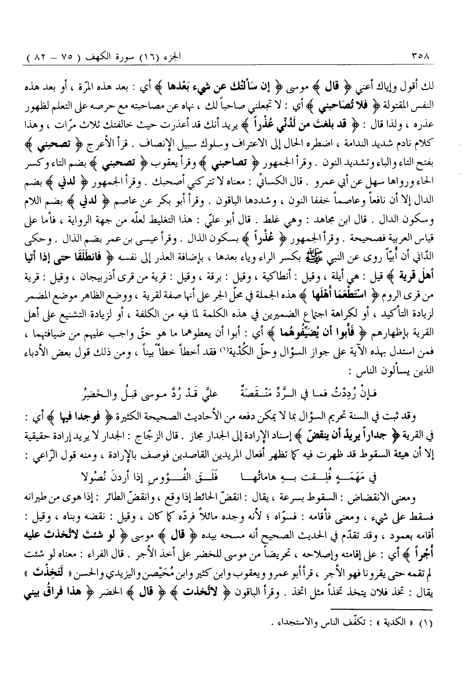 لَكَ أَقُولُ وَإِيَّاكَ أَعْنِي قالَ مُوسَى إِنْ سَأَلْتُكَ عَنْ شَيْءٍ بَعْدَها أَيْ: بَعْدَ هَذِهِ الْمَرَّةِ، أَوْ بَعْدَ هَذِهِ النَّفْسِ الْمَقْتُولَةِ فَلا تُصاحِبْنِي أَيْ: لَا تَجْعَلْنِي صَاحِبًا لَكَ، نَهَاهُ عَنْ مُصَاحَبَتِهِ مَعَ حِرْصِهِ عَلَى التَّعَلُّمِ لِظُهُورِ عُذْرِهِ، وَلِذَا قَالَ: قَدْ بَلَغْتَ مِنْ لَدُنِّي عُذْراً يُرِيدُ أَنَّكَ قَدْ أَعْذَرْتَ حَيْثُ خَالَفْتُكَ ثَلَاثَ مَرَّاتٍ، وَهَذَا كَلَامُ نَادِمٍ شَدِيدِ النَّدَامَةِ، اضْطَرَّهُ الْحَالُ إِلَى الِاعْتِرَافِ وَسُلُوكِ سَبِيلِ الْإِنْصَافِ. قَرَأَ الْأَعْرَجُ تَصْحَبَنِّي بِفَتْحِ التَّاءِ وَالْبَاءِ وَتَشْدِيدِ النُّونِ. وَقَرَأَ الْجُمْهُورُ تُصاحِبْنِي وَقَرَأَ يَعْقُوبُ تُصْحِبْنِي بِضَمِّ التَّاءِ وَكَسْرِ الْحَاءِ وَرَوَاهَا سَهْلٌ عَنْ أَبِي عَمْرٍو. قَالَ الْكِسَائِيُّ: مَعْنَاهُ لَا تَتْرُكْنِي أَصْحَبُكَ. وَقَرَأَ الْجُمْهُورُ لَدُنِّي بِضَمِّ الدَّالِ إِلَّا أَنَّ نَافِعًا وَعَاصِمًا خَفَّفَا النُّونَ، وَشَدَّدَهَا الْبَاقُونَ. وَقَرَأَ أَبُو بَكْرٍ عَنْ عَاصِمٍ لَدُنِّي بِضَمِّ اللَّامِ وَسُكُونِ الدَّالِ. قَالَ ابْنُ مُجَاهِدٍ: وَهِيَ غَلَطٌ. قَالَ أَبُو عَلِيٍّ: هَذَا التَّغْلِيطُ لَعَلَّهُ مِنْ جِهَةِ الرِّوَايَةِ، فَأَمَّا عَلَى قِيَاسِ الْعَرَبِيَّةِ فَصَحِيحَةٌ. وَقَرَأَ الْجُمْهُورُ عُذْراً بِسُكُونِ الذَّالِ. وَقَرَأَ عِيسَى بْنُ عُمَرَ بِضَمِّ الذَّالِ. وَحَكَى الدَّانِيُّ أَنَّ أُبَيًّا رُوِيَ عَنِ النَّبِيِّ صَلَّى اللَّهُ عَلَيْهِ وَسَلَّمَ بِكَسْرِ الرَّاءِ وَيَاءٍ بَعْدَهَا، بِإِضَافَةِ الْعُذْرِ إِلَى نَفْسِهِ فَانْطَلَقا حَتَّى إِذا أَتَيا أَهْلَ قَرْيَةٍ قِيلَ: هِيَ أَيْلَةُ، وَقِيلَ: أَنْطَاكِيَةُ، وَقِيلَ: بَرْقَةُ، وَقِيلَ: قَرْيَةٌ مِنْ قُرَى أَذْرَبِيجَانَ، وَقِيلَ: قَرْيَةٌ مِنْ قُرَى الرُّومِ اسْتَطْعَما أَهْلَها هَذِهِ الْجُمْلَةُ فِي مَحَلِّ الْجَرِّ عَلَى أَنَّهَا صِفَةٌ لقرية، وَوُضِعَ الظَّاهِرُ مَوْضِعَ الْمُضْمَرِ لِزِيَادَةِ التَّأْكِيدِ، أَوْ لِكَرَاهَةِ اجْتِمَاعِ الضَّمِيرَيْنِ فِي هَذِهِ الْكَلِمَةِ لِمَا فِيهِ مِنَ الْكُلْفَةِ، أَوْ لِزِيَادَةِ التَّشْنِيعِ عَلَى أَهْلِ الْقَرْيَةِ بِإِظْهَارِهِمْ فَأَبَوْا أَنْ يُضَيِّفُوهُما أَيْ: أَبَوْا أَنْ يُعْطُوهُمَا مَا هُوَ حَقٌّ وَاجِبٌ عَلَيْهِمْ مِنْ ضِيَافَتِهِمَا، فَمَنِ اسْتَدَلَّ بِهَذِهِ الْآيَةِ عَلَى جَوَازِ السُّؤَالِ وَحِلِّ الْكُدْيَةِ «1» فَقَدْ أَخْطَأَ خَطَأً بَيِّنًا، وَمِنْ ذَلِكَ قَوْلُ بَعْضِ الْأُدَبَاءِ الَّذِينَ يَسْأَلُونَ النَّاسَ: