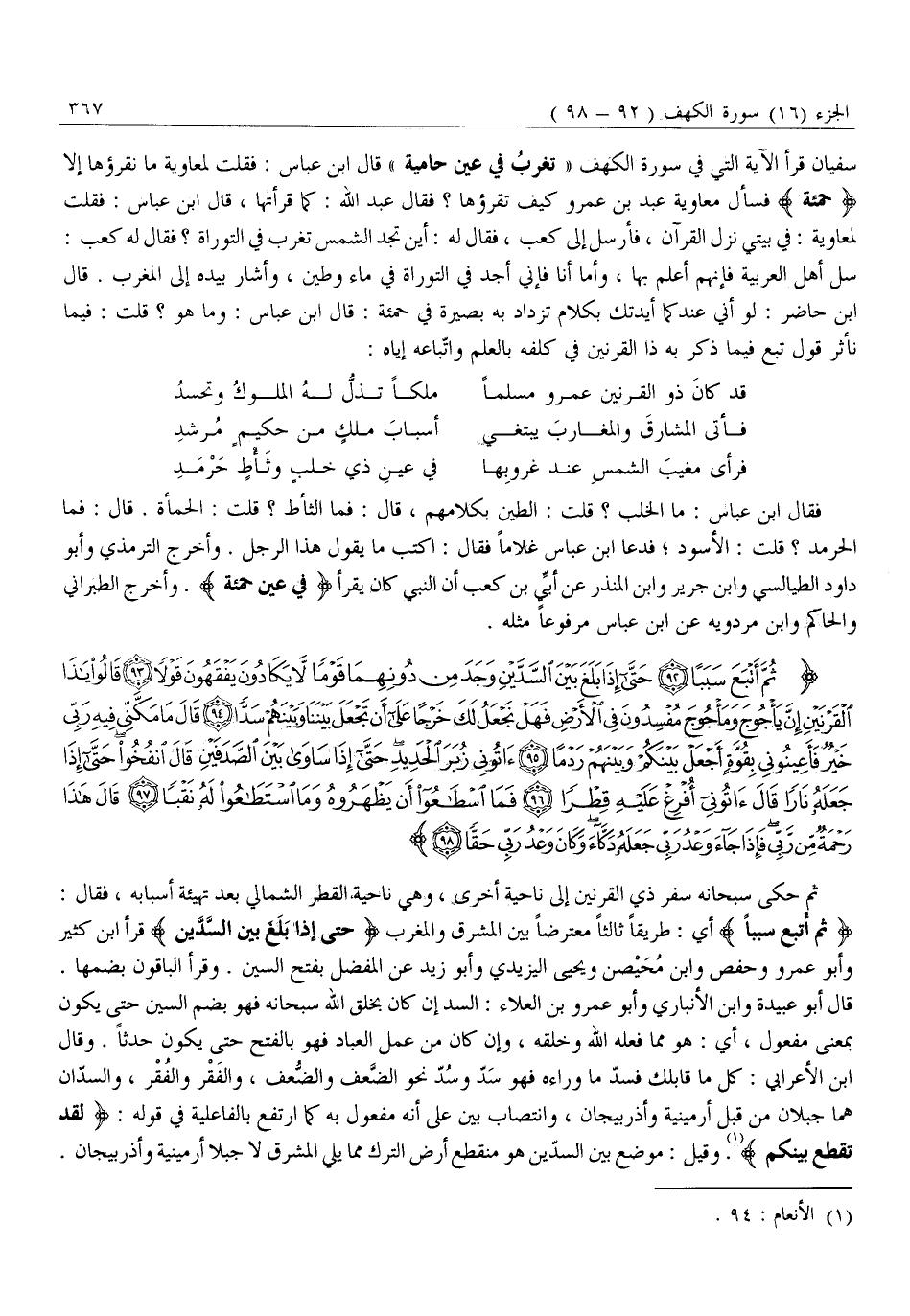 سُفْيَانَ قَرَأَ الْآيَةَ الَّتِي فِي سُورَةِ الْكَهْفِ «تَغْرُبُ فِي عَيْنٍ حَامِيَةٍ» قَالَ ابْنُ عباس: فقلت لمعاوية ما نقرؤها إلا حَمِئَةٍ فسأل معاوية عبد بْنَ عَمْرٍو كَيْفَ تَقْرَؤُهَا؟ فَقَالَ عَبْدُ اللَّهِ: كَمَا قَرَأْتَهَا، قَالَ ابْنُ عَبَّاسٍ: فَقُلْتُ لِمُعَاوِيَةَ: فِي بَيْتِي نَزَلَ الْقُرْآنُ، فَأَرْسَلَ إِلَى كَعْبٍ، فَقَالَ لَهُ: أَيْنَ تَجِدُ الشَّمْسَ تَغْرُبُ فِي التَّوْرَاةِ؟ فَقَالَ لَهُ كَعْبٌ: