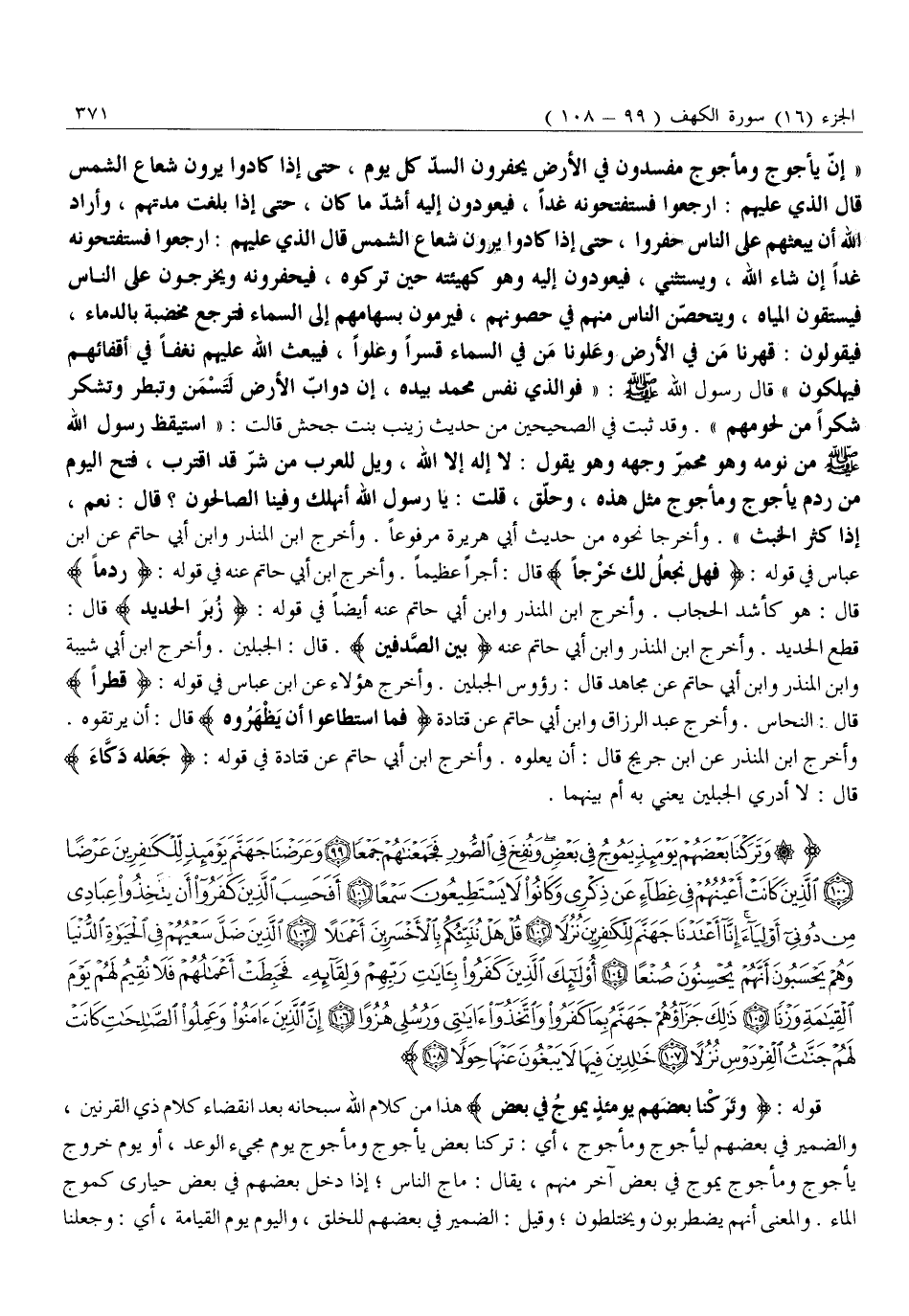 «إِنَّ يَأْجُوجَ وَمَأْجُوجَ مُفْسِدُونَ فِي الْأَرْضِ يَحْفِرُونَ السَّدَّ كُلَّ يَوْمٍ، حَتَّى إِذَا كَادُوا يَرَوْنَ شُعَاعَ الشَّمْسِ قَالَ الَّذِي عَلَيْهِمْ: ارْجِعُوا فَسَتَفْتَحُونَهُ غَدًا، فَيَعُودُونَ إِلَيْهِ أَشَدَّ مَا كَانَ، حَتَّى إِذَا بَلَغَتْ مُدَّتُهُمْ، وَأَرَادَ اللَّهُ أَنْ يَبْعَثَهُمْ عَلَى النَّاسِ حَفَرُوا، حَتَّى إِذَا كَادُوا يَرَوْنَ شُعَاعَ الشَّمْسِ قَالَ الَّذِي عَلَيْهِمْ: ارْجِعُوا فَسَتَفْتَحُونَهُ غَدًا إِنْ شَاءَ اللَّهُ، وَيَسْتَثْنِي، فَيَعُودُونَ إِلَيْهِ وَهُوَ كَهَيْئَتِهِ حِينَ تَرَكُوهُ، فَيَحْفِرُونَهُ وَيَخْرُجُونَ عَلَى النَّاسِ فَيَسْتَقُونَ الْمِيَاهَ، وَيَتَحَصَّنُ النَّاسُ مِنْهُمْ فِي حُصُونِهِمْ، فَيَرْمُونَ بِسِهَامِهِمْ إِلَى السَّمَاءِ فَتَرْجِعُ مُخَضَّبَةً بِالدِّمَاءِ، فَيَقُولُونَ: قَهَرْنَا مَنْ فِي الْأَرْضِ وَعَلَوْنَا مَنْ فِي السَّمَاءِ قَسْرًا وَعُلُوًّا، فَيَبْعَثُ اللَّهُ عَلَيْهِمْ نَغَفًا فِي أَقْفَائِهِمْ فَيَهْلِكُونَ» قَالَ رَسُولُ اللَّهِ صَلَّى اللَّهُ عَلَيْهِ وَسَلَّمَ: «فو الذي نَفْسُ مُحَمَّدٍ بِيَدِهِ، إِنَّ دَوَابَّ الْأَرْضِ لَتَسْمَنُ وَتَبْطَرُ وَتَشْكُرُ شُكْرًا مِنْ لُحُومِهِمْ» . وَقَدْ ثَبَتَ فِي الصَّحِيحَيْنِ مِنْ حَدِيثِ زَيْنَبَ بِنْتَ جَحْشٍ قَالَتِ: «اسْتَيْقَظَ رَسُولِ اللَّهِ صَلَّى اللَّهُ عَلَيْهِ وَسَلَّمَ مِنْ نَوْمِهِ وَهُوَ مُحْمَرٌّ وَجْهُهُ وَهُوَ يَقُولُ: لَا إِلَهَ إِلَّا اللَّهُ، وَيْلٌ لِلْعَرَبِ مِنْ شَرٍّ قَدِ اقْتَرَبَ، فُتِحَ الْيَوْمَ مِنْ رَدْمِ يَأْجُوجَ وَمَأْجُوجَ مِثْلُ هَذِهِ، وَحَلَّقَ، قُلْتُ: يَا رَسُولَ اللَّهِ أَنَهْلَكُ وَفِينَا الصَّالِحُونَ؟ قَالَ: نَعَمْ، إِذَا كَثُرَ الْخَبَثُ» . وَأَخْرَجَا نَحْوَهُ مِنْ حَدِيثِ أَبِي هُرَيْرَةَ مَرْفُوعًا. وَأَخْرَجَ ابْنُ الْمُنْذِرِ وَابْنُ أَبِي حَاتِمٍ عَنِ ابن عباس في قَوْلِهِ: فَهَلْ نَجْعَلُ لَكَ خَرْجاً قَالَ: أَجْرًا عَظِيمًا. وَأَخْرَجَ ابْنُ أَبِي حَاتِمٍ عَنْهُ فِي قَوْلِهِ: رَدْماً قَالَ: هُوَ كَأَشَدِّ الْحِجَابِ. وَأَخْرَجَ ابْنُ الْمُنْذِرِ وَابْنُ أَبِي حَاتِمٍ عَنْهُ أَيْضًا فِي قَوْلِهِ: زُبَرَ الْحَدِيدِ قَالَ: