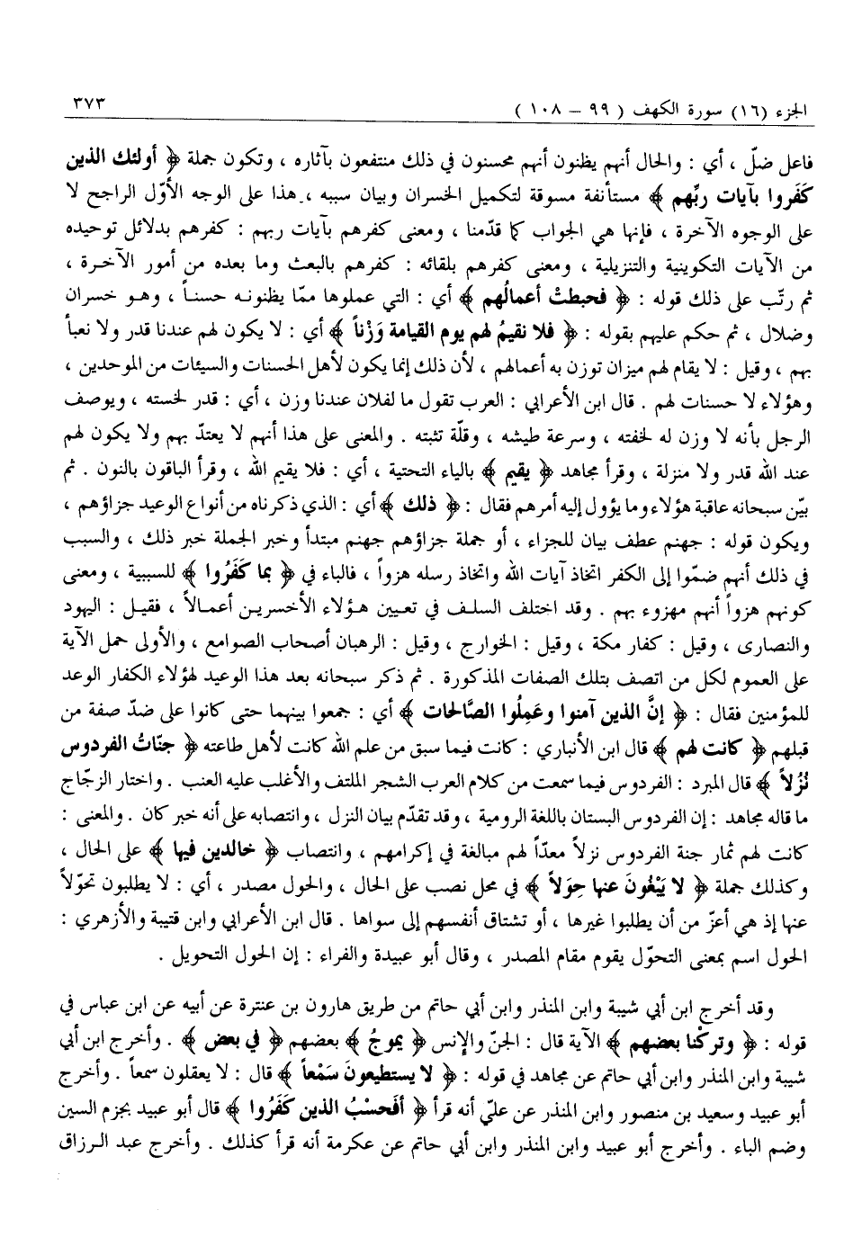 فَاعِلِ ضَلَّ، أَيْ: وَالْحَالُ أَنَّهُمْ يَظُنُّونَ أَنَّهُمْ مُحْسِنُونَ فِي ذَلِكَ مُنْتَفِعُونَ بِآثَارِهِ، وَتَكُونُ جُمْلَةُ أُولئِكَ الَّذِينَ كَفَرُوا بِآياتِ رَبِّهِمْ مُسْتَأْنَفَةً مَسُوقَةً لِتَكْمِيلِ الْخُسْرَانِ وَبَيَانِ سَبَبِهِ، هَذَا عَلَى الْوَجْهِ الأوّل الراجح لا على الوجوه الآخرة، فَإِنَّهَا هِيَ الْجَوَابُ كَمَا قَدَّمْنَا، وَمَعْنَى كُفْرِهِمْ بِآيَاتِ رَبِّهِمْ: كُفْرُهُمْ بِدَلَائِلِ تَوْحِيدِهِ مِنَ الْآيَاتِ التَّكْوِينِيَّةِ وَالتَّنْزِيلِيَّةِ، وَمَعْنَى كُفْرِهِمْ بِلِقَائِهِ: كُفْرُهُمْ بِالْبَعْثِ وَمَا بَعْدَهُ مِنْ أُمُورِ الْآخِرَةِ، ثُمَّ رَتَّبَ عَلَى ذَلِكَ قَوْلَهُ: فَحَبِطَتْ أَعْمالُهُمْ أَيْ: الَّتِي عَمِلُوهَا مِمَّا يَظُنُّونَهُ حَسَنًا، وَهُوَ خُسْرَانٌ وَضَلَالٌ، ثُمَّ حَكَمَ عَلَيْهِمْ بِقَوْلِهِ: فَلا نُقِيمُ لَهُمْ يَوْمَ الْقِيامَةِ وَزْناً أَيْ: لَا يَكُونُ لَهُمْ عِنْدَنَا قَدْرٌ وَلَا نَعْبَأُ بِهِمْ، وَقِيلَ: لَا يُقَامُ لَهُمْ مِيزَانٌ تُوزَنُ بِهِ أَعْمَالُهُمْ، لِأَنَّ ذَلِكَ إِنَّمَا يَكُونُ لِأَهْلِ الْحَسَنَاتِ وَالسَّيِّئَاتِ مِنَ الْمُوَحِّدِينَ، وَهَؤُلَاءِ لَا حَسَنَاتٍ لَهُمْ. قَالَ ابْنُ الْأَعْرَابِيِّ: الْعَرَبُ تَقُولُ مَا لِفُلَانٍ عِنْدَنَا وَزْنٌ، أَيْ: قَدْرٌ لِخِسَّتِهِ، وَيُوصَفُ الرَّجُلُ بِأَنَّهُ لَا وَزْنَ لَهُ لِخِفَّتِهِ، وَسُرْعَةِ طَيْشِهِ، وَقِلَّةِ تَثَبُّتِهِ. وَالْمَعْنَى عَلَى هَذَا أَنَّهُمْ لَا يُعْتَدُّ بِهِمْ وَلَا يَكُونُ لَهُمْ عِنْدَ اللَّهِ قَدْرٌ وَلَا مَنْزِلَةٌ، وَقَرَأَ مُجَاهِدٌ يُقِيمُ بِالْيَاءِ التَّحْتِيَّةِ، أَيْ: فَلَا يُقِيمُ اللَّهُ، وَقَرَأَ الْبَاقُونَ بِالنُّونِ. ثُمَّ بَيَّنَ سُبْحَانَهُ عَاقِبَةَ هَؤُلَاءِ وَمَا يَؤُولُ إِلَيْهِ أَمْرُهُمْ فَقَالَ: ذلِكَ أَيْ: الَّذِي ذَكَرْنَاهُ مِنْ أَنْوَاعِ الْوَعِيدِ جَزَاؤُهُمْ، وَيَكُونُ قَوْلُهُ: جَهَنَّمُ عَطْفَ بَيَانٍ لِلْجَزَاءِ، أَوْ جُمْلَةُ جَزَاؤُهُمْ جَهَنَّمُ مُبْتَدَأٌ وخبر الجملة خَبَرُ ذَلِكَ، وَالسَّبَبُ فِي ذَلِكَ أَنَّهُمْ ضَمُّوا إِلَى الْكُفْرِ اتِّخَاذَ آيَاتِ اللَّهِ وَاتِّخَاذَ رُسُلِهِ هُزُوًا، فَالْبَاءُ فِي بِما كَفَرُوا لِلسَّبَبِيَّةِ، وَمَعْنَى كَوْنِهِمْ هُزُوًا أَنَّهُمْ مَهْزُوءٌ بِهِمْ. وَقَدِ اخْتَلَفَ السَّلَفُ فِي تَعْيِينِ هَؤُلَاءِ الْأَخْسَرِينَ أَعْمَالًا، فَقِيلَ: الْيَهُودُ وَالنَّصَارَى، وَقِيلَ: كُفَّارُ مَكَّةَ، وَقِيلَ: الْخَوَارِجُ، وَقِيلَ: الرُّهْبَانُ أَصْحَابُ الصَّوَامِعِ، وَالْأَوْلَى حَمْلُ الْآيَةِ عَلَى الْعُمُومِ لِكُلِّ مَنِ اتَّصَفَ بِتِلْكَ الصِّفَاتِ الْمَذْكُورَةِ. ثُمَّ ذَكَرَ سُبْحَانَهُ بَعْدَ هَذَا الْوَعِيدِ لِهَؤُلَاءِ الْكُفَّارِ الْوَعْدَ لِلْمُؤْمِنِينَ فَقَالَ: إِنَّ الَّذِينَ آمَنُوا وَعَمِلُوا الصَّالِحاتِ أَيْ: جَمَعُوا بَيْنَهُمَا حَتَّى كَانُوا عَلَى ضِدِّ صِفَةِ مَنْ قَبْلَهُمْ كانَتْ لَهُمْ قَالَ ابْنُ الْأَنْبَارِيِّ: كَانَتْ فِيمَا سَبَقَ مِنْ عِلْمِ اللَّهِ كَانَتْ لِأَهْلِ طَاعَتِهِ جَنَّاتُ الْفِرْدَوْسِ نُزُلًا قَالَ الْمُبَرِّدُ: الْفِرْدَوْسُ فِيمَا سَمِعْتُ مِنْ كَلَامِ الْعَرَبِ الشَّجَرُ الْمُلْتَفُّ وَالْأَغْلَبُ عَلَيْهِ الْعِنَبُ. وَاخْتَارَ الزَّجَّاجُ مَا قَالَهُ مُجَاهِدٌ: إِنَّ الْفِرْدَوْسَ الْبُسْتَانُ بِاللُّغَةِ الرُّومِيَّةِ، وَقَدْ تَقَدَّمَ بَيَانُ النُّزُلِ، وَانْتِصَابُهُ عَلَى أَنَّهُ خَبَرُ كَانَ. وَالْمَعْنَى: