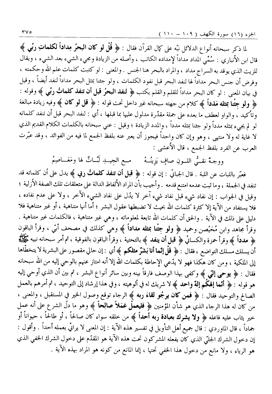 وَقَرَأَ مُجَاهِدٌ وَابْنُ مُحَيْصِنٍ وَحُمَيْدٌ وَلَوْ جِئْنَا بِمِثْلِهِ مِدَادًا وَهِيَ كَذَلِكَ فِي مُصْحَفِ أُبَيٍّ، وَقَرَأَ الْبَاقُونَ مَدَداً وَقَرَأَ حَمْزَةُ وَالْكِسَائِيُّ قَبْلَ أَنْ يَنْفَدَ بِالتَّحْتِيَّةِ، وَقَرَأَ الْبَاقُونَ بِالْفَوْقِيَّةِ، ثُمَّ أَمَرَ سُبْحَانَهُ نَبِيَّهُ صلّى الله عليه وَسَلَّمَ أَنْ يَسْلُكَ مَسْلَكَ التَّوَاضُعِ، فَقَالَ: قُلْ إِنَّما أَنَا بَشَرٌ مِثْلُكُمْ أَيْ: إِنَّ حَالِي مَقْصُورٌ عَلَى الْبَشَرِيَّةِ لَا يَتَخَطَّاهَا إِلَى الْمَلَكِيَّةِ، وَمَنْ كَانَ هَكَذَا فَهُوَ لَا يَدَّعِي الْإِحَاطَةَ بِكَلِمَاتِ اللَّهِ إِلَّا أَنَّهُ امْتَازَ عَنْهُمْ بِالْوَحْيِ إِلَيْهِ مِنَ اللَّهِ سُبْحَانَهُ فَقَالَ: يُوحى إِلَيَّ وَكَفَى بِهَذَا الْوَصْفِ فَارِقًا بَيْنَهُ وَبَيْنَ سَائِرِ أَنْوَاعِ الْبَشَرِ، ثُمَّ بَيَّنَ أَنَّ الَّذِي أُوحِيَ إِلَيْهِ هُوَ قَوْلُهُ: أَنَّما إِلهُكُمْ إِلهٌ واحِدٌ لَا شَرِيكَ لَهُ فِي أُلُوهِيَّتِهِ، وَفِي هَذَا إِرْشَادٌ إِلَى التَّوْحِيدِ، ثُمَّ أَمَرَهُمْ بِالْعَمَلِ الصَّالِحِ وَالتَّوْحِيدِ فَقَالَ: فَمَنْ كانَ يَرْجُوا لِقاءَ رَبِّهِ الرجاء توقع وصول الْخَيْرِ فِي الْمُسْتَقْبَلِ، وَالْمَعْنَى، مَنْ كَانَ لَهُ هَذَا الرَّجَاءُ الَّذِي هُوَ شَأْنُ الْمُؤْمِنِينَ فَلْيَعْمَلْ عَمَلًا صالِحاً وَهُوَ مَا دَلَّ الشَّرْعُ عَلَى أَنَّهُ عَمَلُ خَيْرٍ يُثَابُ عَلَيْهِ فَاعِلُهُ وَلا يُشْرِكْ بِعِبادَةِ رَبِّهِ أَحَداً مِنْ خَلْقِهِ سَوَاءٌ كَانَ صَالِحًا، أَوْ طَالِحًا، حَيَوَانًا أَوْ جَمَادًا، قَالَ الْمَاوَرْدِيُّ: قَالَ جَمِيعُ أَهْلِ التَّأْوِيلِ فِي تَفْسِيرِ هَذِهِ الْآيَةِ: إِنَّ الْمَعْنَى لَا يُرَائِي بِعَمَلِهِ أَحَدًا. وَأَقُولُ: