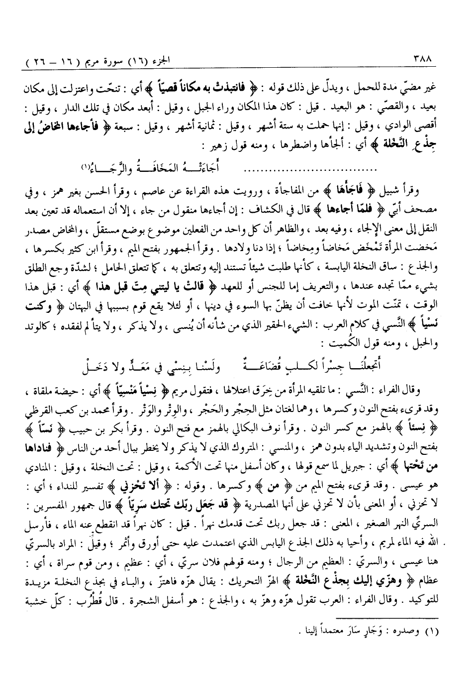 وقرأ شبيل فَاجَأَهَا مِنَ الْمُفَاجَأَةِ، وَرُوِيَتْ هَذِهِ الْقِرَاءَةُ عَنْ عَاصِمٍ، وَقَرَأَ الْحَسَنُ بِغَيْرِ هَمْزٍ، وَفِي مُصْحَفِ أُبَيٍّ فَلَمَّا أَجَاءَهَا قَالَ فِي الْكَشَّافِ: إِنَّ أَجَاءَهَا مَنْقُولٌ مِنْ جَاءَ، إِلَّا أَنَّ اسْتِعْمَالَهُ قَدْ تَعَيَّنَ بَعْدَ النَّقْلِ إِلَى مَعْنَى الْإِلْجَاءِ، وَفِيهِ بُعْدٌ، وَالظَّاهِرُ أَنَّ كُلَّ وَاحِدٍ مِنَ الْفِعْلَيْنِ مَوْضُوعٌ بِوَضْعٍ مُسْتَقِلٍّ، وَالْمَخَاضُ مَصْدَرُ مَخَضَتِ المرأة تمخض مخاضا وَمَخَاضًا إِذَا دَنَا وِلَادُهَا. وَقَرَأَ الْجُمْهُورُ بِفَتْحِ الْمِيمِ، وَقَرَأَ ابْنُ كَثِيرٍ بِكَسْرِهَا، وَالْجِذْعُ: سَاقُ النَّخْلَةِ الْيَابِسَةِ، كَأَنَّهَا طَلَبَتْ شَيْئًا تَسْتَنِدُ إِلَيْهِ وَتَتَعَلَّقُ بِهِ، كَمَا تَتَعَلَّقُ الْحَامِلُ لِشِدَّةِ وَجَعِ الطَّلْقِ بِشَيْءٍ مِمَّا تَجِدُهُ عِنْدَهَا، وَالتَّعْرِيفُ إِمَّا للجنس أو للعهد قالَتْ يا لَيْتَنِي مِتُّ قَبْلَ هَذَا أَيْ: قَبْلَ هَذَا الْوَقْتِ، تَمَنَّتِ الْمَوْتَ لِأَنَّهَا خَافَتْ أَنْ يُظَنَّ بِهَا السُّوءُ فِي دِينِهَا، أَوْ لِئَلَّا يَقَعَ قَوْمٌ بِسَبَبِهَا فِي الْبُهْتَانِ وَكُنْتُ نَسْياً النَّسْيُ فِي كَلَامِ الْعَرَبِ: الشَّيْءُ الْحَقِيرُ الَّذِي مِنْ شَأْنِهِ أَنْ يُنْسَى، وَلَا يُذْكُرَ، وَلَا يُتَأَلَّمَ لِفَقْدِهِ كالوتد والحبل، ومنه قول الكميت: