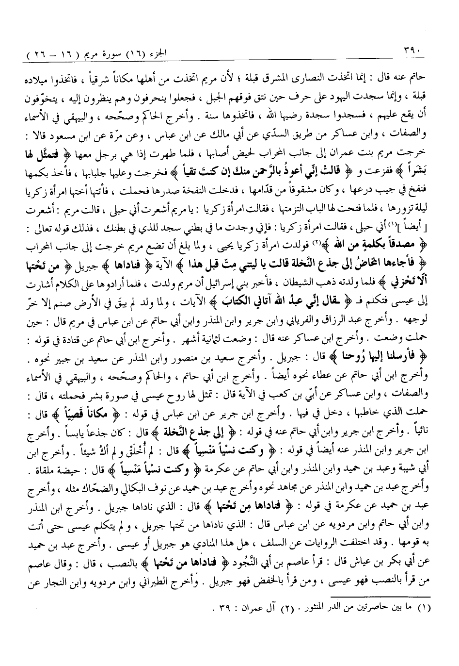 وَأَخْرَجَ عَبْدُ بْنُ حُمَيْدٍ وَابْنُ الْمُنْذِرِ عَنْ مُجَاهِدٍ نَحْوَهُ وَأَخْرَجَ عَبْدُ بْنُ حُمَيْدٍ عَنْ نَوْفٍ الَبِكَالِيِّ وَالضَّحَّاكِ مِثْلَهُ، وَأَخْرَجَ عَبْدُ بْنُ حُمَيْدٍ عَنْ عِكْرِمَةَ فِي قَوْلِهِ: فَناداها مِنْ تَحْتِها قَالَ: الَّذِي نَادَاهَا جِبْرِيلُ. وَأَخْرَجَ ابْنُ الْمُنْذِرِ وَابْنُ أَبِي حَاتِمٍ وَابْنُ مَرْدَوَيْهِ عَنِ ابْنِ عَبَّاسٍ قَالَ: الَّذِي نَادَاهَا مِنْ تَحْتِهَا جِبْرِيلُ، وَلَمْ يَتَكَلَّمْ عِيسَى حَتَّى أَتَتْ بِهِ قَوْمَهَا. وَقَدِ اخْتَلَفَتِ الرِّوَايَاتُ عَنِ السَّلَفِ، هَلْ هَذَا الْمُنَادِي هُوَ جِبْرِيلُ أَوْ عِيسَى. وَأَخْرَجَ عَبْدُ بْنُ حُمَيْدٍ عَنْ أَبِي بَكْرِ بْنِ عَيَّاشٍ قَالَ: قَرَأَ عَاصِمُ بْنُ أَبِي النُّجُودِ فَناداها مِنْ تَحْتِها بِالنَّصْبِ، قَالَ: وَقَالَ عَاصِمٌ مَنْ قَرَأَ بِالنَّصْبِ فَهُوَ عِيسَى، وَمَنْ قَرَأَ بِالْخَفْضِ فَهُوَ جِبْرِيلُ. وَأَخْرَجَ الطَّبَرَانِيُّ وَابْنُ مردويه وابن النجار عن