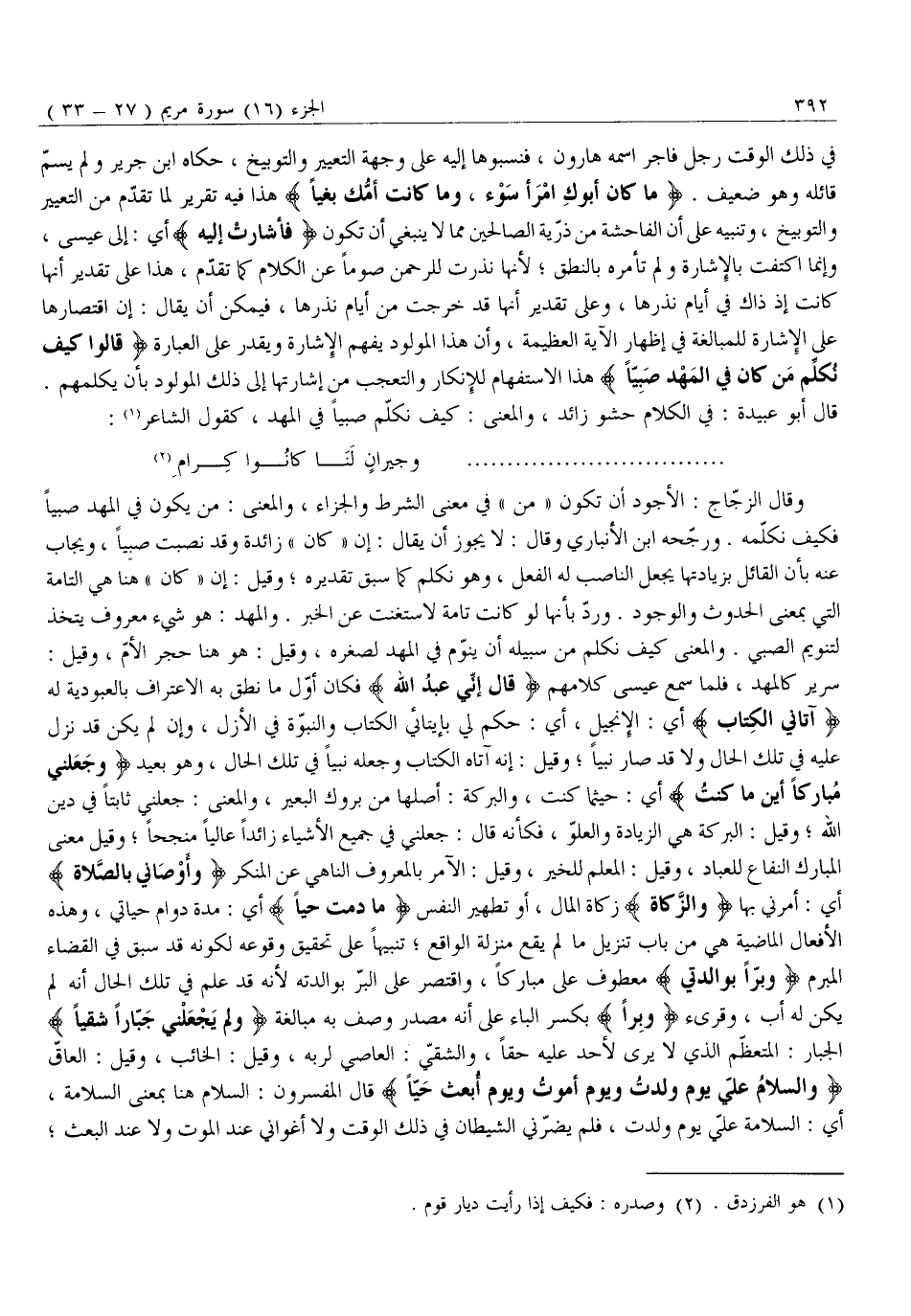 سَرِيرٌ كَالْمَهْدِ، فَلَمَّا سَمِعَ عِيسَى كَلَامَهُمْ قالَ إِنِّي عَبْدُ اللَّهِ فَكَانَ أَوَّلَ مَا نَطَقَ بِهِ الِاعْتِرَافُ بِالْعُبُودِيَّةِ لَهُ آتانِيَ الْكِتابَ أَيْ: الْإِنْجِيلَ، أَيْ: حَكَمَ لِي بِإِيتَائِي الْكِتَابَ وَالنُّبُوَّةَ فِي الْأَزَلِ، وَإِنْ لَمْ يَكُنْ قَدْ نَزَلَ عَلَيْهِ فِي تِلْكَ الْحَالِ وَلَا قَدْ صَارَ نَبِيًّا وَقِيلَ: إِنَّهُ آتَاهُ الْكِتَابَ وَجَعَلَهُ نَبِيًّا فِي تِلْكَ الْحَالِ، وَهُوَ بَعِيدٌ وَجَعَلَنِي مُبارَكاً أَيْنَ مَا كُنْتُ أَيْ: حَيْثُمَا كُنْتُ، وَالْبَرَكَةُ: أَصْلُهَا مِنْ بُرُوكِ الْبَعِيرِ، وَالْمَعْنَى: جَعَلَنِي ثَابِتًا فِي دِينِ اللَّهِ وَقِيلَ: الْبَرَكَةُ هِيَ الزِّيَادَةُ وَالْعُلُوُّ، فَكَأَنَّهُ قَالَ: جَعَلَنِي فِي جَمِيعِ الْأَشْيَاءِ زَائِدًا عَالِيًا مُنْجَحًا وَقِيلَ مَعْنَى الْمُبَارَكِ النَّفَّاعُ لِلْعِبَادِ، وَقِيلَ: الْمُعَلِّمُ لِلْخَيْرِ، وَقِيلَ: الْآمِرُ بِالْمَعْرُوفِ النَّاهِي عَنِ الْمُنْكَرِ وَأَوْصانِي بِالصَّلاةِ أَيْ: أَمَرَنِي بِهَا وَالزَّكاةِ زَكَاةِ الْمَالِ، أَوْ تَطْهِيرِ النَّفْسِ مَا دُمْتُ حَيًّا أَيْ: مُدَّةَ دَوَامِ حَيَاتِي، وَهَذِهِ الْأَفْعَالُ الْمَاضِيَةُ هِيَ مِنْ بَابِ تَنْزِيلِ مَا لَمْ يَقَعْ مَنْزِلَةَ الواقع تنبيها على تحقيق وُقُوعِهِ لِكَوْنِهِ قَدْ سَبَقَ فِي الْقَضَاءِ الْمُبْرَمِ وَبَرًّا بِوالِدَتِي مَعْطُوفٌ عَلَى مُبَارَكًا، وَاقْتَصَرَ عَلَى الْبِرِّ بِوَالِدَتِهِ لِأَنَّهُ قَدْ عَلِمَ فِي تِلْكَ الْحَالِ أَنَّهُ لَمْ يَكُنْ لَهُ أَبٌ، وَقُرِئَ وَبَرًّا بِكَسْرِ الْبَاءِ عَلَى أَنَّهُ مَصْدَرٌ وُصِفَ بِهِ مُبَالَغَةً وَلَمْ يَجْعَلْنِي جَبَّاراً شَقِيًّا الْجَبَّارُ: الْمُتَعَظِّمُ الَّذِي لَا يَرَى لِأَحَدٍ عَلَيْهِ حَقًّا، وَالشَّقِيُّ: الْعَاصِي لِرَبِّهِ، وَقِيلَ: الْخَائِبُ، وَقِيلَ: الْعَاقُّ وَالسَّلامُ عَلَيَّ يَوْمَ وُلِدْتُ وَيَوْمَ أَمُوتُ وَيَوْمَ أُبْعَثُ حَيًّا قَالَ الْمُفَسِّرُونَ: السَّلَامُ هُنَا بِمَعْنَى السَّلَامَةِ، أَيْ: السَّلَامَةُ عَلَيَّ يَوْمَ وُلِدْتُ، فَلَمْ يَضُرَّنِي الشَّيْطَانُ فِي ذَلِكَ الْوَقْتِ وَلَا أَغْوَانِي عند الموت ولا عند البعث