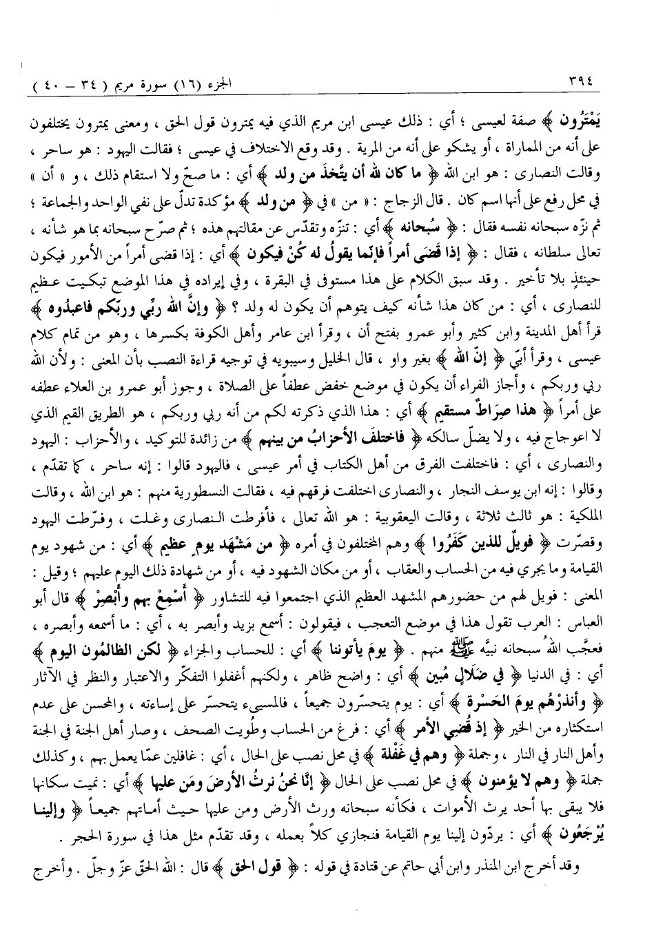 صِفَةٌ لِعِيسَى أَيْ: ذَلِكَ عِيسَى ابْنُ مَرْيَمَ الَّذِي فِيهِ يَمْتَرُونَ قَوْلَ الْحَقِّ، وَمَعْنَى يَمْتَرُونَ يختلفون على أنه من المماراة، أو يشكو عَلَى أَنَّهُ مِنَ الْمِرْيَةِ. وَقَدْ وَقَعَ الِاخْتِلَافُ فِي عِيسَى فَقَالَتِ الْيَهُودُ: هُوَ سَاحِرٌ، وَقَالَتِ النَّصَارَى: هُوَ ابْنُ اللَّهِ مَا كانَ لِلَّهِ أَنْ يَتَّخِذَ مِنْ وَلَدٍ أَيْ: مَا صَحَّ ولا استقام ذلك، و «أَنْ» فِي مَحَلِّ رَفْعٍ عَلَى أَنَّهَا اسْمُ كَانَ. قَالَ الزَّجَّاجُ: «مِنْ» فِي مِنْ وَلَدٍ مُؤَكِّدَةٌ تَدُلُّ عَلَى نَفْيِ الْوَاحِدِ وَالْجَمَاعَةِ ثُمَّ نَزَّهَ سُبْحَانَهُ نَفْسَهُ فَقَالَ: سُبْحانَهُ أَيْ: تَنَزَّهَ وَتَقَدَّسَ عَنْ مَقَالَتِهِمْ هَذِهِ ثُمَّ صَرَّحَ سُبْحَانَهُ بِمَا هُوَ شَأْنُهُ، تَعَالَى سُلْطَانُهُ، فَقَالَ: إِذا قَضى أَمْراً فَإِنَّما يَقُولُ لَهُ كُنْ فَيَكُونُ أَيْ: إِذَا قَضَى أَمْرًا مِنَ الْأُمُورِ فَيَكُونُ حِينَئِذٍ بِلَا تَأْخِيرٍ. وَقَدْ سَبَقَ الْكَلَامُ عَلَى هَذَا مُسْتَوْفًى فِي الْبَقَرَةِ، وَفِي إِيرَادِهِ فِي هَذَا الْمَوْضِعِ تَبْكِيتٌ عَظِيمٌ لِلنَّصَارَى، أَيْ: مَنْ كَانَ هَذَا شَأْنَهُ كَيْفَ يُتَوَهَّمُ أَنْ يَكُونَ لَهُ وَلَدٌ؟ وَإِنَّ اللَّهَ رَبِّي وَرَبُّكُمْ فَاعْبُدُوهُ قَرَأَ أَهْلُ الْمَدِينَةِ وَابْنُ كَثِيرٍ وَأَبُو عَمْرٍو بِفَتْحِ أَنْ، وَقَرَأَ ابْنُ عَامِرٍ وَأَهْلُ الْكُوفَةِ بِكَسْرِهَا، وَهُوَ مِنْ تَمَامِ كَلَامِ عِيسَى، وَقَرَأَ أُبَيٌّ إِنَّ اللَّهَ بِغَيْرِ وَاوٍ، قَالَ الْخَلِيلُ وَسِيبَوَيْهِ فِي تَوْجِيهِ قِرَاءَةِ النَّصْبِ بِأَنَّ الْمَعْنَى: وَلِأَنَّ اللَّهَ رَبِّي وَرَبُّكُمْ، وَأَجَازَ الْفَرَّاءُ أَنْ يَكُونَ فِي مَوْضِعِ خَفْضٍ عَطْفًا عَلَى الصَّلَاةِ، وَجَوَّزَ أَبُو عَمْرِو بْنُ الْعَلَاءِ عَطْفَهُ عَلَى أَمْرًا هَذَا صِراطٌ مُسْتَقِيمٌ أَيْ: هَذَا الَّذِي ذَكَرْتُهُ لَكُمْ مِنْ أَنَّهُ رَبِّي وَرَبُّكُمْ، هُوَ الطَّرِيقُ الْقَيِّمُ الَّذِي لَا اعْوِجَاجَ فِيهِ، وَلَا يَضِلُّ سَالِكُهُ فَاخْتَلَفَ الْأَحْزابُ مِنْ بَيْنِهِمْ مِنْ زَائِدَةٌ لِلتَّوْكِيدِ، وَالْأَحْزَابُ: الْيَهُودُ وَالنَّصَارَى، أَيْ: فَاخْتَلَفَتِ الْفِرَقُ مِنْ أَهْلِ الْكِتَابِ فِي أَمْرِ عِيسَى، فَالْيَهُودُ قَالُوا: إِنَّهُ سَاحِرٌ، كَمَا تَقَدَّمَ، وَقَالُوا: إِنَّهُ ابْنُ يُوسُفَ النَّجَّارِ، وَالنَّصَارَى اخْتَلَفَتْ فِرَقُهُمْ فِيهِ، فَقَالَتِ النَّسْطُورِيَّةُ مِنْهُمْ: هُوَ ابْنُ اللَّهِ، وقالت الملكية: هو ثَالِثُ ثَلَاثَةٍ، وَقَالَتِ الْيَعْقُوبِيَّةُ: هُوَ اللَّهُ تَعَالَى، فَأَفْرَطَتِ النَّصَارَى وَغَلَتْ، وَفَرَّطَتِ الْيَهُودُ وَقَصَّرَتْ فَوَيْلٌ لِلَّذِينَ كَفَرُوا وَهُمُ الْمُخْتَلِفُونَ فِي أَمْرِهِ مِنْ مَشْهَدِ يَوْمٍ عَظِيمٍ أَيْ: مِنْ شُهُودِ يَوْمِ الْقِيَامَةِ وَمَا يَجْرِي فِيهِ مِنَ الْحِسَابِ وَالْعِقَابِ، أَوْ مِنْ مَكَانِ الشُّهُودِ فِيهِ، أَوْ مِنْ شَهَادَةِ ذَلِكَ الْيَوْمِ عَلَيْهِمْ وَقِيلَ: