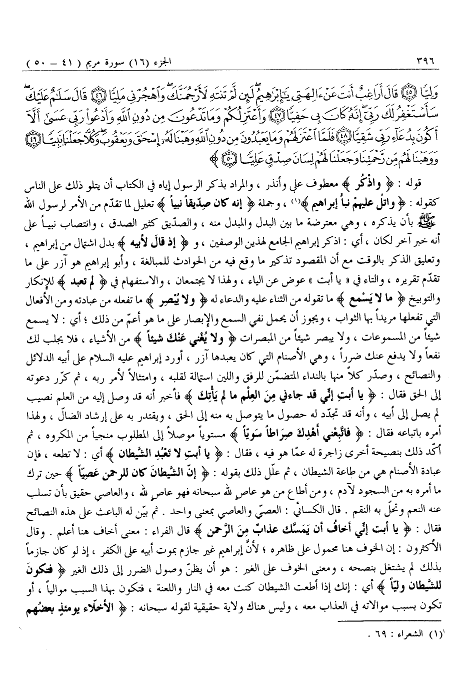 مِنَ الْأَشْيَاءِ، فَلَا يَجْلِبُ لَكَ نَفْعًا وَلَا يَدْفَعُ عَنْكَ ضَرَرًا، وَهِيَ الْأَصْنَامُ الَّتِي كَانَ يَعْبُدُهَا آزَرُ، أَوْرَدَ إِبْرَاهِيمُ عَلَيْهِ السَّلَامُ عَلَى أَبِيهِ الدَّلَائِلَ وَالنَّصَائِحَ، وَصَدَّرَ كُلًّا مِنْهَا بِالنِّدَاءِ الْمُتَضَمِّنِ لِلرِّفْقِ وَاللِّينِ اسْتِمَالَةً لِقَلْبِهِ، وَامْتِثَالًا لِأَمْرِ رَبِّهِ، ثُمَّ كَرَّرَ دَعْوَتَهُ إِلَى الحق فقال: يَا أَبَتِ إِنِّي قَدْ جاءَنِي مِنَ الْعِلْمِ مَا لَمْ يَأْتِكَ فَأَخْبَرَ أَنَّهُ قَدْ وَصَلَ إِلَيْهِ مِنَ الْعِلْمِ نَصِيبٌ لَمْ يَصِلْ إِلَى أَبِيهِ، وَأَنَّهُ قَدْ تَجَدَّدَ لَهُ حُصُولُ مَا يَتَوَصَّلُ بِهِ مِنْهُ إِلَى الْحَقِّ، وَيَقْتَدِرُ بِهِ عَلَى إِرْشَادِ الضَّالِّ، وَلِهَذَا أَمَرَهُ بِاتِّبَاعِهِ فَقَالَ: فَاتَّبِعْنِي أَهْدِكَ صِراطاً سَوِيًّا مُسْتَوِيًا مُوَصِّلًا إِلَى الْمَطْلُوبِ مُنَجِّيًا مِنَ الْمَكْرُوهِ، ثُمَّ أَكَّدَ ذَلِكَ بِنَصِيحَةٍ أُخْرَى زَاجِرَةٍ لَهُ عَمَّا هُوَ فِيهِ، فقال: يا أَبَتِ لَا تَعْبُدِ الشَّيْطانَ أَيْ: لَا تُطِعْهُ، فَإِنَّ عِبَادَةَ الْأَصْنَامِ هِيَ مِنْ طَاعَةِ الشَّيْطَانِ، ثُمَّ عَلَّلَ ذَلِكَ بِقَوْلِهِ: إِنَّ الشَّيْطانَ كانَ لِلرَّحْمنِ عَصِيًّا حِينَ تَرَكَ مَا أَمَرَهُ بِهِ مِنَ السُّجُودِ لِآدَمَ، وَمَنْ أَطَاعَ مَنْ هُوَ عَاصٍ لِلَّهِ سُبْحَانَهُ فَهُوَ عَاصٍ لِلَّهِ، وَالْعَاصِي حَقِيقٌ بِأَنْ تُسْلَبَ عَنْهُ النِّعَمُ وَتَحِلَّ بِهِ النِّقَمُ. قَالَ الْكِسَائِيُّ: الْعَصِيُّ وَالْعَاصِي بِمَعْنًى وَاحِدٍ. ثُمَّ بَيَّنَ لَهُ الْبَاعِثَ عَلَى هَذِهِ النَّصَائِحِ فَقَالَ: يَا أَبَتِ إِنِّي أَخافُ أَنْ يَمَسَّكَ عَذابٌ مِنَ الرَّحْمنِ قَالَ الْفَرَّاءُ: مَعْنَى أَخَافُ هُنَا أَعْلَمُ. وَقَالَ الْأَكْثَرُونَ: إِنَّ الْخَوْفَ هُنَا مَحْمُولٌ عَلَى ظَاهِرِهِ لِأَنَّ إِبْرَاهِيمَ غَيْرُ جَازِمٍ بِمَوْتِ أَبِيهِ عَلَى الْكُفْرِ، إِذْ لَوْ كَانَ جَازِمًا بِذَلِكَ لَمْ يَشْتَغِلْ بِنُصْحِهِ، وَمَعْنَى الْخَوْفِ عَلَى الْغَيْرِ: هُوَ أَنْ يَظُنَّ وُصُولَ الضَّرَرِ إِلَى ذَلِكَ الْغَيْرِ فَتَكُونَ لِلشَّيْطانِ وَلِيًّا أَيْ: إِنَّكَ إِذَا أَطَعْتَ الشَّيْطَانَ كُنْتَ مَعَهُ فِي النَّارِ وَاللَّعْنَةِ، فَتَكُونُ بِهَذَا السَّبَبِ مُوَالِيًا، أَوْ تَكُونُ بِسَبَبِ مُوَالَاتِهِ فِي الْعَذَابِ مَعَهُ، وَلَيْسَ هُنَاكَ ولاية حقيقية لقوله سبحانه: