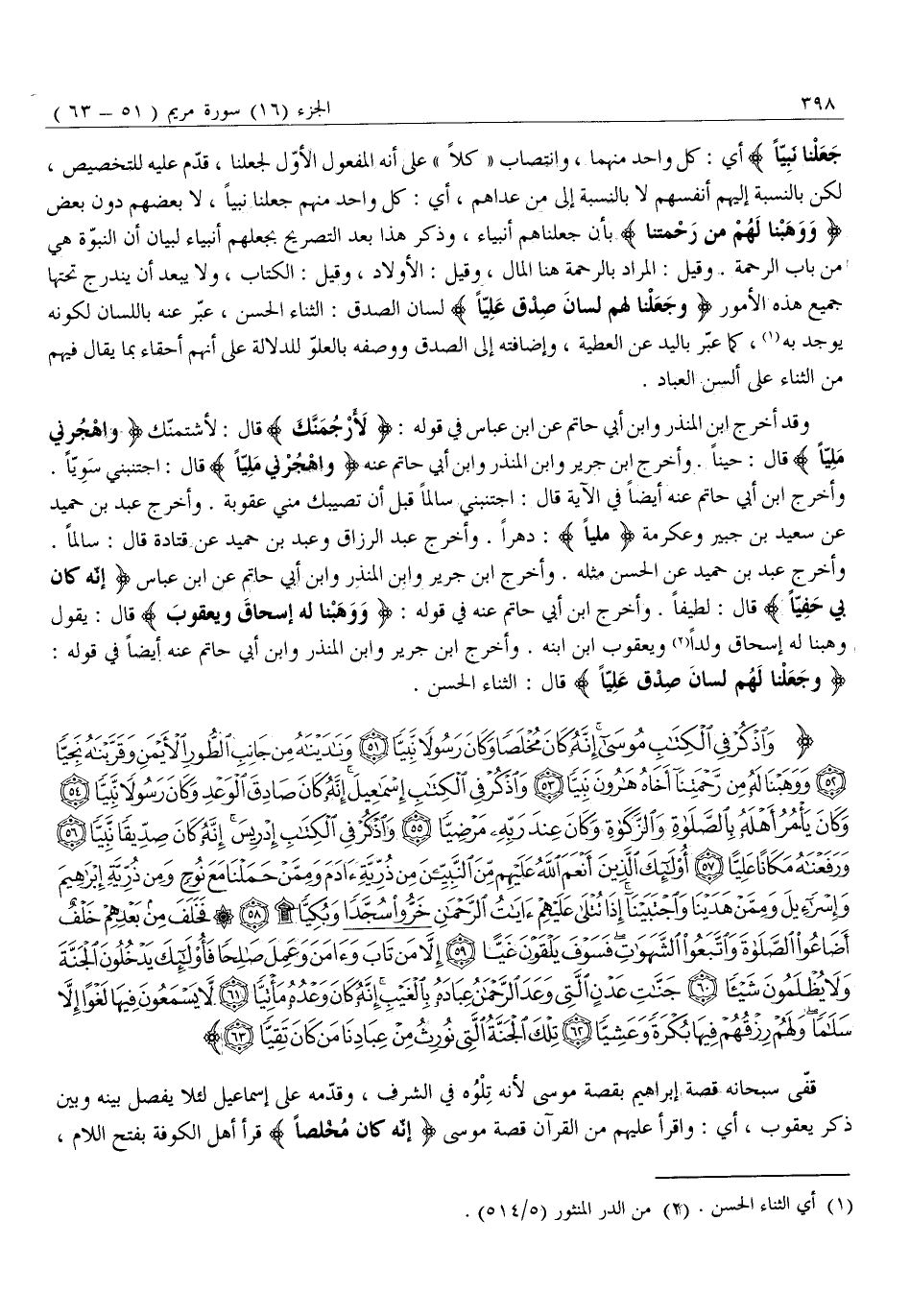 وَكُلًّا جَعَلْنا نَبِيًّا أَيْ: كُلَّ وَاحِدٍ مِنْهُمَا، وَانْتِصَابُ «كُلًّا» عَلَى أَنَّهُ الْمَفْعُولُ الْأَوَّلُ لِجَعَلْنَا، قُدِّمَ عَلَيْهِ لِلتَّخْصِيصِ، لَكِنْ بِالنِّسْبَةِ إِلَيْهِمْ أَنْفُسِهِمْ لَا بِالنِّسْبَةِ إِلَى مَنْ عَدَاهُمْ، أَيْ: كُلَّ وَاحِدٍ مِنْهُمْ جَعَلْنَا نَبِيًّا، لَا بَعْضَهُمْ دُونَ بَعْضٍ وَوَهَبْنا لَهُمْ مِنْ رَحْمَتِنا بِأَنْ جَعَلْنَاهُمْ أَنْبِيَاءَ، وَذَكَرَ هَذَا بَعْدَ التَّصْرِيحِ بِجَعْلِهِمْ أَنْبِيَاءَ لِبَيَانِ أَنَّ النُّبُوَّةَ هِيَ مِنْ بَابِ الرَّحْمَةِ. وَقِيلَ: الْمُرَادُ بِالرَّحْمَةِ هُنَا الْمَالُ، وَقِيلَ: الْأَوْلَادُ، وَقِيلَ: الْكِتَابُ، وَلَا يَبْعُدُ أَنْ يَنْدَرِجَ تَحْتَهَا جَمِيعُ هَذِهِ الْأُمُورِ وَجَعَلْنا لَهُمْ لِسانَ صِدْقٍ عَلِيًّا لِسَانُ الصِّدْقِ: الثَّنَاءُ الْحَسَنُ، عَبَّرَ عَنْهُ بِاللِّسَانِ لِكَوْنِهِ يُوجَدُ بِهِ «1» ، كَمَا عَبَّرَ بِالْيَدِ عَنِ الْعَطِيَّةِ، وَإِضَافَتُهُ إِلَى الصِّدْقِ وَوَصْفُهُ بِالْعُلُوِّ لِلدَّلَالَةِ عَلَى أَنَّهُمْ أَحِقَّاءُ بِمَا يُقَالُ فِيهِمْ مِنَ الثَّنَاءِ عَلَى أَلْسُنِ الْعِبَادِ.