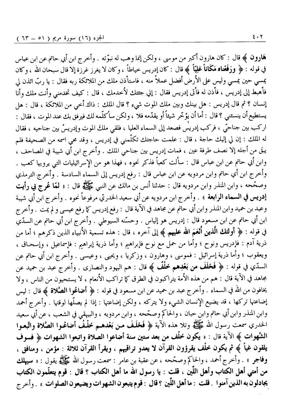 وَأَخْرَجَ ابن أي حَاتِمٍ وَابْنُ مَرْدَوَيْهِ عَنِ ابْنِ عَبَّاسٍ قَالَ: رُفِعَ إِدْرِيسُ إِلَى السَّمَاءِ السَّادِسَةِ. وَأَخْرَجَ التِّرْمِذِيُّ وَصَحَّحَهُ، وَابْنُ الْمُنْذِرِ وَابْنُ مَرْدَوَيْهِ قَالَ: حَدَّثَنَا أَنَسِ بْنِ مَالِكٍ عَنِ النَّبِيِّ صَلَّى اللَّهُ عَلَيْهِ وَسَلَّمَ قَالَ: «لَمَّا عُرِجَ بِي رَأَيْتُ إِدْرِيسَ فِي السَّمَاءِ الرَّابِعَةِ» . وَأَخْرَجَ ابْنُ مَرْدَوَيْهِ عَنْ أَبِي سَعِيدٍ الْخُدْرِيِّ مَرْفُوعًا نَحْوَهُ. وَأَخْرَجَ ابْنُ أَبِي شَيْبَةَ وَعَبْدُ بْنُ حُمَيْدٍ وَابْنُ الْمُنْذِرِ وَابْنُ أَبِي حَاتِمٍ عَنْ مُجَاهِدٍ فِي الْآيَةِ قَالَ: رُفِعَ إِدْرِيسُ كَمَا رُفِعَ عِيسَى وَلَمْ يَمُتْ. وَأَخْرَجَ ابْنُ أَبِي حَاتِمٍ عَنِ ابْنِ مَسْعُودٍ قَالَ: إِدْرِيسُ هُوَ إِلْيَاسُ. وَحَسَّنَهُ السُّيُوطِيُّ. وَأَخْرَجَ ابْنُ أَبِي حَاتِمٍ عَنِ السُّدِّيِّ فِي قَوْلِهِ: أُولئِكَ الَّذِينَ أَنْعَمَ اللَّهُ عَلَيْهِمْ إِلَى آخِرِهِ، قَالَ: هَذِهِ تَسْمِيَةُ الْأَنْبِيَاءِ الَّذِينَ ذَكَرَهُمْ أَمَّا مِنْ ذُرِّيَّةِ آدَمَ: فَإِدْرِيسُ وَنُوحٌ وَأَمَّا مَنْ حُمِلَ مَعَ نُوحٍ فَإِبْرَاهِيمُ وَأَمَّا ذُرِّيَّةُ إِبْرَاهِيمَ: فَإِسْمَاعِيلُ، وَإِسْحَاقُ، وَيَعْقُوبُ وَأَمَّا ذُرِّيَّةُ إِسْرَائِيلَ: فَمُوسَى، وَهَارُونُ، وَزَكَرِيَّا، وَيَحْيَى، وَعِيسَى. وَأَخْرَجَ ابْنُ أَبِي حَاتِمٍ عَنِ السُّدِّيِّ فِي قَوْلِهِ: فَخَلَفَ مِنْ بَعْدِهِمْ خَلْفٌ قَالَ: هُمُ الْيَهُودُ وَالنَّصَارَى. وَأَخْرَجَ عَبْدُ بْنُ حُمَيْدٍ عَنْ مُجَاهِدٍ فِي الْآيَةِ قَالَ: هُمْ مِنْ هَذِهِ الْأُمَّةِ يَتَرَاكَبُونَ فِي الطُّرُقِ كَمَا تَرَاكَبُ الْأَنْعَامُ، لَا يَسْتَحْيُونَ مِنَ النَّاسِ، وَلَا يَخَافُونَ مِنَ اللَّهِ فِي السَّمَاءِ. وَأَخْرَجَ عَبْدُ بْنُ حُمَيْدٍ عَنِ ابْنِ مَسْعُودٍ فِي قَوْلِهِ: أَضاعُوا الصَّلاةَ قَالَ: لَيْسَ إِضَاعَتُهَا تَرْكَهَا، قَدْ يُضَيِّعُ الْإِنْسَانُ الشَّيْءَ وَلَا يَتْرُكُهُ، وَلَكِنَّ إِضَاعَتَهَا: إِذَا لَمْ يُصَلِّهَا لِوَقْتِهَا. وَأَخْرَجَ أَحْمَدُ وَابْنُ الْمُنْذِرِ وَابْنُ أَبِي حَاتِمٍ وَابْنُ حِبَّانَ، وَالْحَاكِمُ وَصَحَّحَهُ، وَابْنُ مَرْدَوَيْهِ، وَالْبَيْهَقِيُّ فِي الشُّعَبِ، عَنْ أَبِي سَعِيدٍ الْخُدْرِيِّ سَمِعَتْ رَسُولَ اللَّهِ صَلَّى اللَّهُ عَلَيْهِ وَسَلَّمَ وَتَلَا هَذِهِ الْآيَةَ فَخَلَفَ مِنْ بَعْدِهِمْ خَلْفٌ أَضاعُوا الصَّلاةَ وَاتَّبَعُوا الشَّهَواتِ الْآيَةَ قَالَ: «يَكُونُ خَلْفٌ مِنْ بَعْدِ سِتِّينَ سَنَةً أَضَاعُوا الصَّلَاةَ وَاتَّبَعُوا الشَّهَوَاتِ فَسَوْفَ يَلْقَوْنَ غَيًّا ثُمَّ يَكُونُ خَلْفٌ يَقْرَءُونَ الْقُرْآنَ لَا يَعْدُو تَرَاقِيَهُمْ، وَيَقْرَأُ الْقُرْآنَ ثَلَاثَةٌ: مُؤْمِنٌ، وَمُنَافِقٌ، وَفَاجِرٌ» . وَأَخْرَجَ أَحْمَدُ، وَالْحَاكِمُ وَصَحَّحَهُ، عَنْ عُقْبَةَ بْنِ عَامِرٍ: سَمِعْتُ رَسُولَ اللَّهِ صَلَّى اللَّهُ عَلَيْهِ وَسَلَّمَ يَقُولُ: «سَيَهْلِكُ مِنْ أُمَّتِي أَهْلُ الْكِتَابِ وَأَهْلُ اللّين، قُلْتُ: يَا رَسُولَ اللَّهِ مَا أَهْلُ الْكِتَابِ؟ قَالَ: قَوْمٌ يَتَعَلَّمُونَ الْكِتَابَ يُجَادِلُونَ بِهِ الَّذِينَ آمنوا. قلت: ما أهل اللّين؟ قَالَ: قَوْمٌ يَتَّبِعُونَ الشَّهَوَاتِ وَيُضَيِّعُونَ الصَّلَوَاتِ» . وَأَخْرَجَ