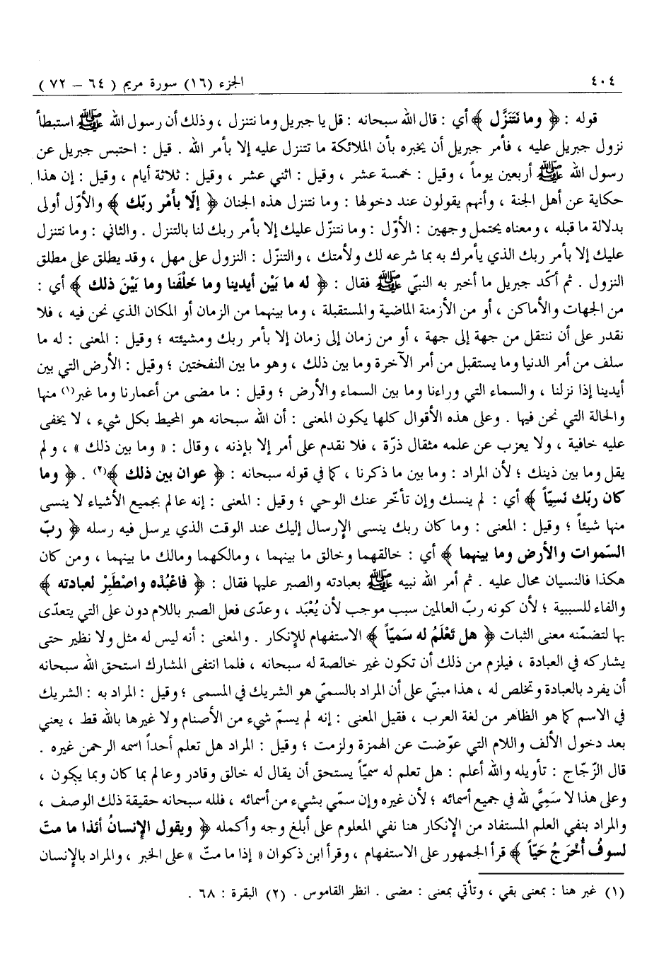 قَوْلُهُ: وَما نَتَنَزَّلُ أَيْ: قَالَ اللَّهُ سُبْحَانَهُ: قُلْ يَا جِبْرِيلُ وَمَا نَتَنَزَّلُ، وَذَلِكَ أَنَّ رَسُولَ اللَّهِ صَلَّى اللَّهُ عَلَيْهِ وَسَلَّمَ اسْتَبْطَأَ نُزُولَ جِبْرِيلَ عَلَيْهِ، فَأَمَرَ جِبْرِيلَ أَنْ يُخْبِرَهُ بِأَنَّ الْمَلَائِكَةَ مَا تَتَنَزَّلُ عَلَيْهِ إِلَّا بِأَمْرِ اللَّهِ. قِيلَ: احْتَبَسَ جِبْرِيلُ عَنْ رَسُولِ اللَّهِ صَلَّى اللَّهُ عَلَيْهِ وَسَلَّمَ أَرْبَعِينَ يَوْمًا، وَقِيلَ: خَمْسَةَ عَشَرَ، وَقِيلَ: اثْنَيْ عَشَرَ، وَقِيلَ: ثَلَاثَةَ أَيَّامٍ، وَقِيلَ: إِنَّ هَذَا حِكَايَةٌ عَنْ أَهْلِ الْجَنَّةِ، وَأَنَّهُمْ يَقُولُونَ عِنْدَ دُخُولِهَا: وَمَا نَتَنَزَّلُ هَذِهِ الْجِنَانَ إِلَّا بِأَمْرِ رَبِّكَ وَالْأَوَّلُ أَوْلَى بِدَلَالَةِ مَا قَبْلَهُ، وَمَعْنَاهُ يَحْتَمِلُ وَجْهَيْنِ: الْأَوَّلُ: وَمَا نَتَنَزَّلُ عَلَيْكَ إِلَّا بِأَمْرِ رَبِّكَ لَنَا بِالتَّنَزُّلِ. وَالثَّانِي: وَمَا نَتَنَزَّلُ عَلَيْكَ إِلَّا بِأَمْرِ رَبِّكَ الَّذِي يَأْمُرُكَ بِهِ بِمَا شَرَعَهُ لَكَ وَلِأُمَّتِكَ، وَالتَّنَزُّلُ: النُّزُولُ عَلَى مَهْلٍ، وَقَدْ يُطْلَقُ عَلَى مُطْلَقِ النُّزُولِ. ثُمَّ أَكَّدَ جِبْرِيلُ مَا أَخْبَرَ بِهِ النَّبِيُّ صَلَّى اللَّهُ عَلَيْهِ وَسَلَّمَ فَقَالَ: لَهُ مَا بَيْنَ أَيْدِينا وَما خَلْفَنا وَما بَيْنَ ذلِكَ أَيْ: