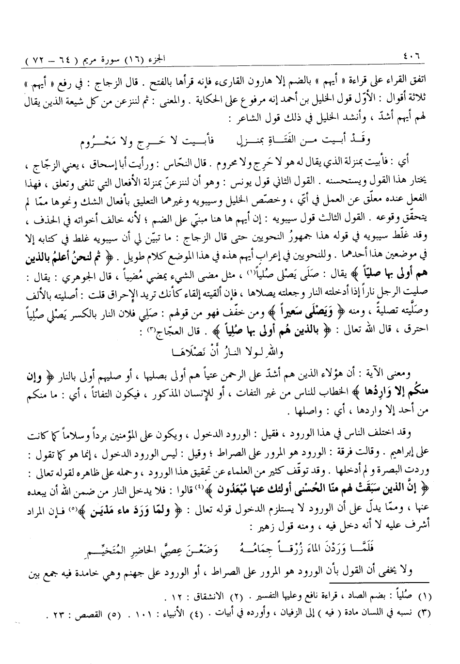 إِنَّ الَّذِينَ سَبَقَتْ لَهُمْ مِنَّا الْحُسْنى أُولئِكَ عَنْها مُبْعَدُونَ «4» قَالُوا: فَلَا يَدْخُلُ النَّارَ مَنْ ضَمِنَ اللَّهَ أَنْ يُبْعِدَهُ عَنْهَا، وَمِمَّا يَدُلُّ عَلَى أَنَّ الْوُرُودَ لَا يَسْتَلْزِمُ الدُّخُولَ قَوْلُهُ تَعَالَى: وَلَمَّا وَرَدَ ماءَ مَدْيَنَ «5» فَإِنَّ الْمُرَادَ أَشْرَفَ عَلَيْهِ لَا أَنَّهُ دَخَلَ فِيهِ، وَمِنْهُ قَوْلُ زُهَيْرٍ: