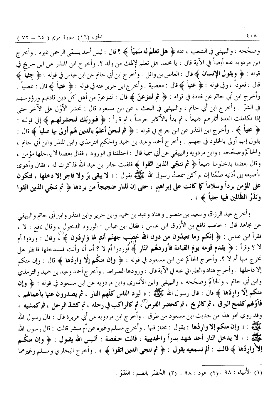 وصحّحه، والبيهقي فِي الشُّعَبِ، عَنْهُ هَلْ تَعْلَمُ لَهُ سَمِيًّا؟ قَالَ: لَيْسَ أَحَدٌ يُسَمَّى الرَّحْمَنَ غَيْرَهُ. وَأَخْرَجَ ابْنُ مَرْدَوَيْهِ عَنْهُ أَيْضًا فِي الْآيَةِ قَالَ: يَا مُحَمَّدُ هَلْ تَعْلَمُ لِإِلَهِكَ مِنْ وَلَدٍ؟. وَأَخْرَجَ ابْنُ الْمُنْذِرِ عَنِ ابْنِ جُرَيْجٍ فِي قَوْلِهِ: وَيَقُولُ الْإِنْسانُ قَالَ: الْعَاصُ بْنُ وَائِلٍ. وَأَخْرَجَ ابْنُ أَبِي حَاتِمٍ عَنِ ابْنِ عَبَّاسٍ فِي قَوْلِهِ: جِثِيًّا قَالَ: قُعُودًا، وَفِي قَوْلِهِ: عِتِيًّا قَالَ: مَعْصِيَةً. وَأَخْرَجَ ابْنُ جَرِيرٍ عَنْهُ فِي قَوْلِهِ: عِتِيًّا قَالَ: عِصِيًّا.