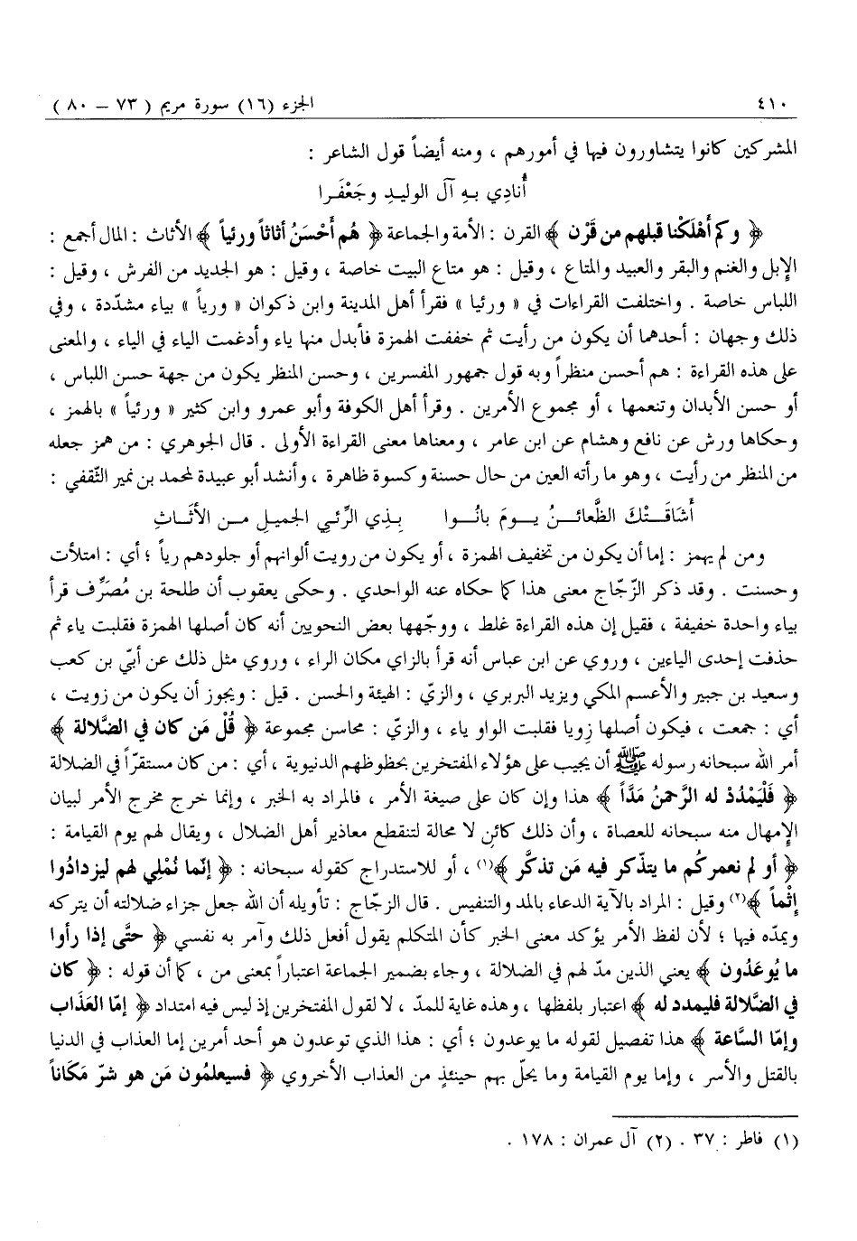 أُنَادِي بِهِ آلَ الْوَلِيدِ وجعفرا وَكَمْ أَهْلَكْنا قَبْلَهُمْ مِنْ قَرْنٍ الْقَرْنُ: الْأُمَّةُ والجماعة هُمْ أَحْسَنُ أَثاثاً وَرِءْياً الْأَثَاثُ: الْمَالُ أَجْمَعُ:
