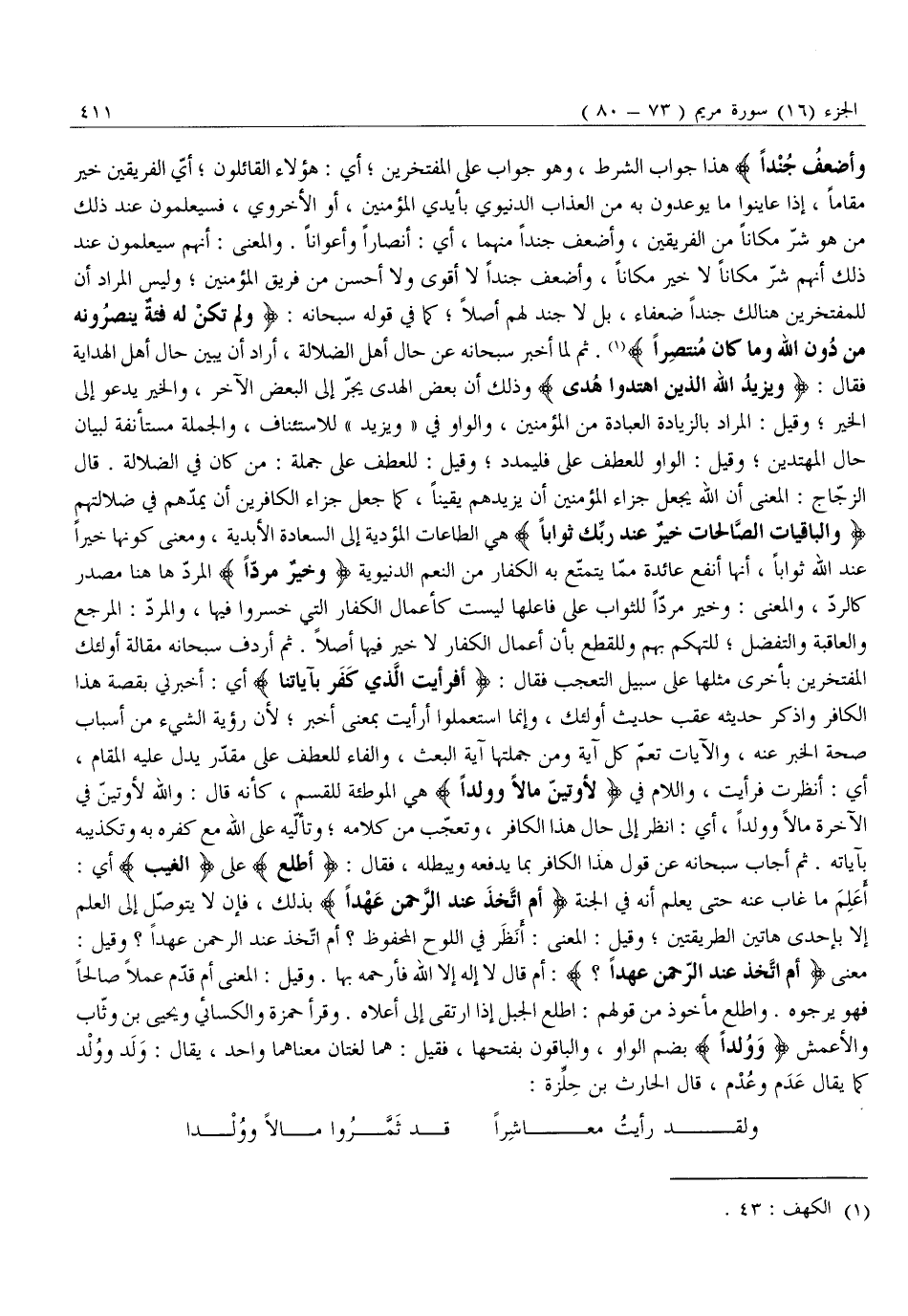 مَعْنَى أَمِ اتَّخَذَ عِنْدَ الرَّحْمنِ عَهْداً؟: أَمْ قَالَ لَا إِلَهَ إِلَّا اللَّهُ فَأَرْحَمَهُ بِهَا. وَقِيلَ: الْمَعْنَى أَمْ قَدَّمَ عَمَلًا صَالِحًا فَهُوَ يَرْجُوهُ. وَاطَّلَعَ مَأْخُوذٌ مِنْ قَوْلِهِمْ: اطَّلَعَ الْجَبَلَ إِذَا ارْتَقَى إِلَى أَعْلَاهُ. وَقَرَأَ حَمْزَةُ وَالْكِسَائِيُّ وَيَحْيَى بْنُ وَثَّابٍ وَالْأَعْمَشُ وَوُلْدًا بِضَمِّ الْوَاوِ، وَالْبَاقُونَ بِفَتْحِهَا، فَقِيلَ: هُمَا لُغَتَانِ مَعْنَاهُمَا وَاحِدٌ، يُقَالُ: وَلَدٌ وَوُلْدٌ كَمَا يُقَالُ عَدَمٌ وَعُدْمٌ، قَالَ الْحَارِثُ بْنُ حِلِّزَةَ: