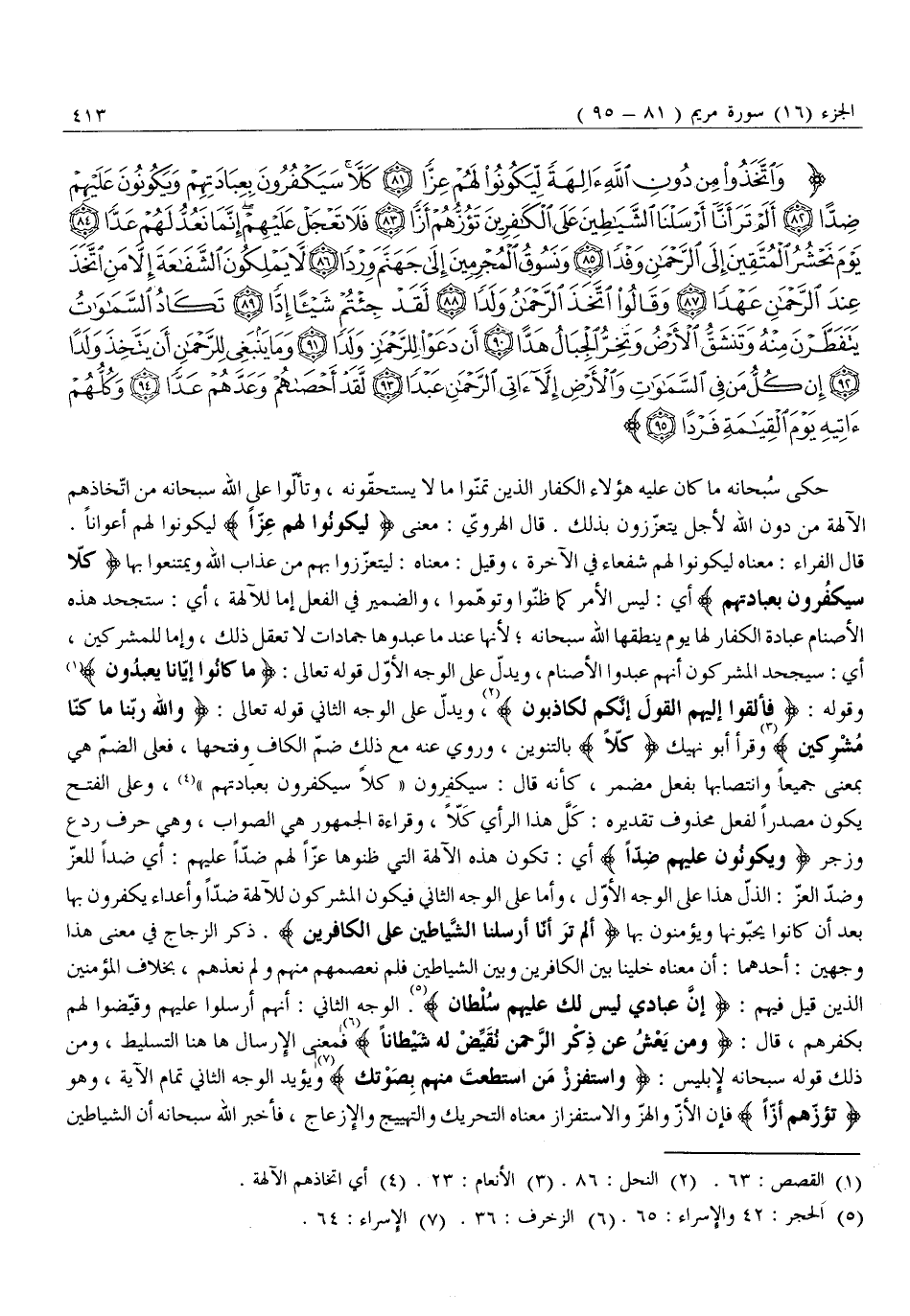 وَاتَّخَذُوا مِنْ دُونِ اللَّهِ آلِهَةً لِيَكُونُوا لَهُمْ عِزًّا (81) كَلاَّ سَيَكْفُرُونَ بِعِبادَتِهِمْ وَيَكُونُونَ عَلَيْهِمْ ضِدًّا (82) أَلَمْ تَرَ أَنَّا أَرْسَلْنَا الشَّياطِينَ عَلَى الْكافِرِينَ تَؤُزُّهُمْ أَزًّا (83) فَلا تَعْجَلْ عَلَيْهِمْ إِنَّما نَعُدُّ لَهُمْ عَدًّا (84) يَوْمَ نَحْشُرُ الْمُتَّقِينَ إِلَى الرَّحْمنِ وَفْداً (85)