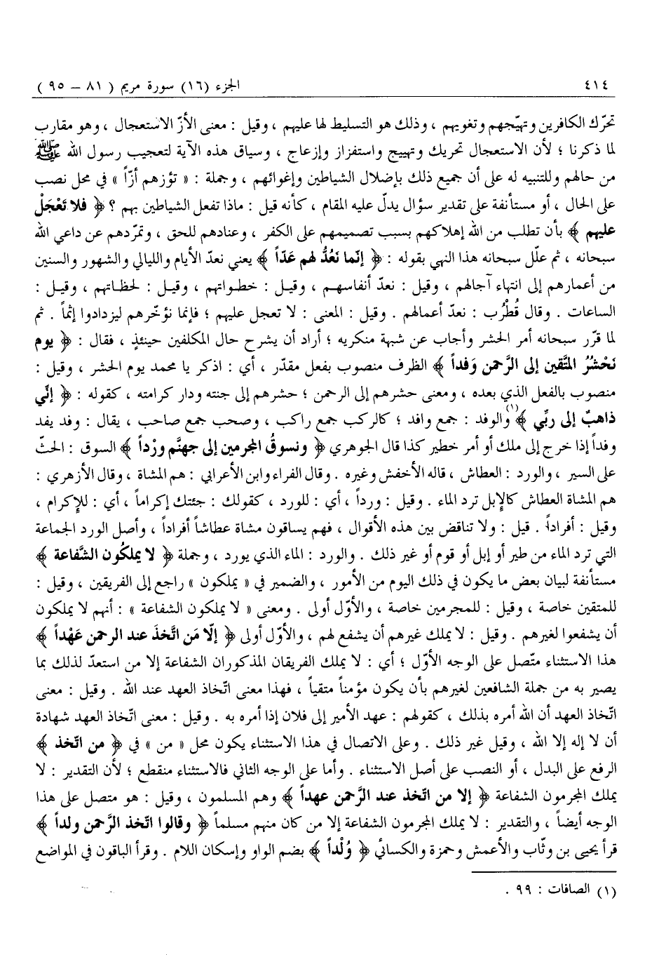 لِلْمُتَّقِينَ خَاصَّةً، وَقِيلَ: لِلْمُجْرِمِينَ خَاصَّةً، وَالْأَوَّلُ أَوْلَى. وَمَعْنَى «لَا يَمْلِكُونَ الشَّفَاعَةَ» : أَنَّهُمْ لَا يَمْلِكُونَ أَنْ يَشْفَعُوا لِغَيْرِهِمْ. وَقِيلَ: لَا يَمْلِكُ غَيْرُهُمْ أَنْ يَشْفَعَ لَهُمْ، وَالْأَوَّلُ أَوْلَى إِلَّا مَنِ اتَّخَذَ عِنْدَ الرَّحْمنِ عَهْداً هَذَا الِاسْتِثْنَاءُ مُتَّصِلٌ عَلَى الْوَجْهِ الْأَوَّلِ أَيْ: لَا يَمْلِكُ الْفَرِيقَانِ الْمَذْكُورَانِ الشَّفَاعَةَ إِلَّا مَنِ اسْتَعَدَّ لِذَلِكَ بِمَا يَصِيرُ بِهِ مِنْ جُمْلَةِ الشَّافِعِينَ لِغَيْرِهِمْ بِأَنْ يَكُونَ مُؤْمِنًا مُتَّقِيًا، فَهَذَا مَعْنَى اتِّخَاذِ الْعَهْدِ عِنْدَ اللَّهِ. وَقِيلَ: مَعْنَى اتِّخَاذِ الْعَهْدِ أَنَّ اللَّهَ أَمَرَهُ بِذَلِكَ، كَقَوْلِهِمْ: عَهِدَ الْأَمِيرُ إِلَى فُلَانٍ إِذَا أَمَرَهُ بِهِ. وَقِيلَ: مَعْنَى اتِّخَاذِ الْعَهَدِ شَهَادَةُ أَنْ لَا إِلَهَ إِلَّا اللَّهُ، وَقِيلَ غَيْرُ ذَلِكَ. وَعَلَى الِاتِّصَالِ فِي هَذَا الِاسْتِثْنَاءِ يَكُونُ مَحَلُّ «مَنْ» فِي مَنِ اتَّخَذَ الرَّفْعَ عَلَى الْبَدَلِ، أَوِ النَّصْبَ عَلَى أَصْلِ الِاسْتِثْنَاءِ. وَأَمَّا عَلَى الْوَجْهِ الثَّانِي فَالِاسْتِثْنَاءُ مُنْقَطِعٌ لِأَنَّ التَّقْدِيرَ: لَا يَمْلِكُ الْمُجْرِمُونَ الشَّفَاعَةَ إِلَّا مَنِ اتَّخَذَ عِنْدَ الرَّحْمنِ عَهْداً وَهُمُ الْمُسْلِمُونَ، وَقِيلَ: هُوَ مُتَّصِلٌ عَلَى هَذَا الْوَجْهِ أَيْضًا، وَالتَّقْدِيرُ: لَا يَمْلِكُ الْمُجْرِمُونَ الشَّفَاعَةَ إِلَّا مَنْ كَانَ مِنْهُمْ مُسْلِمًا وَقالُوا اتَّخَذَ الرَّحْمنُ وَلَداً قَرَأَ يَحْيَى بْنُ وَثَّابٍ وَالْأَعْمَشُ وَحَمْزَةُ وَالْكِسَائِيُّ وُلْدًا بِضَمِّ الْوَاوِ وَإِسْكَانِ اللَّامِ. وَقَرَأَ الْبَاقُونَ في المواضع