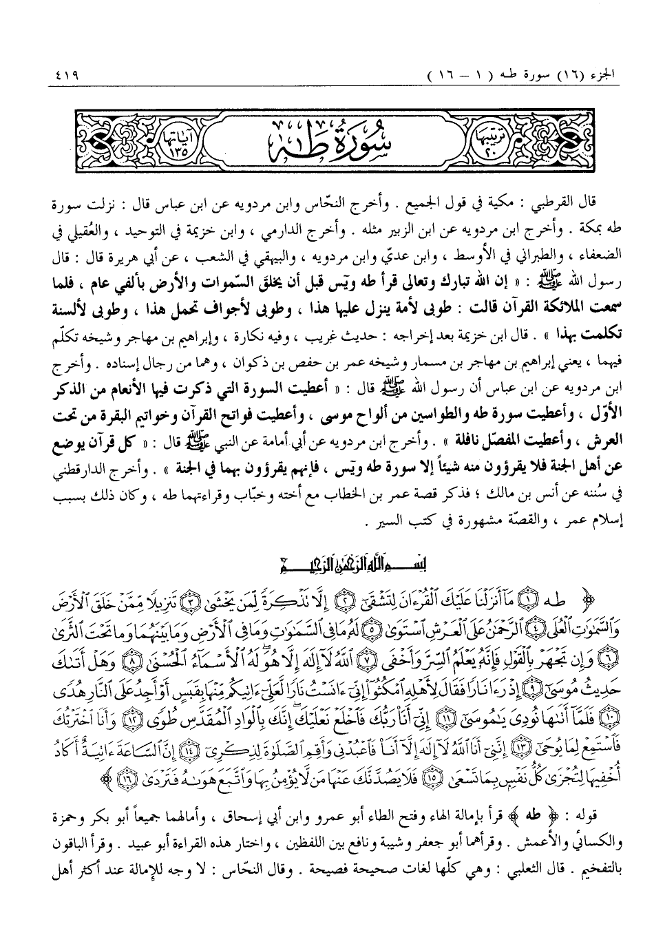قَالَ الْقُرْطُبِيُّ: مَكِّيَّةٌ فِي قَوْلِ الْجَمِيعِ. وَأَخْرَجَ النَّحَّاسُ وَابْنُ مَرْدَوَيْهِ عَنِ ابْنِ عَبَّاسٍ قَالَ: نَزَلَتْ سُورَةُ طه بِمَكَّةَ. وَأَخْرَجَ ابْنُ مَرْدَوَيْهِ عَنِ ابْنِ الزُّبَيْرِ مِثْلَهُ. وَأَخْرَجَ الدَّارِمِيُّ، وَابْنُ خُزَيْمَةَ فِي التَّوْحِيدِ، وَالْعُقَيْلِيُّ فِي الضُّعَفَاءِ، وَالطَّبَرَانِيُّ فِي الْأَوْسَطِ، وَابْنُ عَدِيٍّ وَابْنُ مَرْدَوَيْهِ، وَالْبَيْهَقِيُّ فِي الشُّعَبِ، عَنْ أَبِي هُرَيْرَةَ قَالَ: قَالَ رَسُولُ اللَّهِ صَلَّى اللَّهُ عليه وسلم: «أن اللَّهَ تَبَارَكَ وَتَعَالَى قَرَأَ طه ويس قَبْلَ أن يخلق السّموات وَالْأَرْضَ بِأَلْفَيْ عَامٍ، فَلَمَّا سَمِعَتِ الْمَلَائِكَةُ الْقُرْآنَ قَالَتْ: طُوبَى لِأُمَّةٍ يَنْزِلُ عَلَيْهَا هَذَا، وَطُوبَى لِأَجْوَافٍ تَحْمِلُ هَذَا، وَطُوبَى لِأَلْسِنَةٍ تَكَلَّمَتْ بِهَذَا» . قَالَ ابْنُ خُزَيْمَةَ بَعْدَ إِخْرَاجِهِ: حَدِيثٌ غَرِيبٌ، وَفِيهِ نَكَارَةٌ، وَإِبْرَاهِيمُ بْنُ مُهَاجِرٍ وَشَيْخُهُ تُكُلِّمَ فيهما، يعني إبراهيم بن مهاجر بن مسمار وَشَيْخَهُ عُمَرَ بْنَ حَفْصِ بْنِ ذَكْوَانَ، وَهُمَا مِنْ رِجَالِ إِسْنَادِهِ. وَأَخْرَجَ ابْنُ مَرْدَوَيْهِ عَنِ ابْنِ عَبَّاسٍ أَنَّ رَسُولَ اللَّهِ صَلَّى اللَّهُ عليه وَسَلَّمَ قَالَ: «أُعْطِيتُ السُّورَةَ الَّتِي ذُكِرَتْ فِيهَا الْأَنْعَامُ مِنَ الذِّكْرِ الْأَوَّلِ، وَأُعْطِيتُ سُورَةَ طه وَالطَّوَاسِينَ مِنْ أَلْوَاحِ مُوسَى، وَأُعْطِيتُ فَوَاتِحَ الْقُرْآنِ وَخَوَاتِيمَ الْبَقَرَةِ مِنْ تَحْتِ الْعَرْشِ، وَأُعْطِيتُ الْمُفَصَّلَ نَافِلَةً» . وَأَخْرَجَ ابْنُ مَرْدَوَيْهِ عَنْ أَبِي أُمَامَةَ عَنِ النَّبِيِّ صَلَّى اللَّهُ عَلَيْهِ وَسَلَّمَ قَالَ: «كُلُّ قُرْآنٍ يُوضَعُ عَنْ أَهْلِ الْجَنَّةِ فَلَا يَقْرَءُونَ مِنْهُ شَيْئًا إِلَّا سُورَةَ طَه وَيَس، فَإِنَّهُمْ يَقْرَءُونَ بِهِمَا فِي الْجَنَّةِ» . وَأَخْرَجَ الدَّارَقُطْنِيُّ فِي سُنَنِهِ عَنْ أَنَسِ بْنِ مَالِكٍ فَذَكَرَ قِصَّةَ عُمَرَ بْنَ الْخَطَّابِ مَعَ أُخْتِهِ وَخَبَّابٌ وَقِرَاءَتُهُمَا طه، وَكَانَ ذَلِكَ بِسَبَبِ إِسْلَامِ عُمَرَ، وَالْقِصَّةُ مَشْهُورَةٌ فِي كُتُبِ السِّيَرِ.