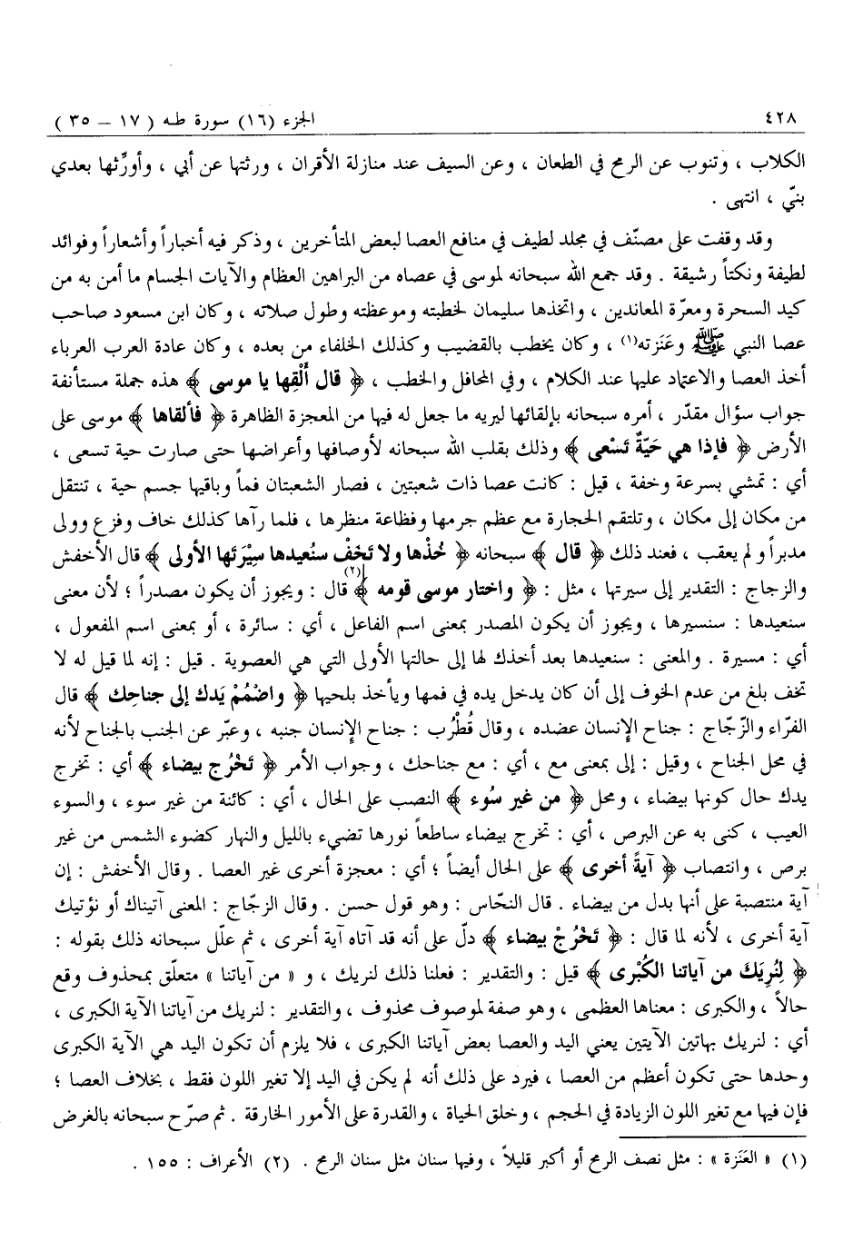 وَقَدْ وَقَفْتُ عَلَى مُصَنَّفٍ فِي مُجَلَّدٍ لَطِيفٍ فِي مَنَافِعِ الْعَصَا لِبَعْضِ الْمُتَأَخِّرِينَ، وَذَكَرَ فِيهِ أَخْبَارًا وَأَشْعَارًا وَفَوَائِدَ لَطِيفَةً وَنُكَتًا رَشِيقَةً. وَقَدْ جَمَعَ اللَّهُ سُبْحَانَهُ لِمُوسَى فِي عَصَاهُ مِنَ الْبَرَاهِينِ الْعِظَامِ وَالْآيَاتِ الْجِسَامِ مَا أُمِّنَ بِهِ مِنْ كَيْدِ السَّحَرَةِ وَمَعَرَّةِ الْمُعَانِدِينَ، وَاتَّخَذَهَا سُلَيْمَانُ لِخُطْبَتِهِ وَمَوْعِظَتِهِ وَطُولِ صَلَاتِهِ، وَكَانَ ابْنُ مَسْعُودٍ صَاحِبَ عَصَا النَّبِيِّ صلّى الله عليه وَسَلَّمَ وَعَنَزَتِهِ «1» ، وَكَانَ يَخْطُبُ بِالْقَضِيبِ وَكَذَلِكَ الْخُلَفَاءُ مِنْ بَعْدِهِ، وَكَانَ عَادَةُ الْعَرَبِ الْعُرْبَاءِ أَخْذُ الْعَصَا وَالِاعْتِمَادُ عَلَيْهَا عِنْدَ الْكَلَامِ، وَفِي الْمَحَافِلِ وَالْخُطَبِ، قالَ أَلْقِها يَا مُوسى هَذِهِ جُمْلَةٌ مُسْتَأْنَفَةٌ جَوَابُ سُؤَالٍ مُقَدَّرٍ، أَمَرَهُ سُبْحَانَهُ بِإِلْقَائِهَا لِيُرِيَهُ مَا جَعَلَ لَهُ فِيهَا مِنَ الْمُعْجِزَةِ الظَّاهِرَةِ فَأَلْقاها مُوسَى عَلَى الْأَرْضِ فَإِذا هِيَ حَيَّةٌ تَسْعى وَذَلِكَ بِقَلْبِ اللَّهِ سُبْحَانَهُ لِأَوْصَافِهَا وَأَعْرَاضِهَا حَتَّى صَارَتْ حَيَّةً تَسْعَى، أَيْ: تَمْشِي بِسُرْعَةٍ وَخِفَّةٍ، قِيلَ: كَانَتْ عَصًا ذَاتَ شُعْبَتَيْنِ، فَصَارَ الشُّعْبَتَانِ فَمًا وَبَاقِيهَا جِسْمَ حَيَّةٍ، تَنْتَقِلُ مِنْ مَكَانٍ إِلَى مَكَانٍ، وَتَلْتَقِمُ الْحِجَارَةَ مَعَ عِظَمِ جُرْمِهَا وَفَظَاعَةِ مَنْظَرِهَا، فَلَمَّا رَآهَا كَذَلِكَ خَافَ وَفَزِعَ وَوَلَّى مُدْبِرًا وَلَمْ يُعَقِّبْ، فَعِنْدَ ذَلِكَ قالَ سُبْحَانَهُ خُذْها وَلا تَخَفْ سَنُعِيدُها سِيرَتَهَا الْأُولى قَالَ الْأَخْفَشُ وَالزَّجَّاجُ: التَّقْدِيرُ إِلَى سيرتها، مثل: وَاخْتارَ مُوسى قَوْمَهُ «2» قَالَ: وَيَجُوزُ أَنْ يَكُونَ مَصْدَرًا لِأَنَّ مَعْنًى سَنُعِيدُهَا: سَنُسَيِّرُهَا، وَيَجُوزُ أَنْ يَكُونَ الْمَصْدَرُ بِمَعْنَى اسْمِ الْفَاعِلِ، أَيْ: سَائِرَةً، أَوْ بِمَعْنَى اسْمِ الْمَفْعُولِ، أَيْ: مُسَيَّرَةً. وَالْمَعْنَى: سَنُعِيدُهَا بَعْدَ أَخْذِكَ لَهَا إِلَى حَالَتِهَا الْأُولَى الَّتِي هِيَ الْعَصَوِيَّةُ. قِيلَ: إِنَّهُ لَمَّا قِيلَ لَهُ لَا تَخَفْ بَلَغَ مِنْ عَدَمِ الْخَوْفِ إِلَى أَنْ كَانَ يُدْخِلُ يَدَهُ فِي فَمِهَا وَيَأْخُذُ بِلَحْيِهَا وَاضْمُمْ يَدَكَ إِلى جَناحِكَ قَالَ الْفَرَّاءُ وَالزَّجَّاجُ: جَنَاحُ الْإِنْسَانِ عَضُدُهُ، وَقَالَ قُطْرُبٌ: جَنَاحُ الْإِنْسَانِ جَنْبُهُ، وَعَبَّرَ عَنِ الْجَنْبِ بِالْجَنَاحِ لِأَنَّهُ فِي مَحَلِّ الْجَنَاحِ، وَقِيلَ: إِلَى بِمَعْنَى مَعَ، أَيْ: مَعَ جَنَاحِكِ، وَجَوَابُ الْأَمْرِ تَخْرُجْ بَيْضاءَ أَيْ: تَخْرُجُ يَدُكَ حَالَ كَوْنِهَا بَيْضَاءَ، وَمَحَلُّ مِنْ غَيْرِ سُوءٍ النَّصْبُ عَلَى الْحَالِ، أَيْ: كَائِنَةً مِنْ غَيْرِ سُوءٍ، وَالسُّوءُ الْعَيْبُ، كَنَّى بِهِ عَنِ الْبَرَصِ، أَيْ: تَخْرُجُ بَيْضَاءَ سَاطِعًا نُورُهَا تُضِيءُ بِاللَّيْلِ وَالنَّهَارِ كَضَوْءِ الشَّمْسِ مِنْ غَيْرِ بَرَصٍ، وَانْتِصَابُ آيَةً أُخْرى عَلَى الْحَالِ أَيْضًا أَيْ: مُعْجِزَةً أُخْرَى غَيْرَ الْعَصَا. وَقَالَ الْأَخْفَشُ: إِنَّ آيَةً مُنْتَصِبَةً عَلَى أَنَّهَا بَدَلٌ مِنْ بَيْضَاءَ. قَالَ النَّحَّاسُ: وَهُوَ قَوْلٌ حَسَنٌ. وَقَالَ الزَّجَّاجُ: الْمَعْنَى آتَيْنَاكَ أَوْ نُؤْتِيكَ آيَةً أُخْرَى، لِأَنَّهُ لَمَّا قَالَ: تَخْرُجْ بَيْضاءَ دَلَّ عَلَى أَنَّهُ قَدْ آتَاهُ آيَةً أُخْرَى، ثُمَّ عَلَّلَ سُبْحَانَهُ ذَلِكَ بِقَوْلِهِ: