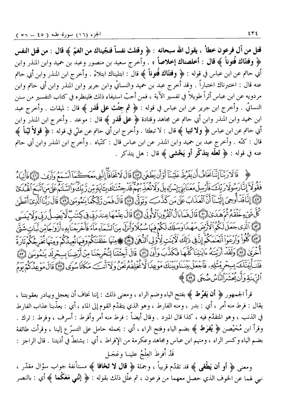 قَتَلَ مِنْ آلِ فِرْعَوْنَ خَطَأً، يَقُولُ اللَّهُ سُبْحَانَهُ: وَقَتَلْتَ نَفْساً فَنَجَّيْناكَ مِنَ الْغَمِّ قَالَ: مِنْ قَتْلِ النَّفْسِ وَفَتَنَّاكَ فُتُوناً قَالَ: أَخْلَصْنَاكَ إِخْلَاصًا» . وَأَخْرَجَ سَعِيدُ بْنُ مَنْصُورٍ وَعَبْدُ بْنُ حُمَيْدٍ وَابْنُ الْمُنْذِرِ وَابْنُ أَبِي حَاتِمٍ عَنِ ابْنِ عَبَّاسٍ فِي قَوْلِهِ: وَفَتَنَّاكَ فُتُوناً قَالَ: ابْتَلَيْنَاكَ ابْتِلَاءً. وَأَخْرَجَ ابْنُ الْمُنْذِرِ وَابْنُ أَبِي حَاتِمٍ عَنْهُ قَالَ: اخْتَبَرْنَاكَ اخْتِبَارًا. وَقَدْ أَخْرَجَ عَبْدُ بْنُ حُمَيْدٍ وَالنَّسَائِيُّ وَابْنُ جَرِيرٍ وَابْنُ الْمُنْذِرِ وَابْنُ أَبِي حَاتِمٍ وَابْنُ مَرْدَوَيْهِ عَنِ ابْنِ عَبَّاسٍ أَثَرًا طَوِيلًا فِي تَفْسِيرِ الْآيَةِ، فَمَنْ أَحَبَّ اسْتِيفَاءَ ذَلِكَ فَلْيَنْظُرْهُ فِي كِتَابِ التَّفْسِيرِ مِنْ سُنَنِ النَّسَائِيِّ. وَأَخْرَجَ ابْنُ جَرِيرٍ عَنِ ابْنِ عَبَّاسٍ فِي قَوْلِهِ: ثُمَّ جِئْتَ عَلى قَدَرٍ قال: لميقات. وأخرج عبد ابن حُمَيْدٍ وَابْنُ الْمُنْذِرِ وَابْنُ أَبِي حَاتِمٍ عَنْ مُجَاهِدٍ وَقَتَادَةَ عَلى قَدَرٍ قَالَ: مَوْعِدٍ. وَأَخْرَجَ ابْنُ الْمُنْذِرِ وَابْنُ أَبِي حَاتِمٍ عَنِ ابن عَبَّاسٍ وَلا تَنِيا قَالَ: لَا تُبْطِئَا. وَأَخْرَجَ ابْنُ أَبِي حَاتِمٍ عَنْ عَلِيٍّ فِي قَوْلِهِ: قَوْلًا لَيِّناً قَالَ: كَنَّهُ. وَأَخْرَجَ عَبْدُ بْنُ حُمَيْدٍ وَابْنُ الْمُنْذِرِ عَنْ ابْنِ عَبَّاسٍ قَالَ: كَنَّيَاهُ. وَأَخْرَجَ ابْنُ الْمُنْذِرِ وَابْنُ أَبِي حَاتِمٍ عَنْهُ فِي قَوْلِهِ: لَعَلَّهُ يَتَذَكَّرُ أَوْ يَخْشى قال: هل يتذكر.