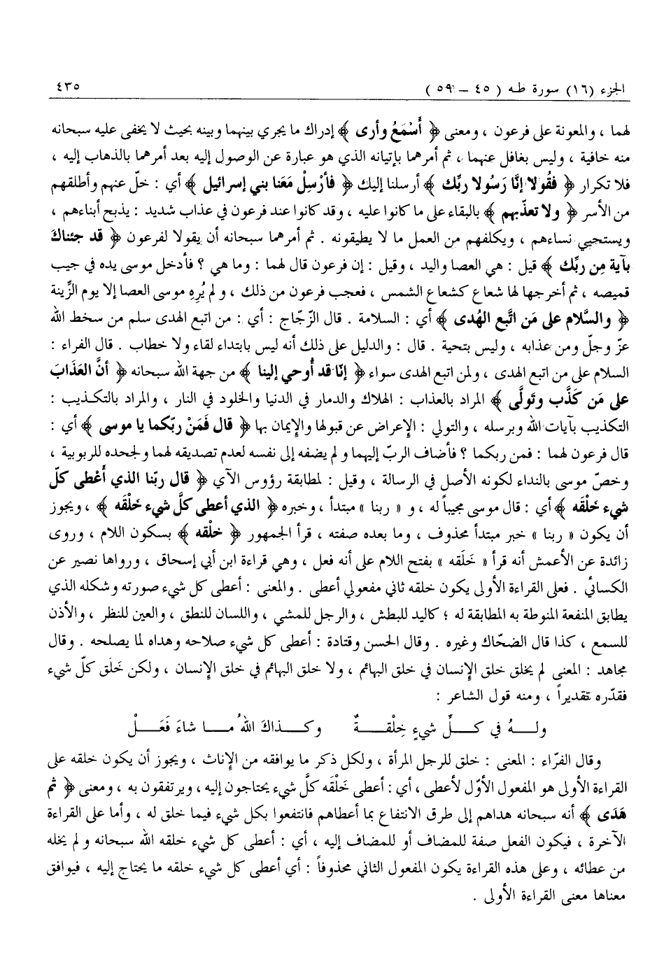 قَالَ فِرْعَوْنُ لَهُمَا: فَمَنْ رَبُّكُمَا؟ فَأَضَافَ الرَّبَّ إِلَيْهِمَا وَلَمْ يُضِفْهُ إِلَى نَفْسِهِ لِعَدَمِ تَصْدِيقِهِ لَهُمَا وَلِجَحْدِهِ لِلرُّبُوبِيَّةِ، وَخَصَّ مُوسَى بِالنِّدَاءِ لكونه الأصل في الرسالة، وقيل: لمطابقة رؤوس الْآيِ قالَ رَبُّنَا الَّذِي أَعْطى كُلَّ شَيْءٍ خَلْقَهُ أي: قال موسى مجيبا له، و «ربنا» مُبْتَدَأٌ، وَخَبَرُهُ الَّذِي أَعْطى كُلَّ شَيْءٍ خَلْقَهُ، وَيَجُوزُ أَنْ يَكُونَ «رَبُّنَا» خَبَرَ مُبْتَدَأٍ مَحْذُوفٍ، وَمَا بَعْدَهُ صِفَتَهُ، قَرَأَ الْجُمْهُورُ خَلْقَهُ بِسُكُونِ اللَّامِ، وَرَوَى زَائِدَةُ عَنِ الْأَعْمَشِ أَنَّهُ قَرَأَ «خَلَقَهُ» بِفَتْحِ اللَّامِ عَلَى أَنَّهُ فِعْلٌ، وَهِيَ قِرَاءَةُ ابْنِ أَبِي إِسْحَاقَ، وَرَوَاهَا نُصَيْرٌ عَنِ الْكِسَائِيِّ. فَعَلَى الْقِرَاءَةِ الْأُولَى يَكُونُ خَلْقَهُ ثَانِيَ مَفْعُولَيْ أَعْطَى. وَالْمَعْنَى: أَعْطَى كُلَّ شَيْءٍ صُورَتَهُ وَشَكْلَهُ الَّذِي يُطَابِقُ الْمَنْفَعَةَ الْمَنُوطَةَ بِهِ الْمُطَابِقَةَ لَهُ كَالْيَدِ لِلْبَطْشِ، وَالرِّجْلِ لِلْمَشْيِ، وَاللِّسَانِ لِلنُّطْقِ، وَالْعَيْنِ لِلنَّظَرِ، وَالْأُذُنِ لِلسَّمْعِ، كَذَا قَالَ الضَّحَّاكُ وَغَيْرُهُ. وَقَالَ الْحَسَنُ وَقَتَادَةُ: أَعْطَى كُلَّ شَيْءٍ صَلَاحَهُ وَهَدَاهُ لِمَا يُصْلِحُهُ. وَقَالَ مُجَاهِدٌ: الْمَعْنَى لَمْ يَخْلُقْ خَلْقَ الْإِنْسَانِ فِي خَلْقِ الْبَهَائِمِ، وَلَا خَلَقَ الْبَهَائِمَ فِي خَلْقِ الْإِنْسَانِ، وَلَكِنْ خَلَقَ كُلَّ شَيْءٍ فَقَدَّرَهُ تَقْدِيرًا، وَمِنْهُ قَوْلُ الشَّاعِرِ: