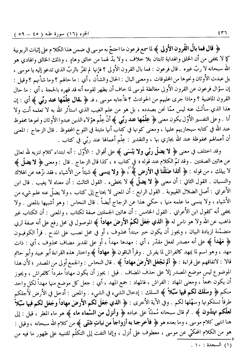 وَقَدِ اخْتُلِفَ فِي مَعْنَى لَا يَضِلُّ رَبِّي وَلا يَنْسى عَلَى أَقْوَالٍ: الْأَوَّلُ: أَنَّهُ ابْتِدَاءُ كَلَامٍ تَنْزِيهٌ لِلَّهِ تَعَالَى عَنْ هَاتَيْنِ الصِّفَتَيْنِ. وَقَدْ تَمَّ الْكَلَامُ عِنْدَ قَوْلِهِ «فِي كِتابٍ» ، كَذَا قَالَ الزَّجَّاجُ. قَالَ: وَمَعْنَى لَا يَضِلُّ لَا يهلك، من قوله: أَإِذا ضَلَلْنا فِي الْأَرْضِ «1» ، وَلا يَنْسى شَيْئًا مِنَ الْأَشْيَاءِ، فَقَدْ نَزَّهَهُ عَنِ الْهَلَاكِ وَالنِّسْيَانِ. الْقَوْلُ الثَّانِي: أَنَّ مَعْنَى لَا يَضِلُّ لَا يُخْطِئُ. الْقَوْلُ الثَّالِثُ: أَنَّ مَعْنَاهُ لَا يَغِيبُ. قَالَ ابْنُ الْأَعْرَابِيِّ: أَصْلُ الضَّلَالِ الْغَيْبُوبَةُ. الْقَوْلُ الرَّابِعُ: أَنَّ الْمَعْنَى لَا يَحْتَاجُ إِلَى كِتَابٍ، وَلَا يَضِلُّ عَنْهُ عِلْمُ شَيْءٍ مِنَ الْأَشْيَاءِ، وَلَا يَنْسَى مَا عَلِمَهُ مِنْهَا، حُكِيَ هَذَا عَنِ الزَّجَّاجِ أَيْضًا. قَالَ النَّحَّاسُ: وَهُوَ أَشْبَهُهَا بِالْمَعْنَى. وَلَا يَخْفَى أَنَّهُ كَقَوْلِ ابْنِ الْأَعْرَابِيِّ. الْقَوْلُ الْخَامِسُ: أَنَّ هَاتَيْنِ الجملتين صفة لكتاب، والمعنى: أن الكتاب غير ذاهب عن الله ولا هو نَاسٍ لَهُ الَّذِي جَعَلَ لَكُمُ الْأَرْضَ مَهْداً الْمَوْصُولُ فِي مَحَلِّ رَفْعٍ عَلَى أَنَّهُ صِفَةٌ لِرَبِّي مُتَضَمِّنَةٌ لِزِيَادَةِ الْبَيَانِ، وَيَجُوزُ أَنْ يَكُونَ خبر مبتدأ محذوف، أو في محل نصب عَلَى الْمَدْحِ. قَرَأَ الْكُوفِيُّونَ مَهْداً عَلَى أَنَّهُ مَصْدَرٌ لِفِعْلٍ مُقَدَّرٍ، أَيْ: مَهَّدَهَا مَهْدًا، أَوْ عَلَى تَقْدِيرِ مُضَافٍ مَحْذُوفٍ، أَيْ: ذَاتِ مَهْدٍ، وَهُوَ اسْمٌ لِمَا يُمَهَّدُ كَالْفِرَاشِ لِمَا يُفْرَشُ. وَقَرَأَ الْبَاقُونَ مِهَادًا وَاخْتَارَ هَذِهِ الْقِرَاءَةَ أَبُو عُبَيْدٍ وَأَبُو حَاتِمٍ قالا: لِاتِّفَاقِهِمْ عَلَى قِرَاءَةِ: أَلَمْ نَجْعَلِ الْأَرْضَ مِهاداً. قَالَ النَّحَّاسُ: وَالْجَمْعُ أَوْلَى مِنَ الْمَصْدَرِ لِأَنَّ هذا الموضوع لَيْسَ مَوْضِعَ الْمَصْدَرِ إِلَّا عَلَى حَذْفِ الْمُضَافِ. قِيلَ: يَجُوزُ أَنْ يَكُونَ مِهَادًا مُفْرَدًا كَالْفِرَاشِ، وَيَجُوزُ أَنْ يَكُونَ جَمْعًا، وَمَعْنَى الْمِهَادِ: الْفِرَاشُ، فَالْمِهَادُ: جَمْعُ الْمَهْدِ، أَيْ: جَعَلَ كُلَّ مَوْضِعٍ مِنْهَا مَهْدًا لِكُلِّ وَاحِدٍ مِنْكُمْ وَسَلَكَ لَكُمْ فِيها سُبُلًا السَّلْكُ: إِدْخَالُ الشَّيْءِ فِي الشَّيْءِ. وَالْمَعْنَى: أَدْخَلَ فِي الْأَرْضِ لِأَجْلِكُمْ طُرُقًا تَسْلُكُونَهَا وَسَهَّلَهَا لَكُمْ. وَفِي الْآيَةِ الْأُخْرَى: الَّذِي جَعَلَ لَكُمُ الْأَرْضَ مَهْداً وَجَعَلَ لَكُمْ فِيها سُبُلًا لَعَلَّكُمْ تَهْتَدُونَ. ثُمَّ قَالَ سُبْحَانَهُ مُمْتَنًّا عَلَى عِبَادِهِ وَأَنْزَلَ مِنَ السَّماءِ مَاءً هُوَ مَاءُ الْمَطَرِ، قِيلَ: إِلَى هُنَا انْتَهَى كَلَامُ مُوسَى، وَمَا بَعْدَهُ هُوَ فَأَخْرَجْنا بِهِ أَزْواجاً مِنْ نَباتٍ شَتَّى مِنْ كَلَامِ اللَّهِ سُبْحَانَهُ، وَقِيلَ: